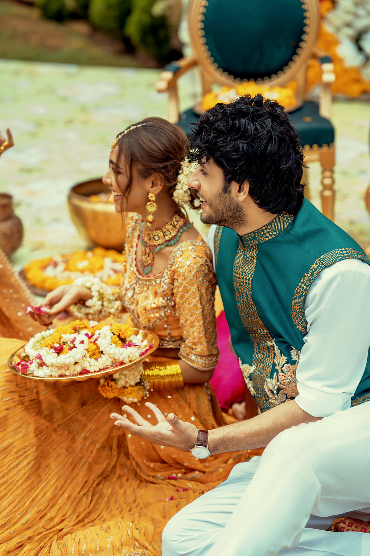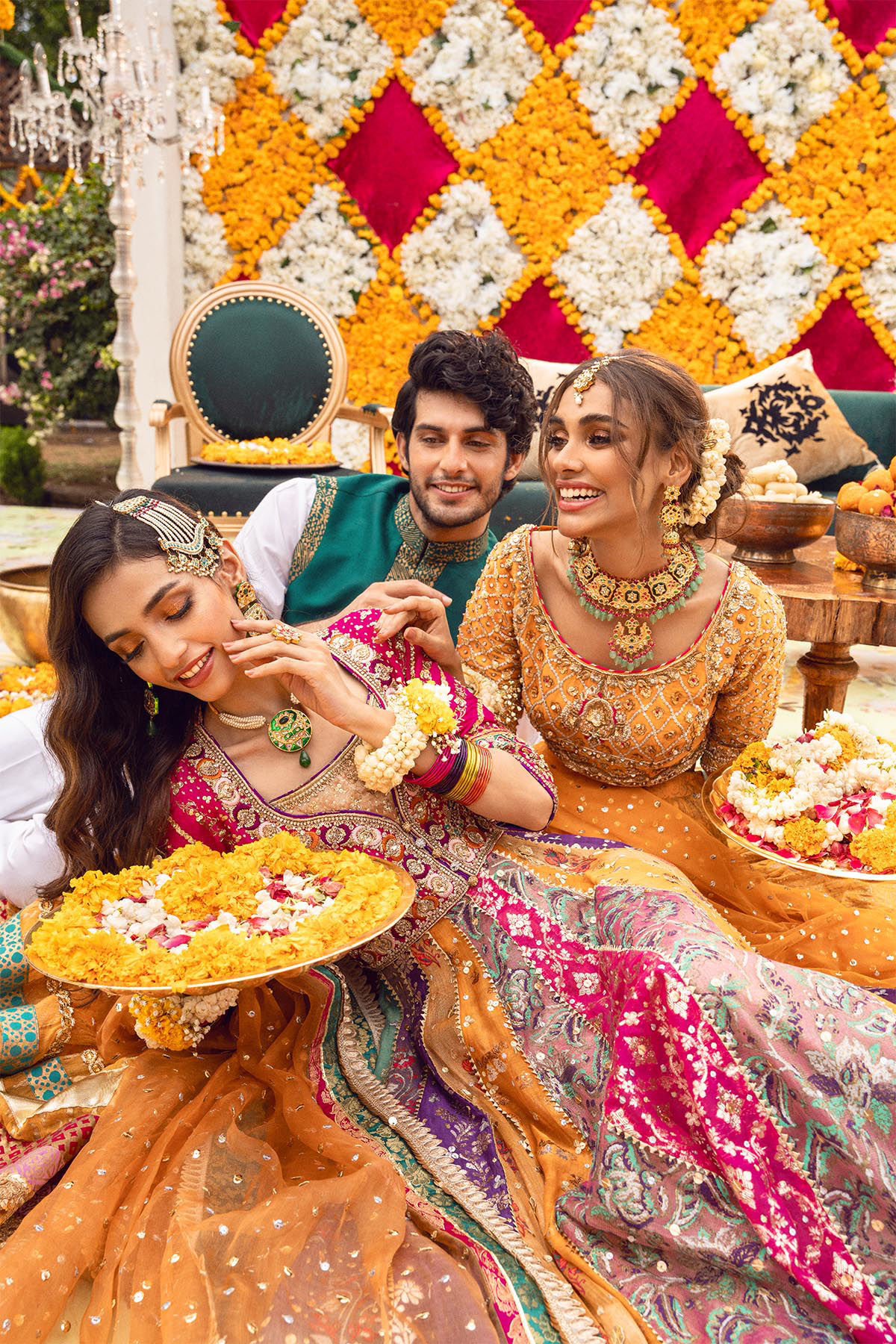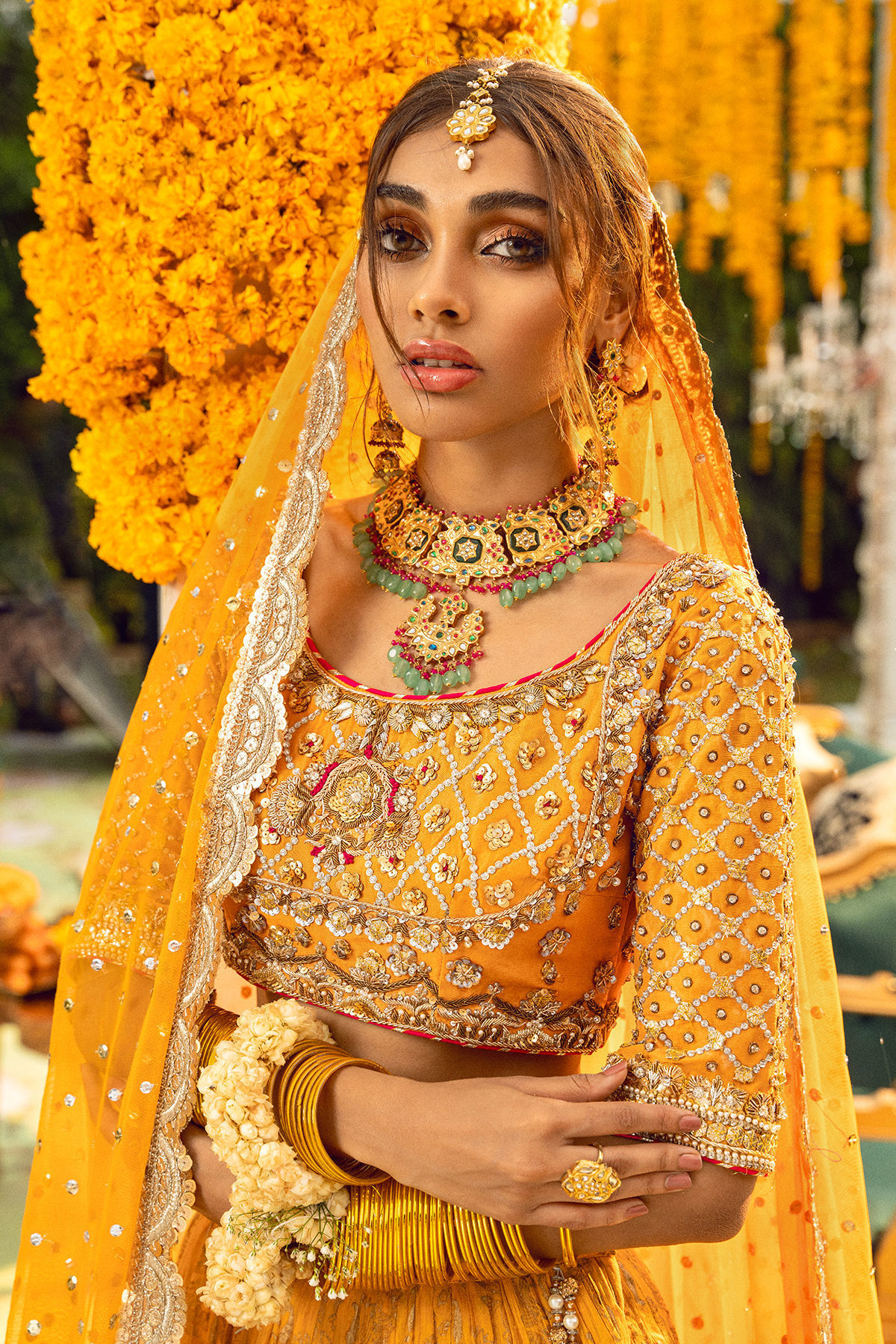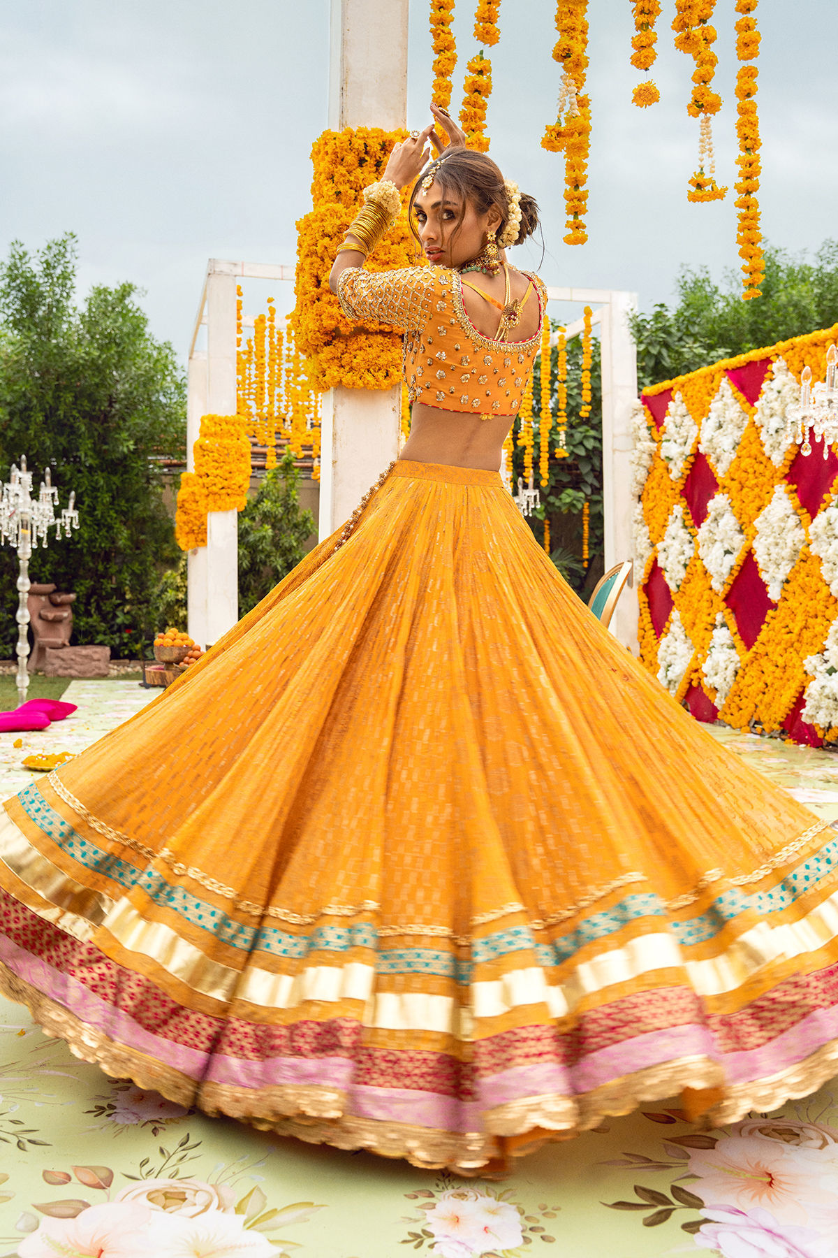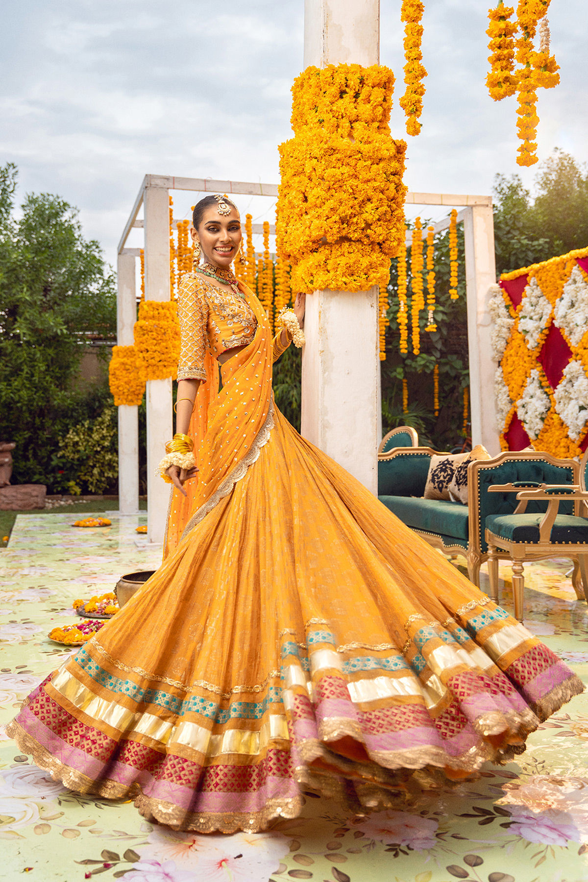 Gorgeous shade of Marigolds enhanced different with hand block printed patterns on crushed chiffon canvas, the hemline of lehnga is enhanced with contrasting finishing’s, gota, lace details and handcrafted tassels. The choli is made on pure raw silk canvas featuring zardozi details. The outfit is paired with net dupatta featuring light catching sequins and lace finishing’s.