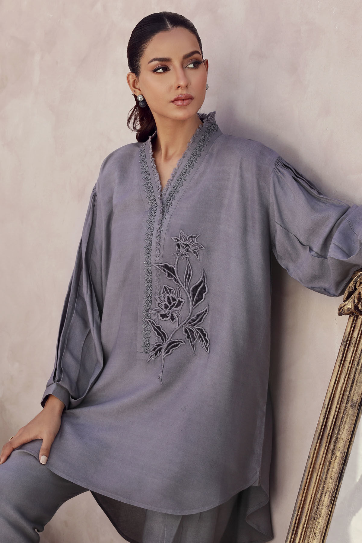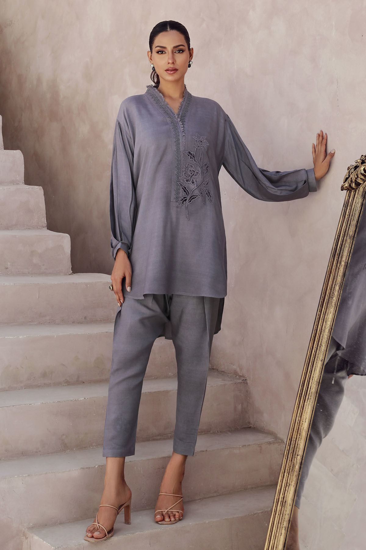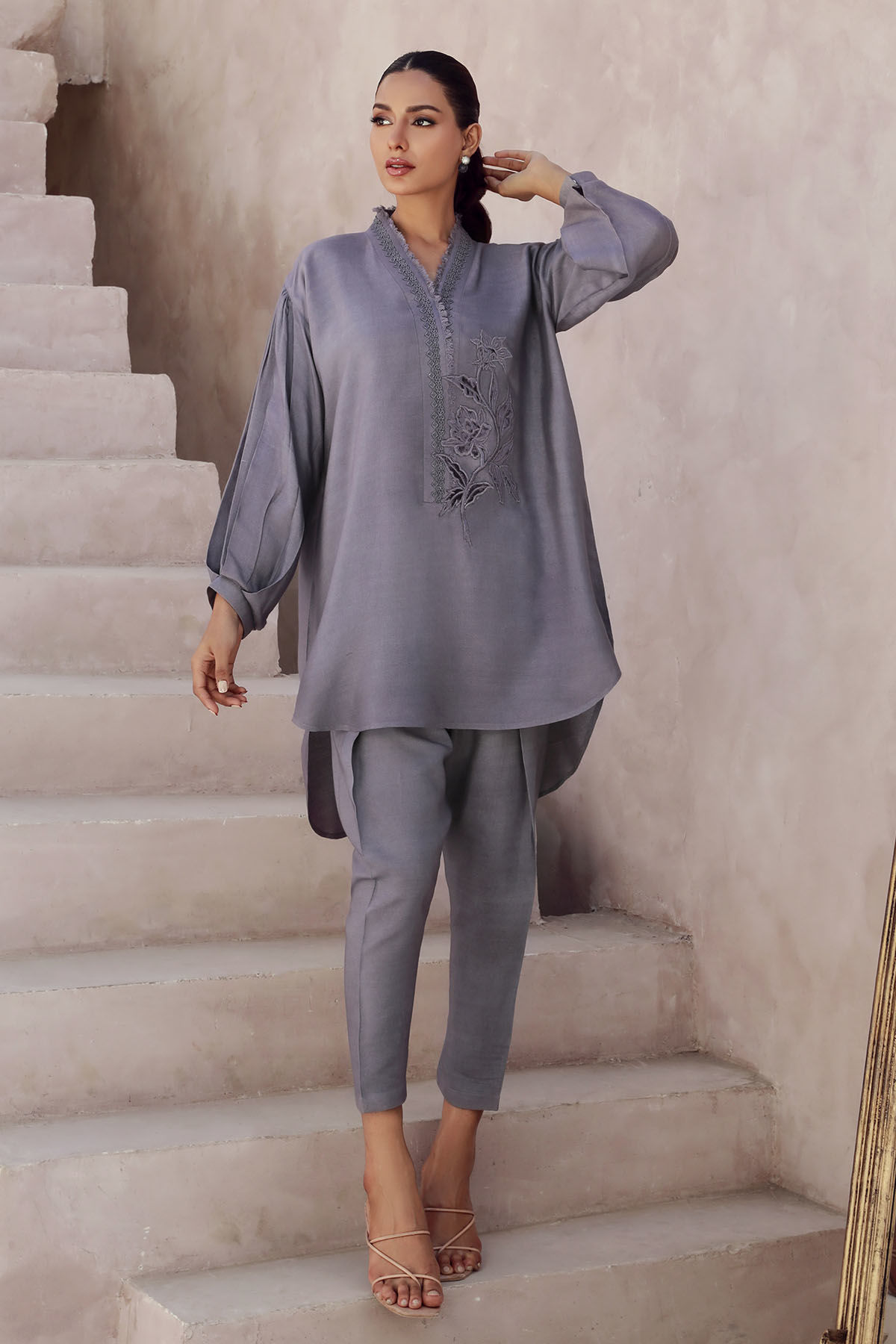 High low co-ord in oversized silhouette featuring velvet appliqué motifs on center front, the neckline is enhanced with lace and fringe details. The top is paired with matching shalwar for a sleeker look.