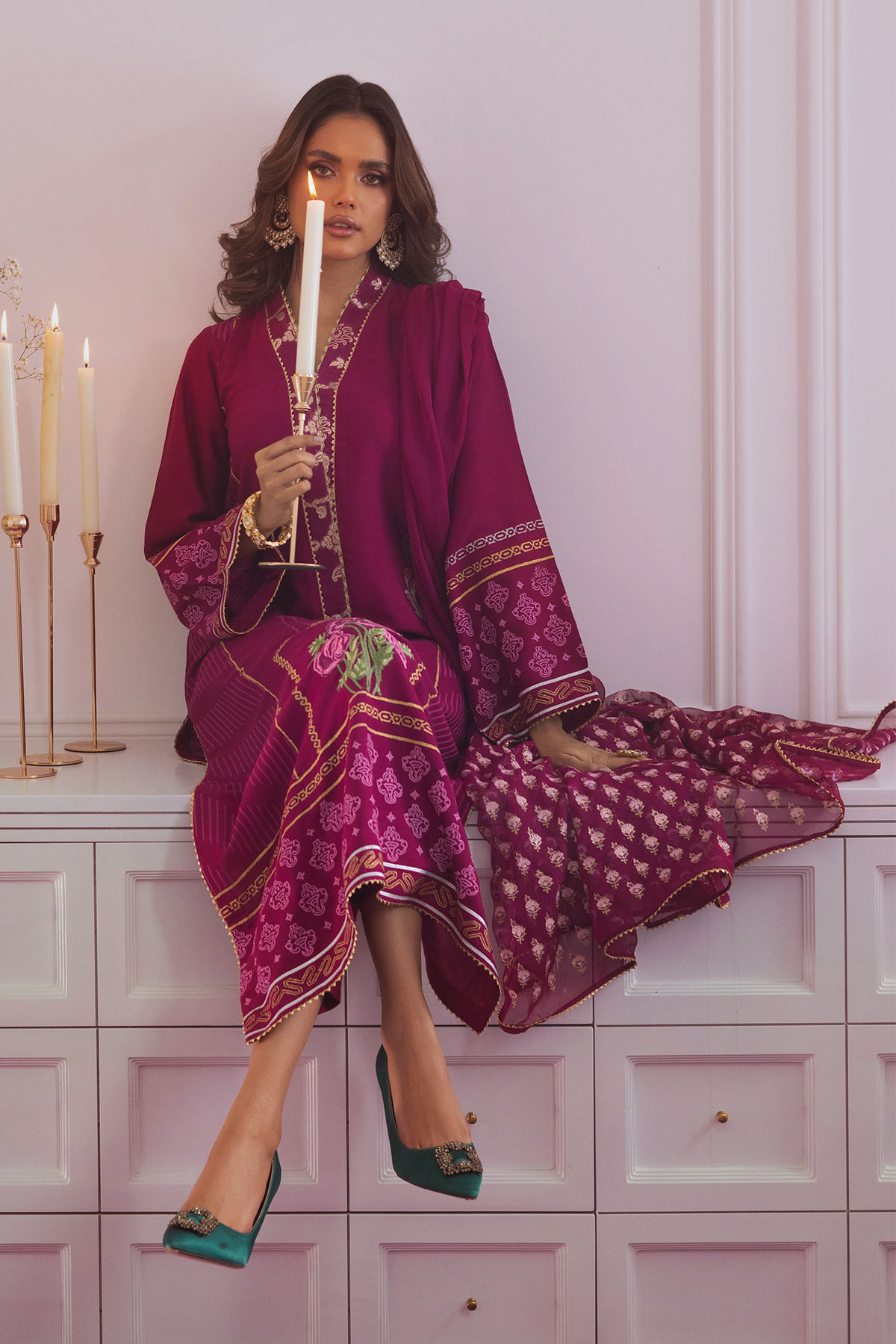 Long silhouette cotton net shirt in exquisite deep cranberry canvas, showcasing hand block printed embellishments in gold and self. The center front is embellished with delicately embroidered rosette details, while the neckline is meticulously designed with shimmering lorex and gota edging. The ensemble is complemented by straight pants and a chiffon dupatta, which features block printed details on each pallu, elegantly finished with gota accents.