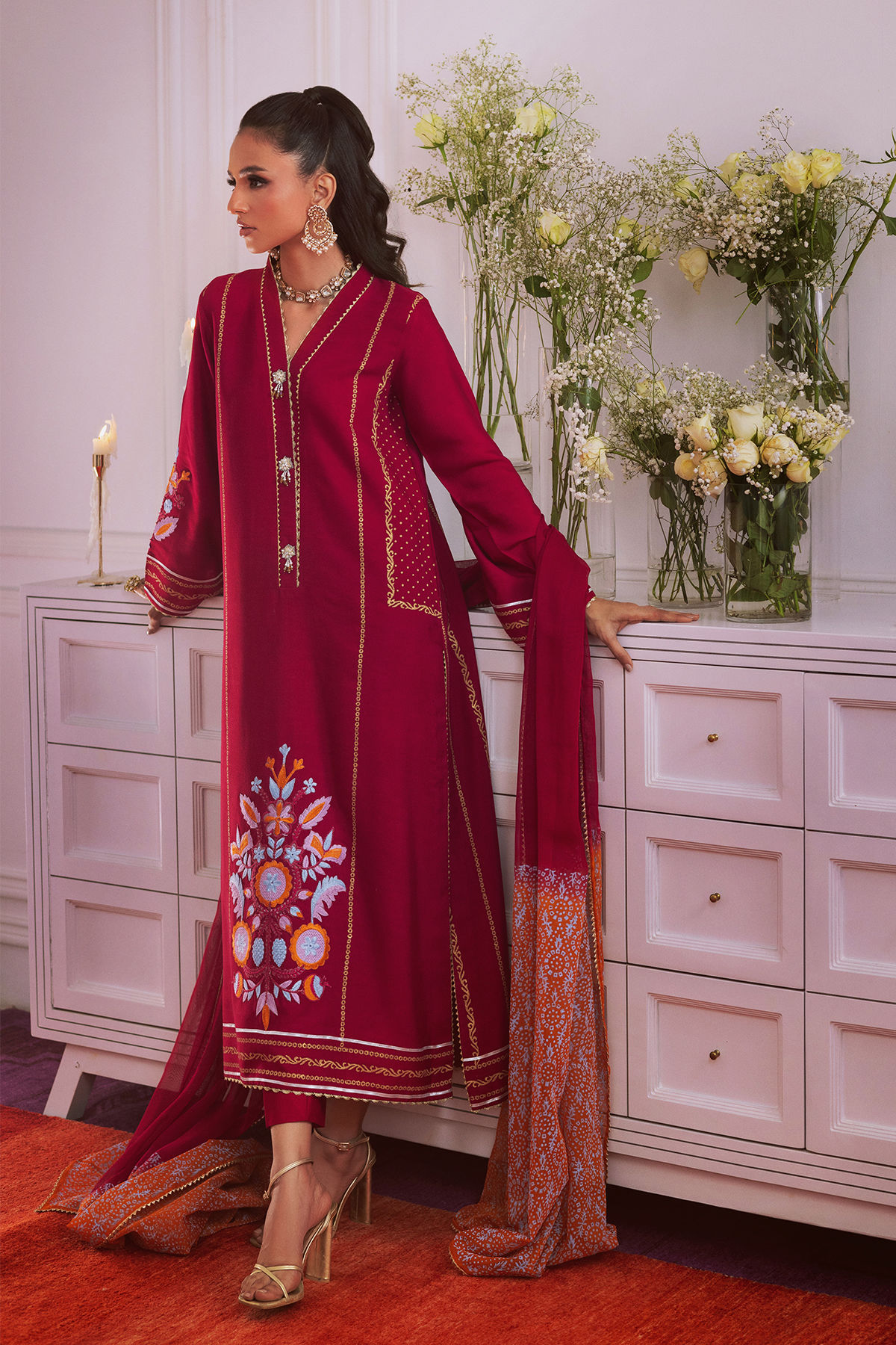 Long silhouette shirt crafted from deep scarlet cotton net canvas, showcasing subtle hand block details in gold. The center front is embellished with embroidered motif details, while the neckline is enhanced with gota edgings and intricately handcrafted tassels. The ensemble is complemented by straight pants and a chiffon dupatta, elegantly dyed in a rust and scarlet ombré, which is further adorned with block printed details in gold and finished with gota kingri embellishments.