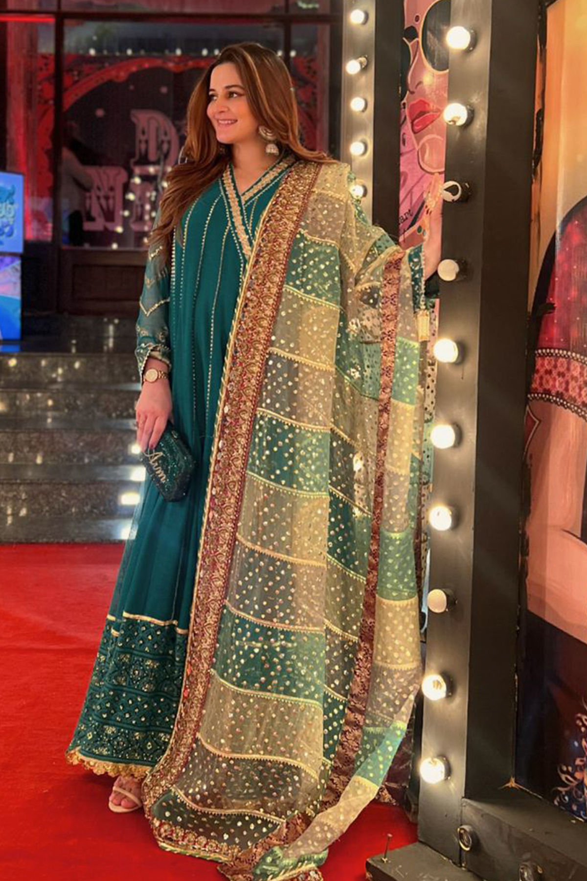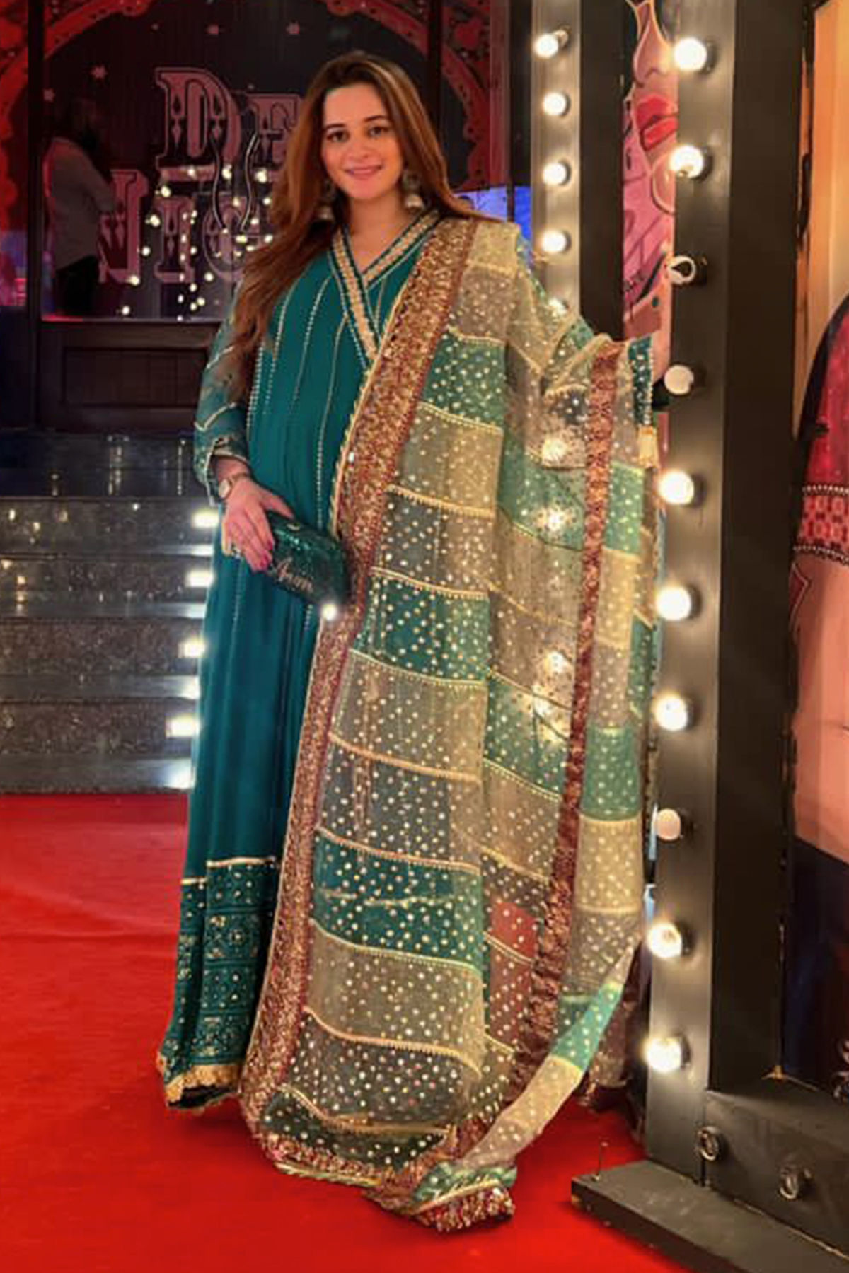 Floor length Kalidar in a stunning shade of deep green featuring chikankari panel on hemline adorned with block printed and zardozi details on sleeves. The centre back and sleeves are adorned with handcrafted tassel. The kalidar can be paired with colour blocked organza dupatta with intricate zardozi and sheesha embroidery. The outfit is paired with raw silk straight pants.