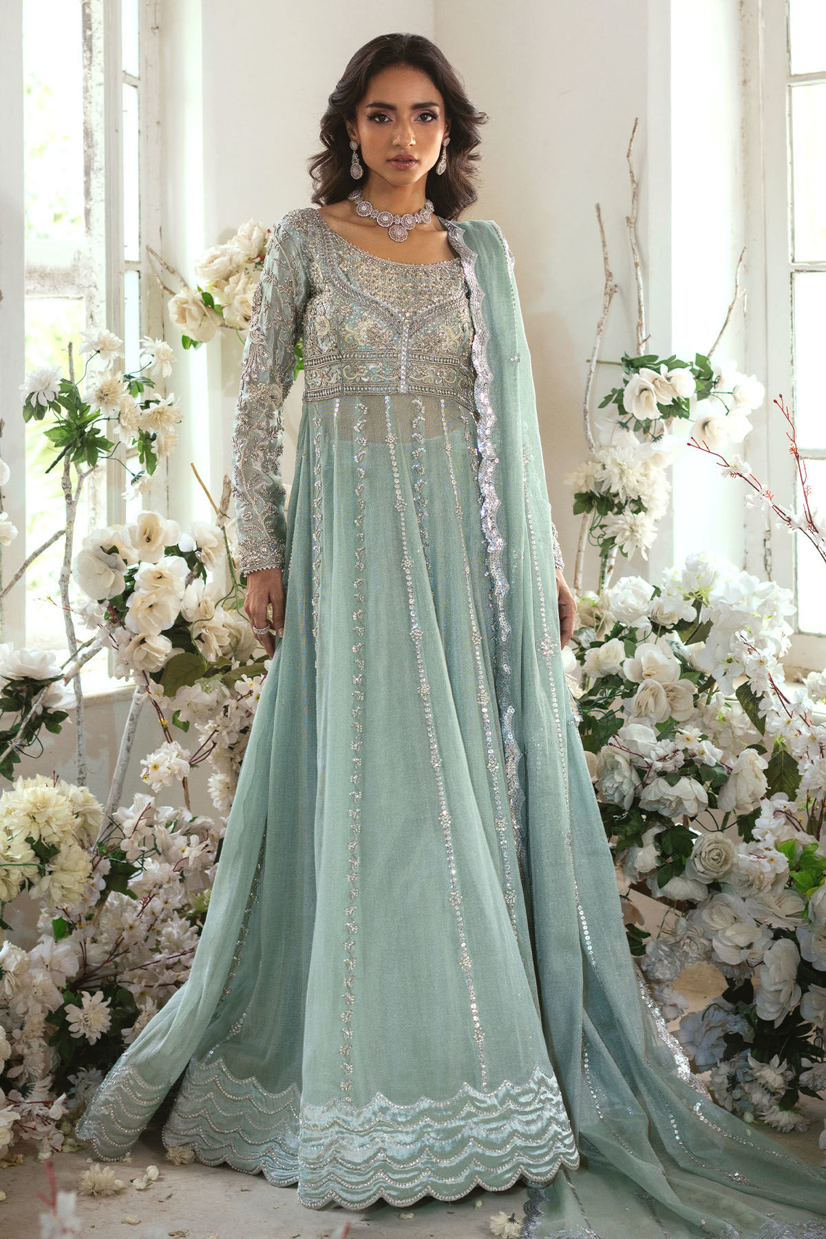 Floor-length pishwas crafted from shimmering net zari canvas in a stunning ice blue hue, embellished with intricate zardozi details in silver on the bodice and sleeves. The hem is elegantly adorned with scalloped accents. The centre back features handcrafted tassels for enhanced appeal. This pishwas is complemented by two-legged damask dhaka and a matching dupatta, which showcases delicately placed sequins that catch the light beautifully.