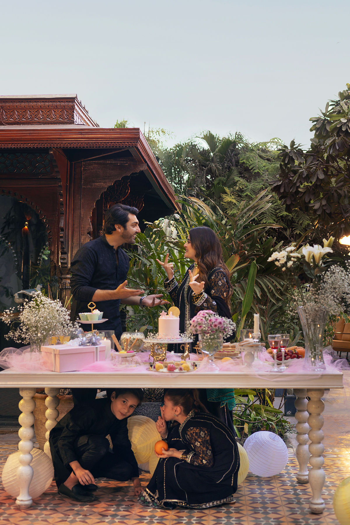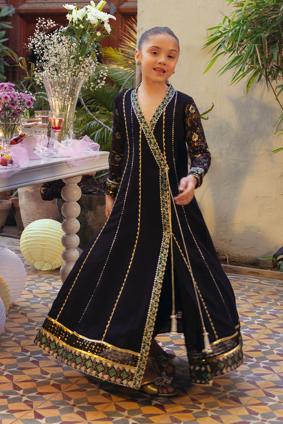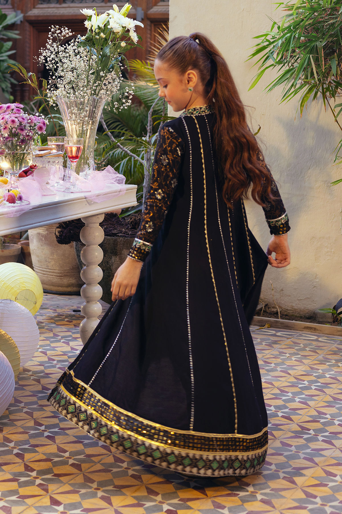 A floor-length paneled angharka in rich black, featuring interlinked gota panels. The hem showcases hand block printed designs along with a sparkling sequins border. The center front is highlighted with artisanal tassels, and the ensemble is complete with coordinating straight pants.