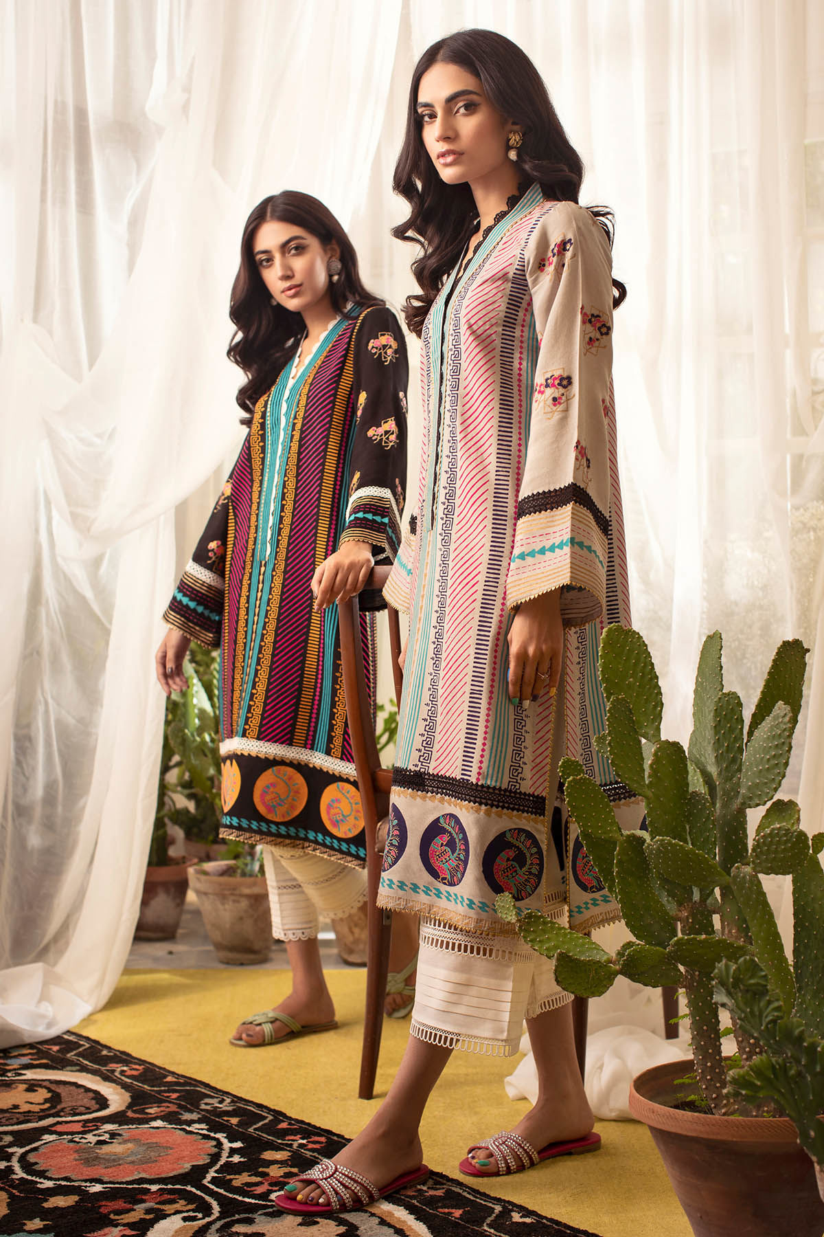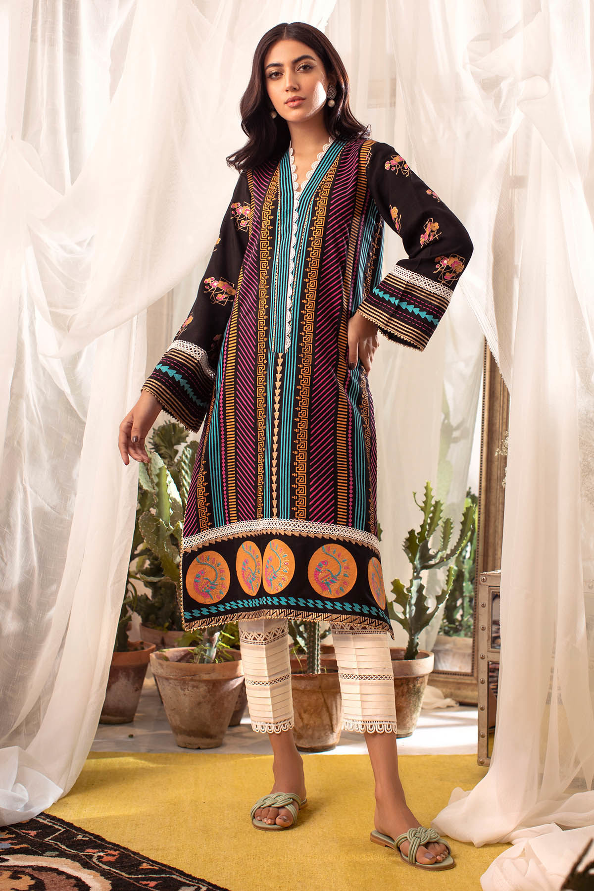 Long silhouette block printed shirt with geometric block printed details in contrasting colors, the neckline is adorned with crochet laces and gota.