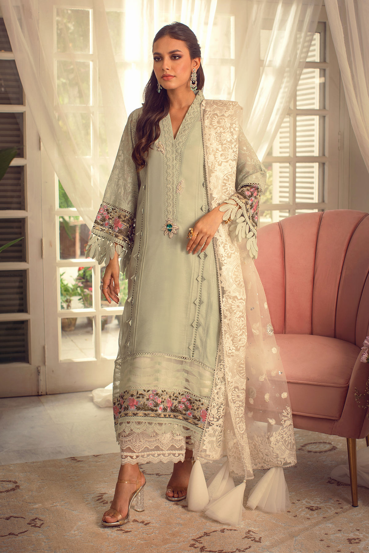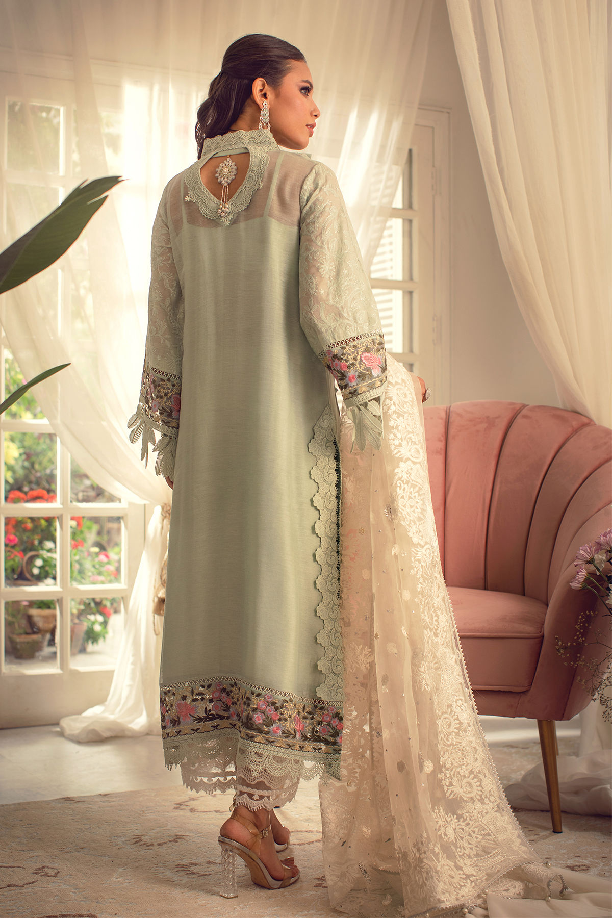 Long silhouette silk net shirt on subtle pastel teal canvas featuring fabric manipulation details on centre front, the hemline is adorned with embroidered organza and the centre front and centre back is enhanced with handcrafted tassels. The shirt is paired with raw silk Nury izaar featuring fabric manipulation details enhanced with embroidered organza and lace details. The shirt is paired with Pariza dupatta on pure embroidered organza featuring gota rosettes, sequins and pearls. The dupatta is further adorned with net tassels on each pallu.