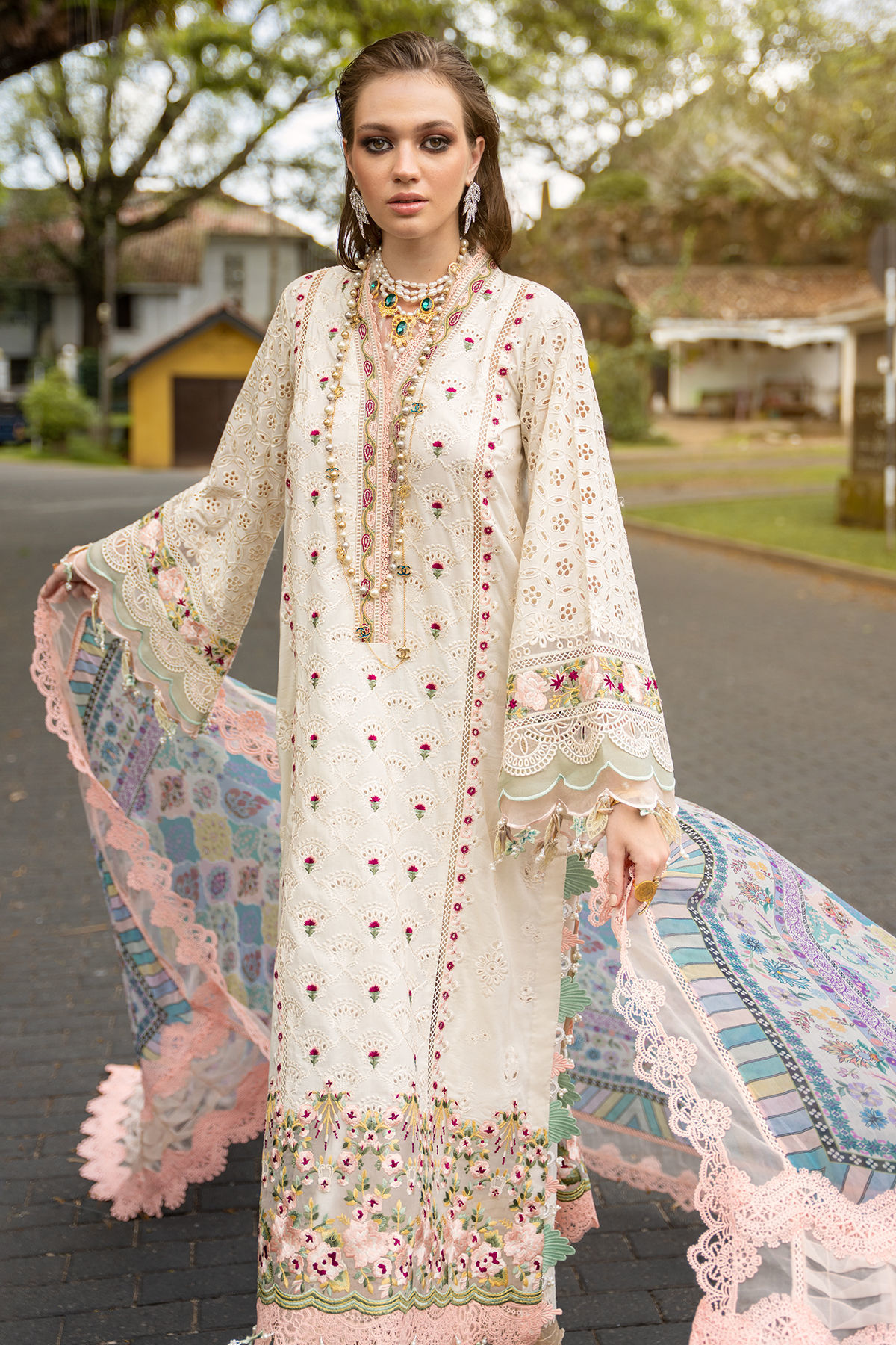 Showcasing a surreal symphony, 'Amal' features subtle minimalism on a dreamy powder pink canvas, the centre front showcases intricate schiffli details. The sheer organza panel on hem with bold silk thread floral details and scalloped embossed borders add an artistic finesse to the ensemble. Bold composed dupatta with floral and geometric details is sure to set you apart this summer season.