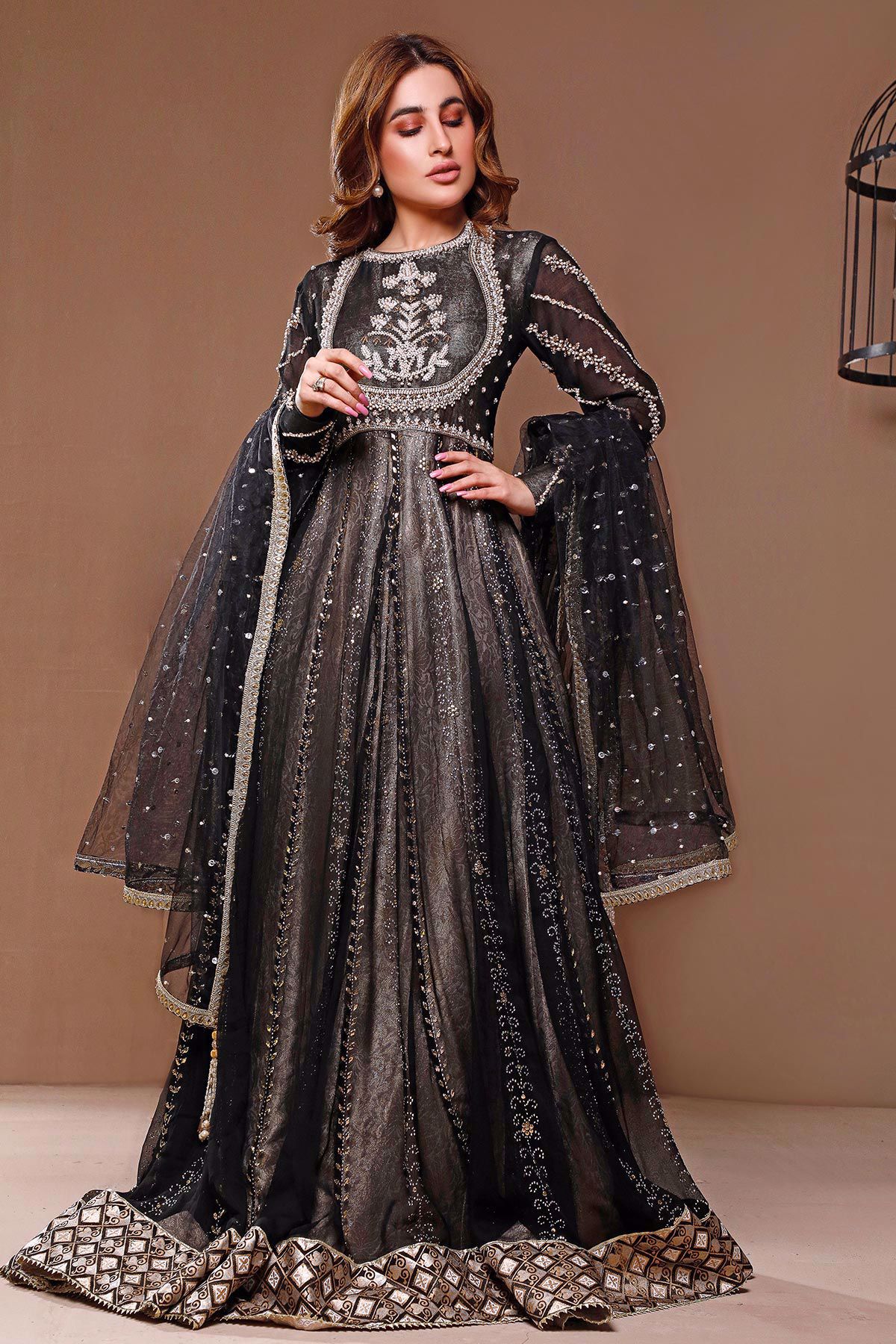 Stunning black chiffon pishwas featuring pearls, antique dabka and lots of shimmering crystals to take your breath away. The bodice of the pishwas is heavily embellished with kora, dabka and light catching crystals. The chiffon flare of the pishwas is further enhanced with different kaamdani patterns which is finished with hand block printed hemline. The outfit comes with net scallops’ dupatta.