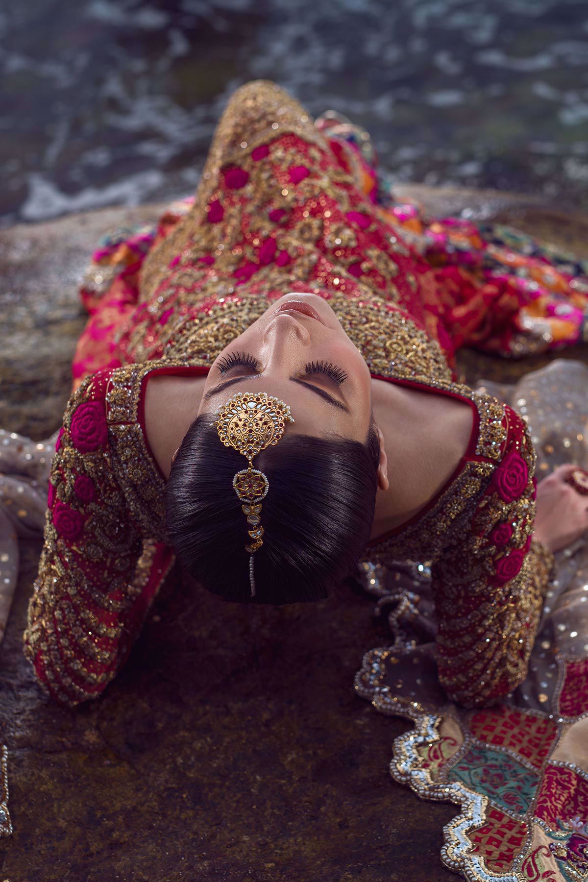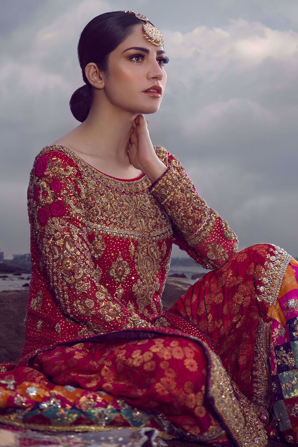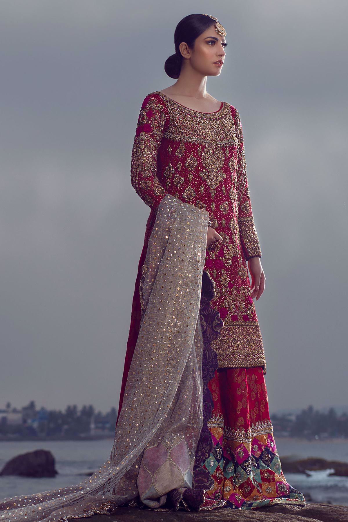 Crimson A line straight with antique gold embroidery with kaamdani details featuring old school hand embroidered details with silk thread resham rosettes. The shirt is paired with chatta patti dhaka pajama with antique and gold handwork border and botis all over. Shimmer net dupatta with scallop’s border and sequins incorporated with chatta patti and silk thread rosettes make this ensemble head turning.