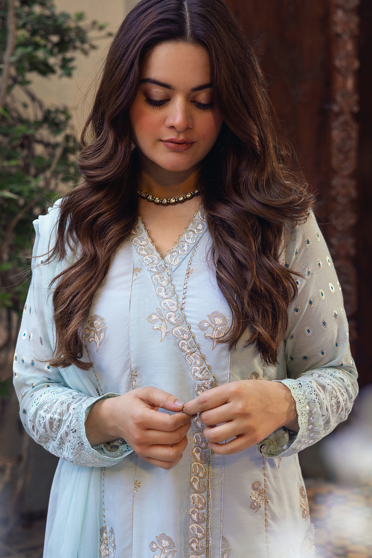The elongated silhouette angharka in an A-line cut in dreamy shade of powder blue showcases exquisite hand block printed details, further embellished with an embossed organza border adorned with sequins along the hem. The sleeves are elegantly enhanced with lorex, while the center front features a meticulously handcrafted tassel. This ensemble is complemented by a chiffon ombre dupatta, which exhibits hand block printed details, and is accompanied by matching straight pants.