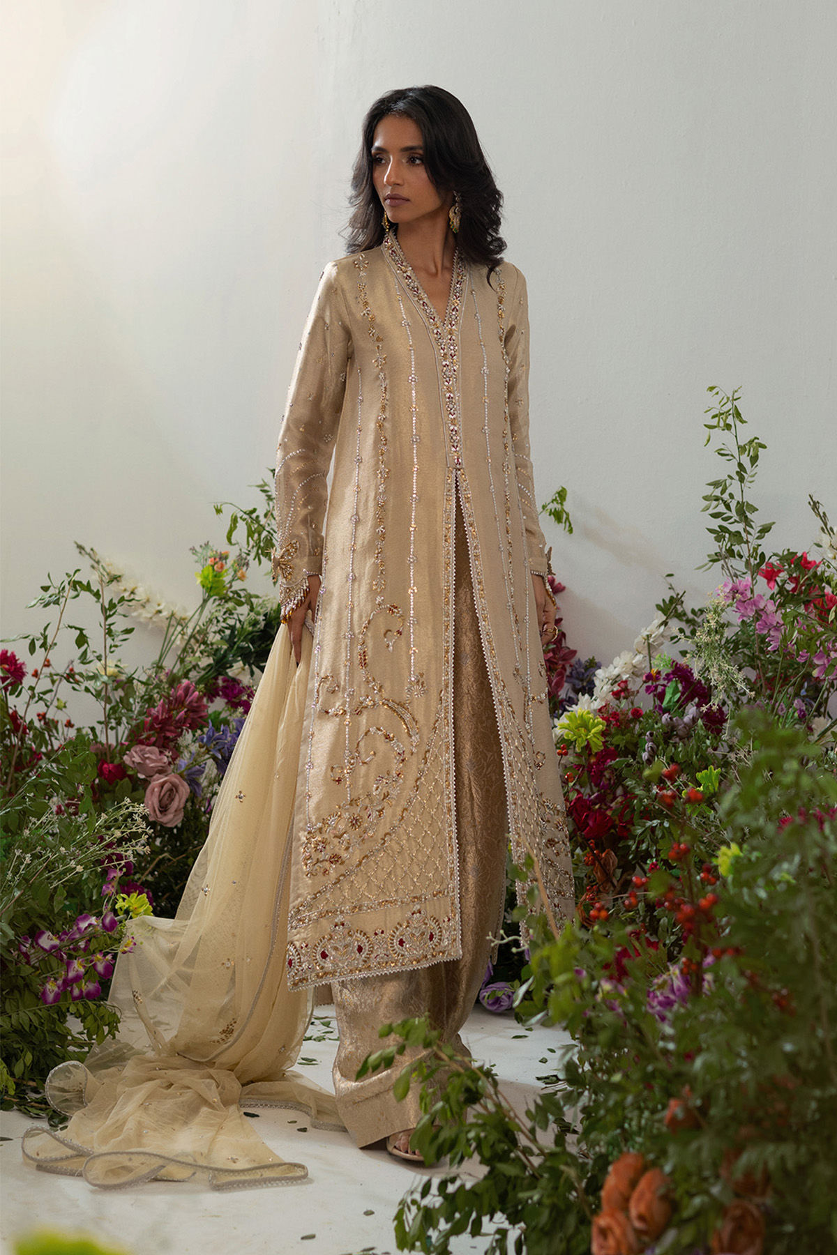 Flowing silhouette of a front-open shirt in a soft, shimmering gold lamé fabric adorned with intricate zardozi embellishments in antique gold hues. Delicate 3D butterfly motifs grace the sleeves, adding a touch of whimsy. Complete the look with luxurious damask flared pants and a sheer dupatta embellished with shimmering silver and gold sequins.
