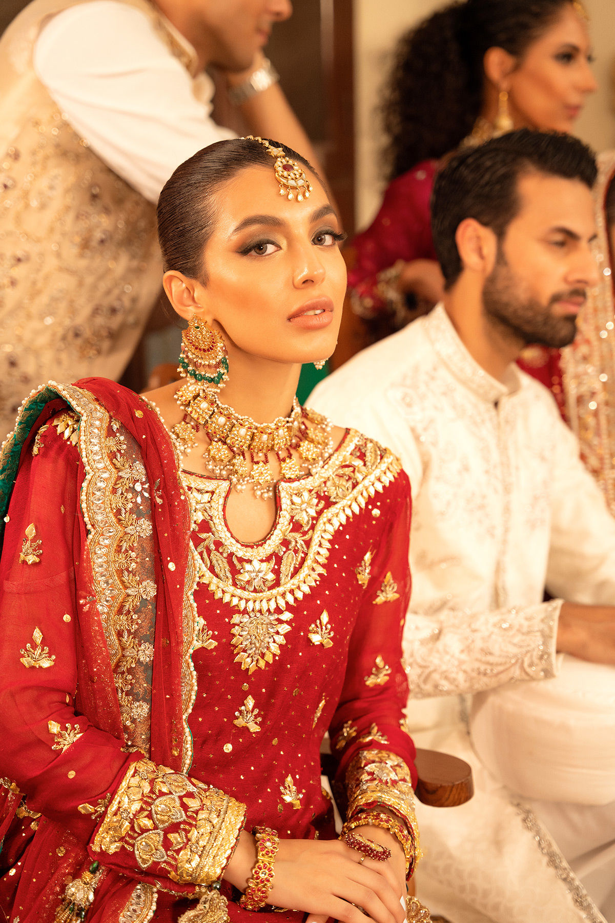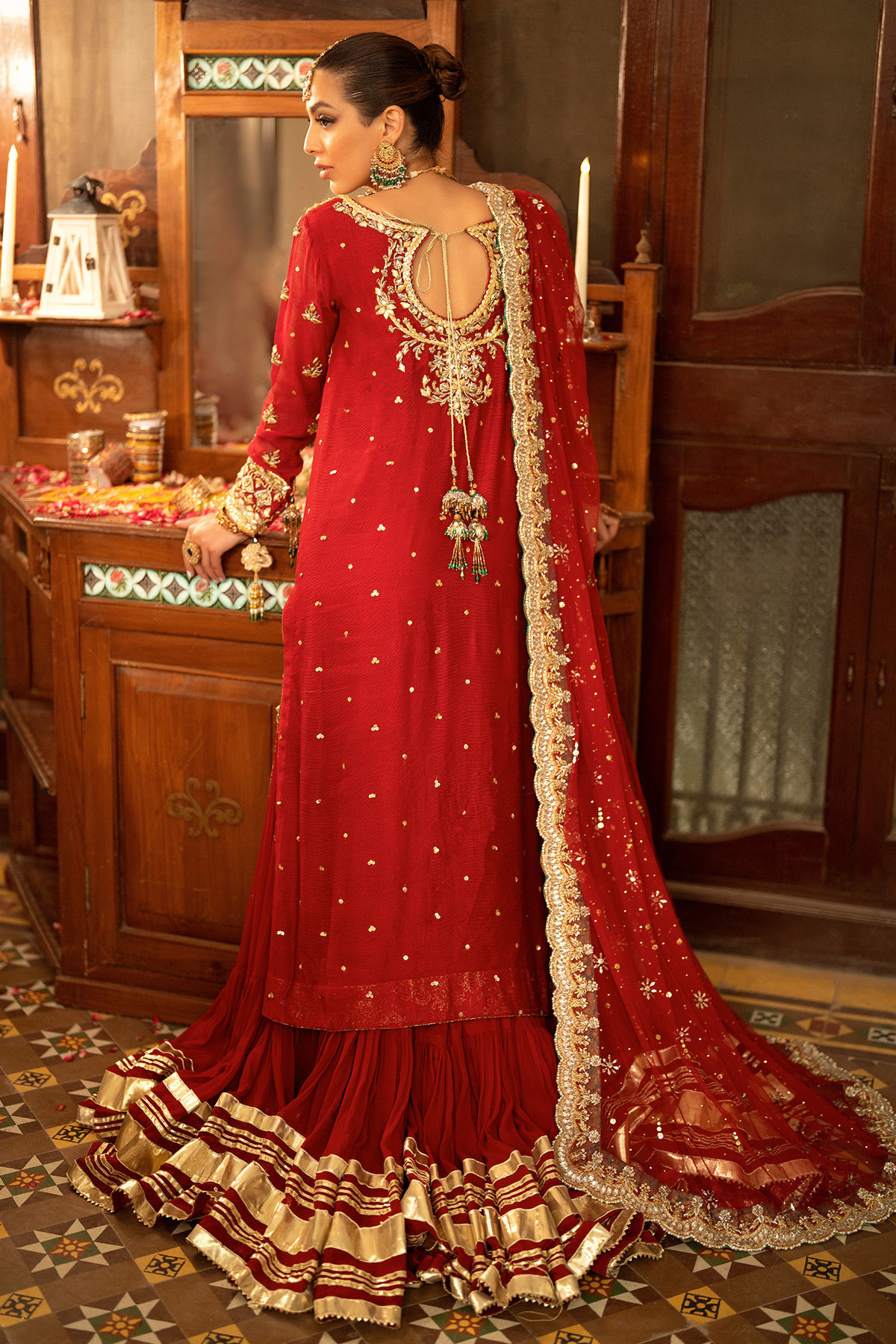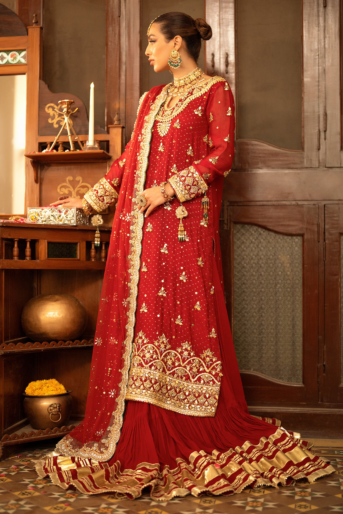 Old school gota and kaamdani details on deep scarlet silk net canvas. The old-school Hyderabadi neckline is adorned with gota and zardozi details in shades of antique and gold. The shirt is paired with crushed lehnga featuring gota on the hemline.