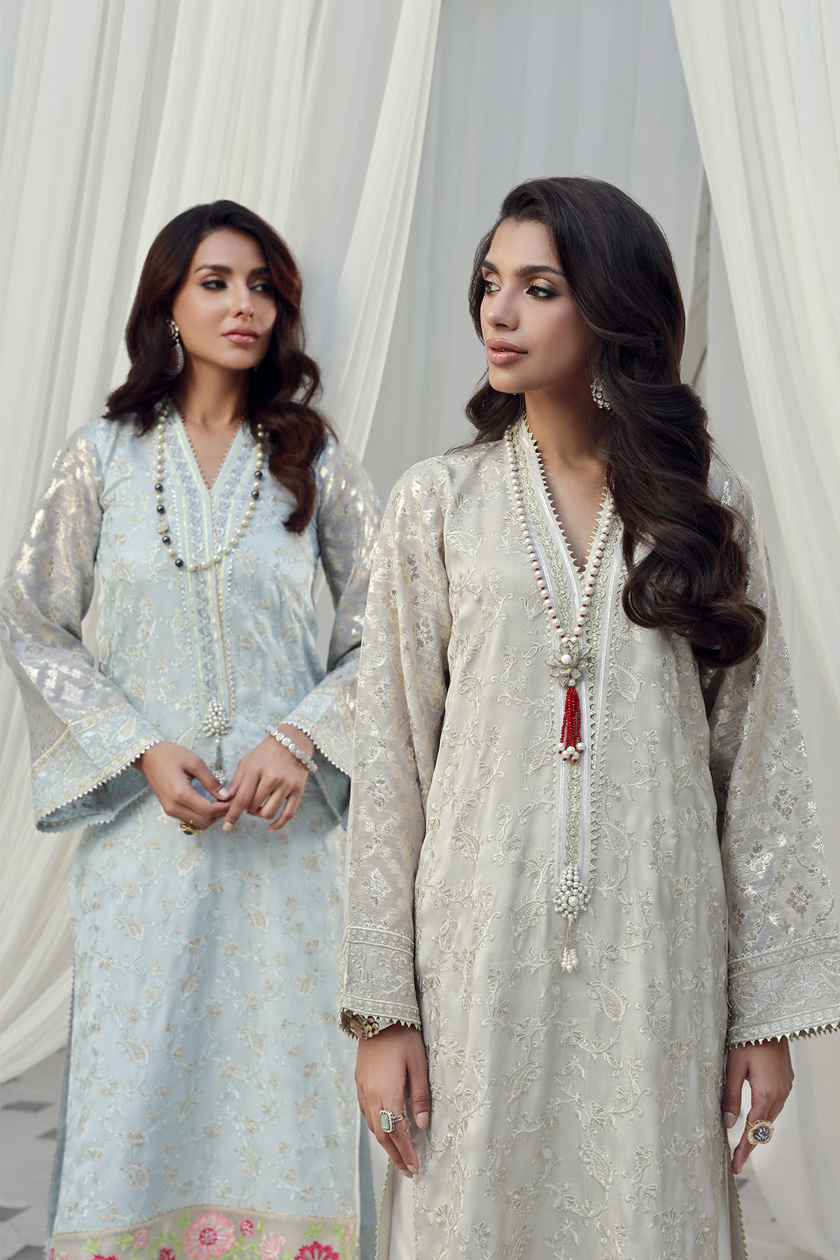 Long silhouette shirt on mirror silk canvas featuring self-floral embroidered details with a hint of gold zari on centre front. The hemline of the shirt is enhanced with floral embroidered details. The neckline is enhanced with gota and handcrafted embellishments. The shirt can be paired with reya azaar featuring embroidered organza and lace details.