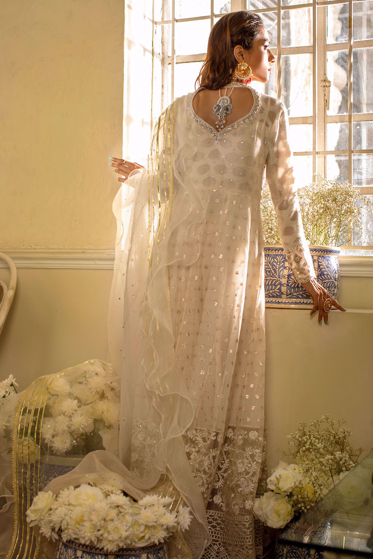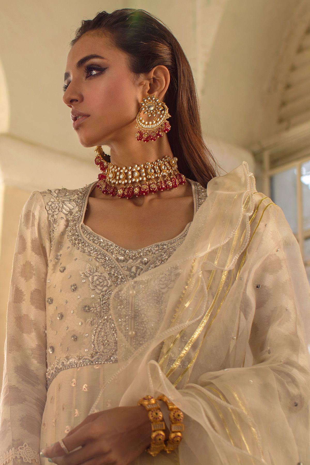 Floor length organza and khaadi silk peshwas with old school neckline, the neckline is adorned with all silver handcrafted details of dabka, stones and silk thread rosettes in dreamy off whites, the peshwas is paired with ruffled organza dupatta with gota, sequins and pearls details.