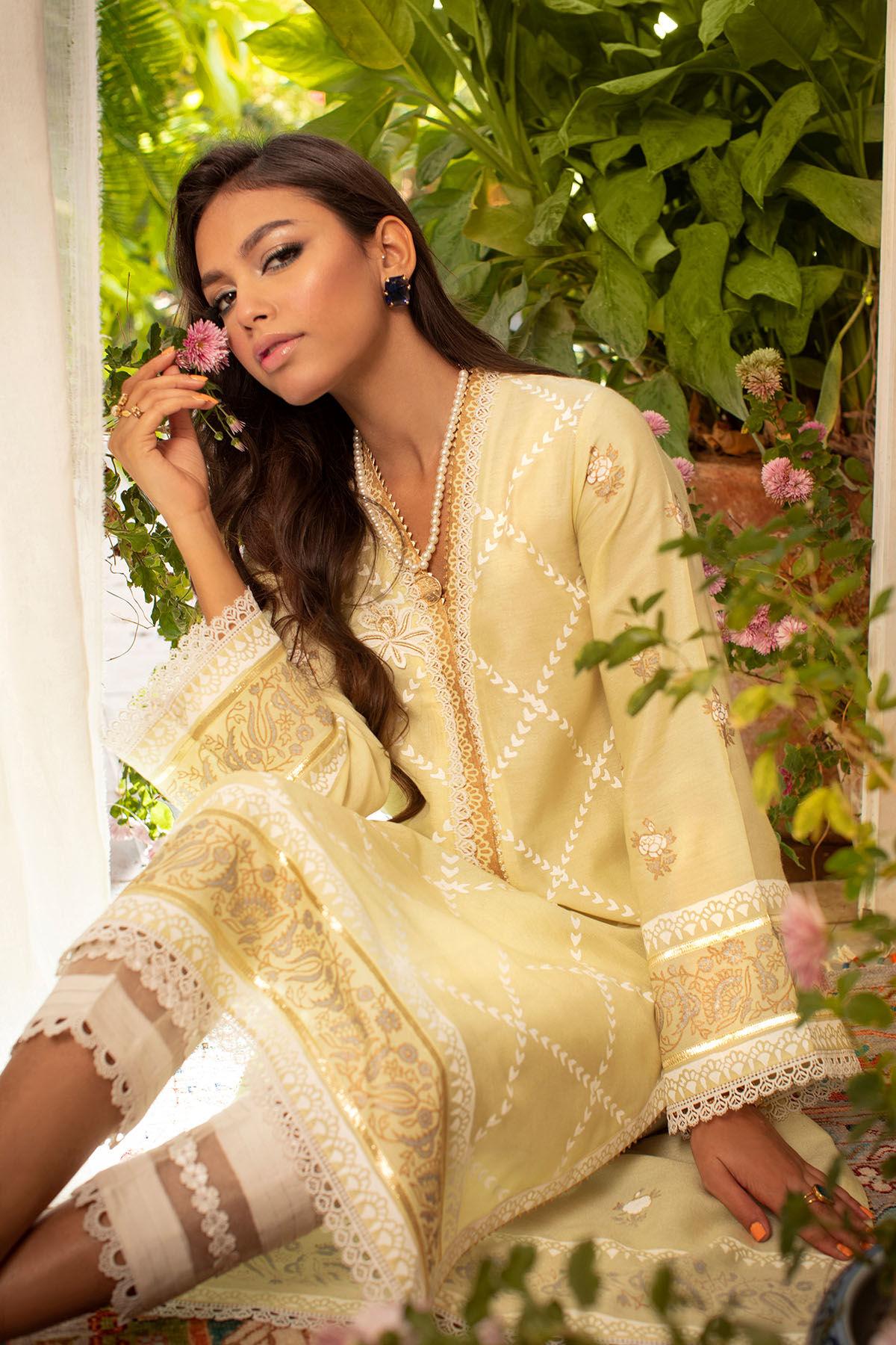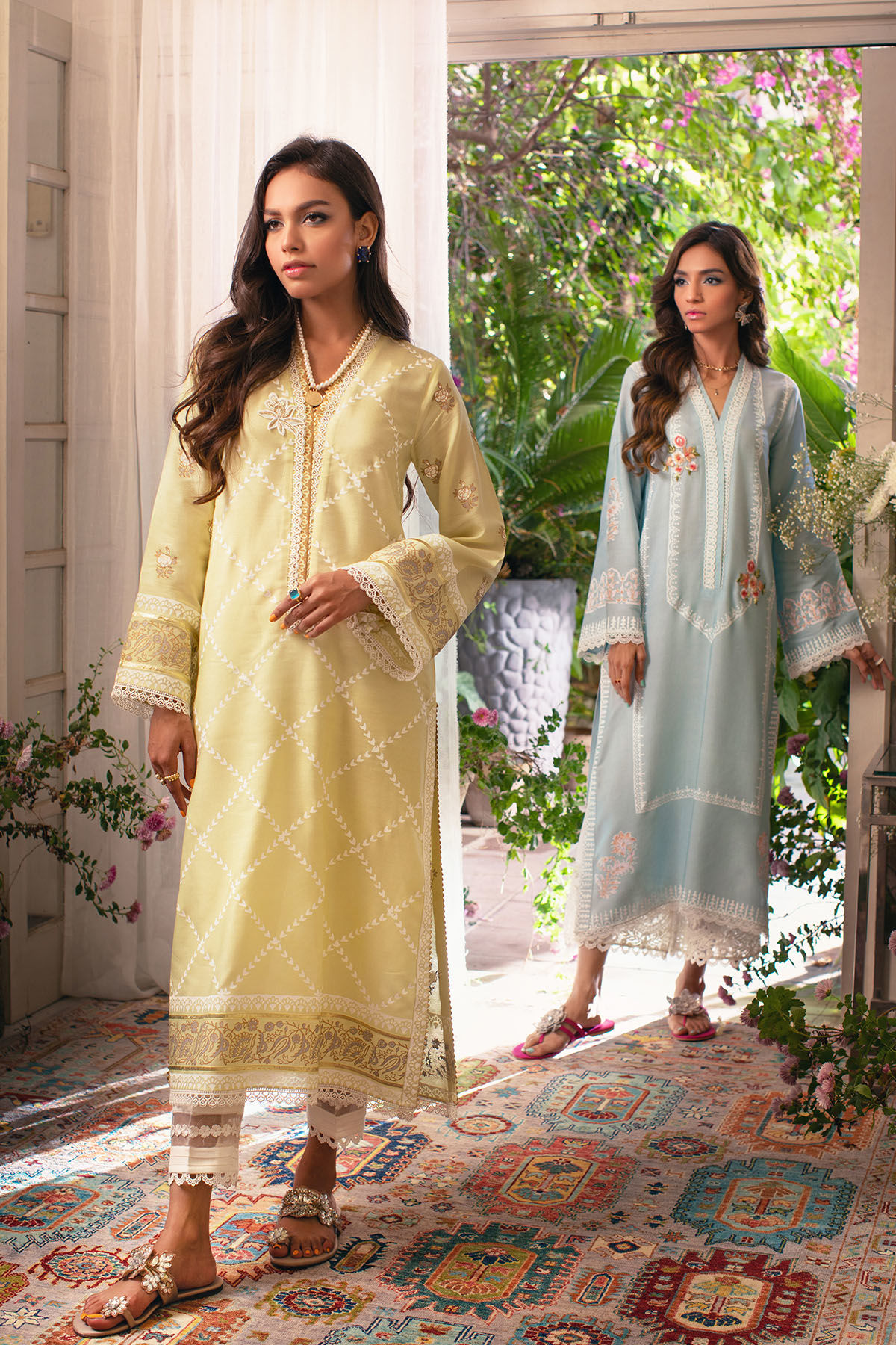 The shirt can be paired with Raya cotton pants featuring organza and pleats details incorporated with lace details.