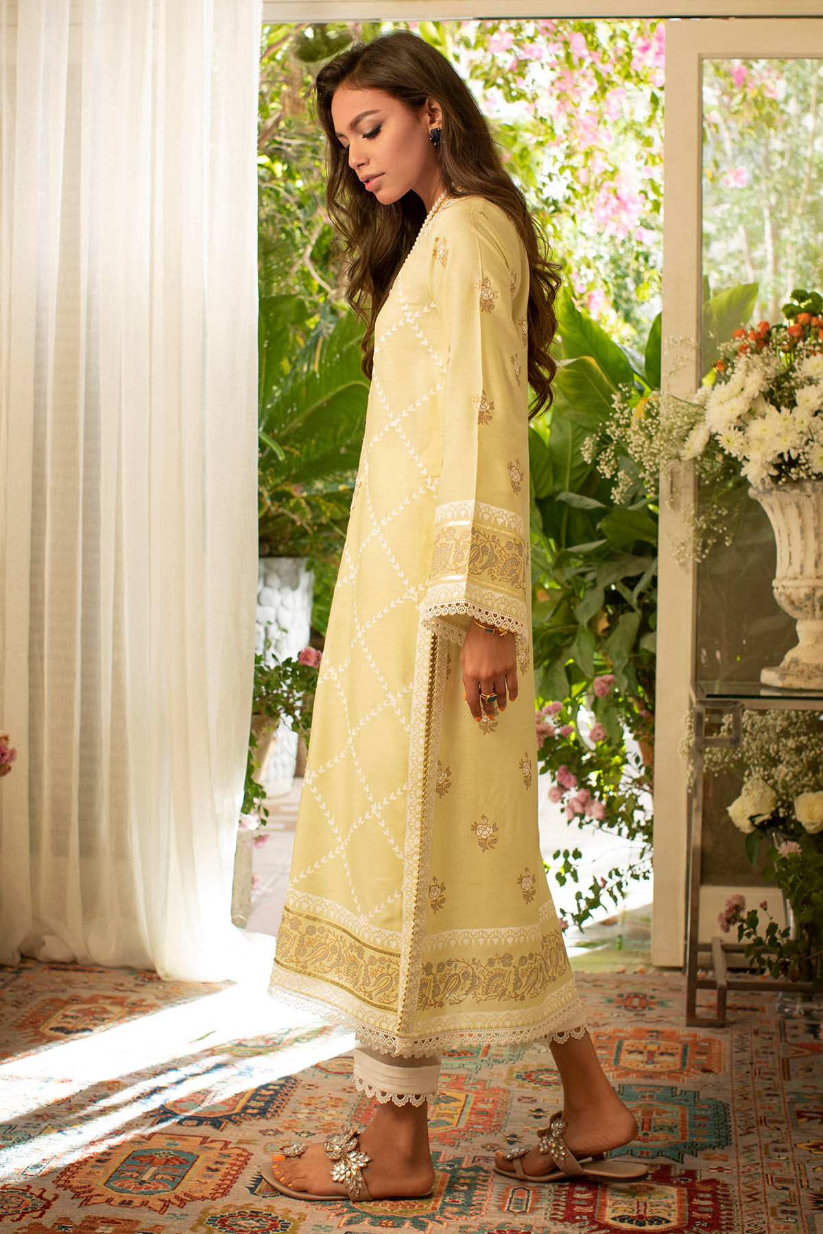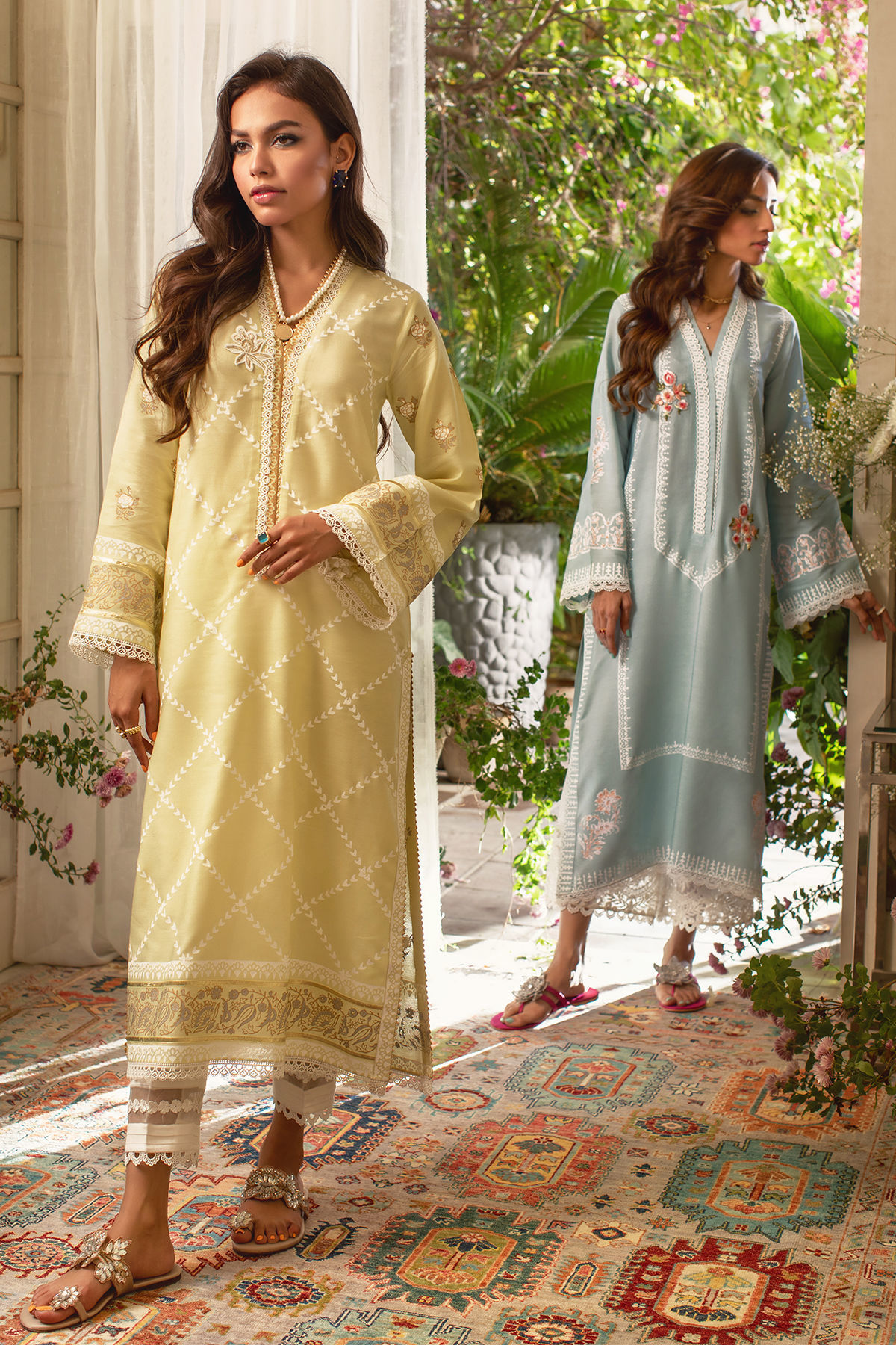 Long silhouette cotton net shirt featuring hand block printed details on lime canvas. The neckline is enhanced with crochet lace and rosettes appliqué details. The block printed hemline is enhanced with gota details.