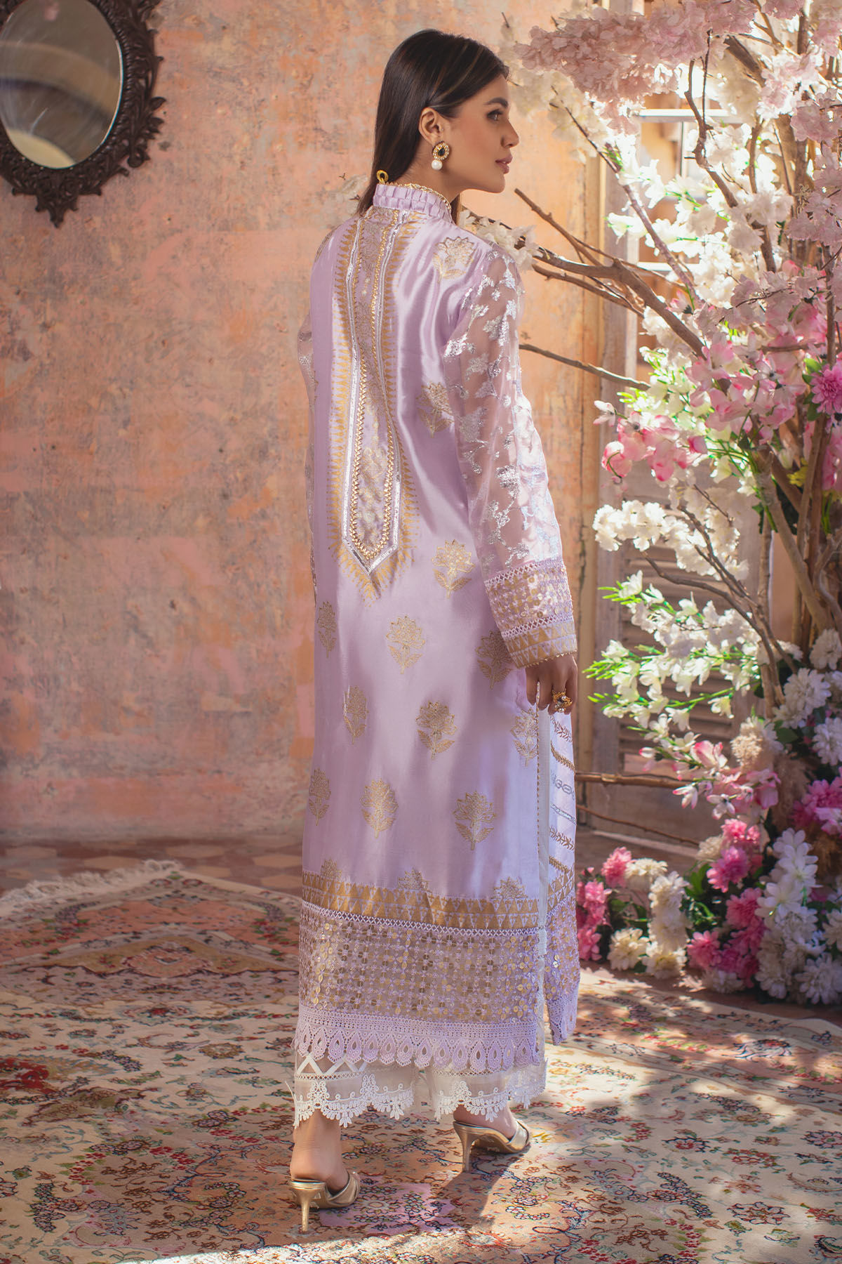 Long silhouette shirt in pure handwoven silk featuring hand block printed details on front and back which are further adorned with age old kaamdani details. The neckline is adorned with fabric manipulation details and handcrafted pearls and rhinestones embellishments. The outfit is further adorned with gota and sequins panels on the hemline.