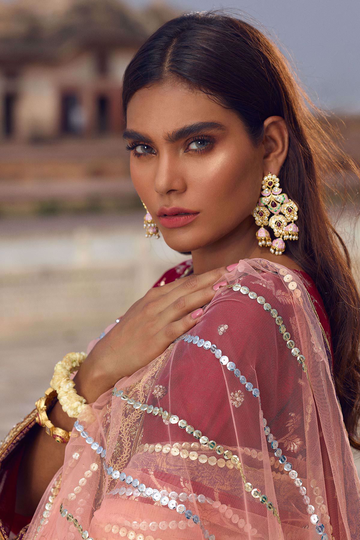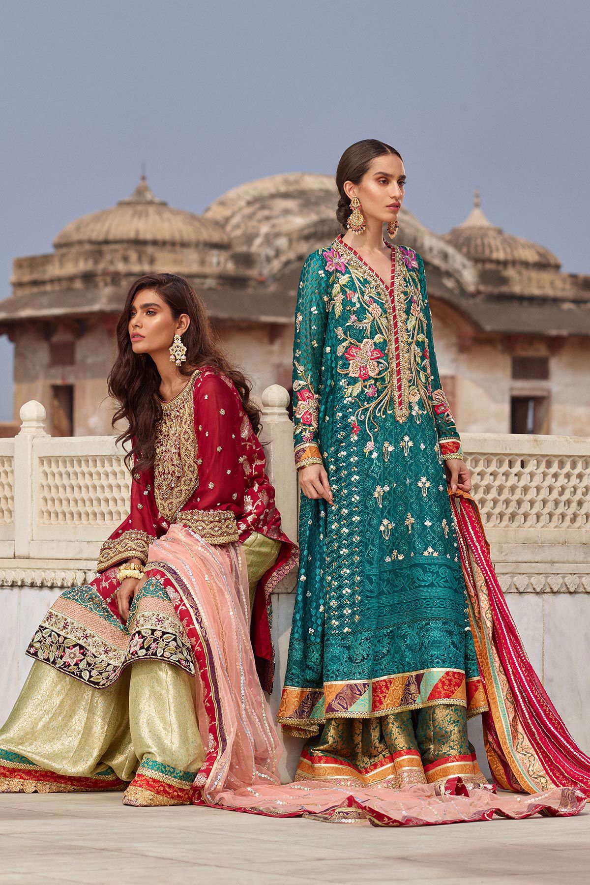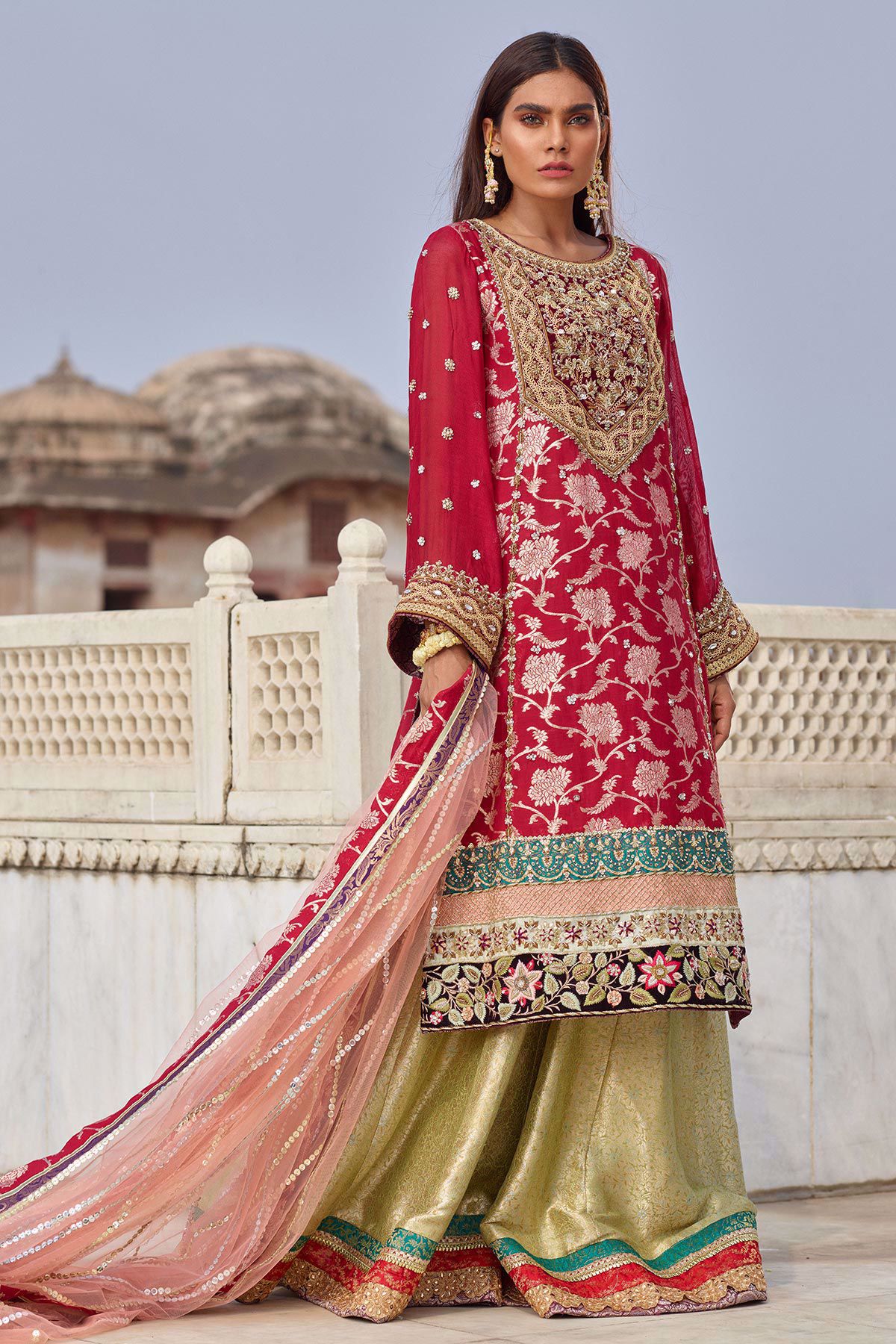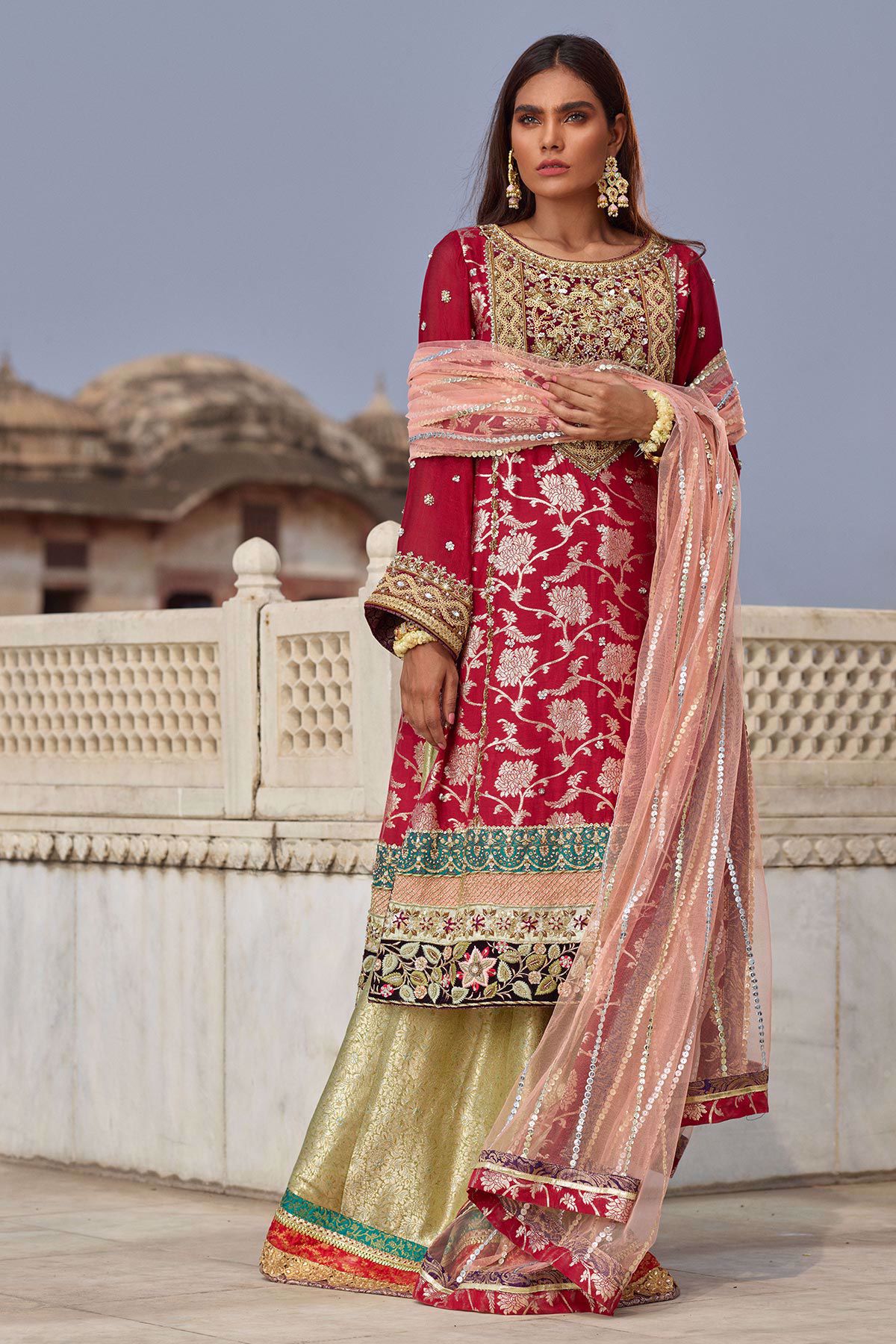 A line shirt with gorgeous old school maroori details on the front and sleeves which is further enhanced with resham rosettes on velvet. The shirt is paired with contrasting dhaka pajama with finishings. The salom dupatta with sequins pattern sets this outfit apart.