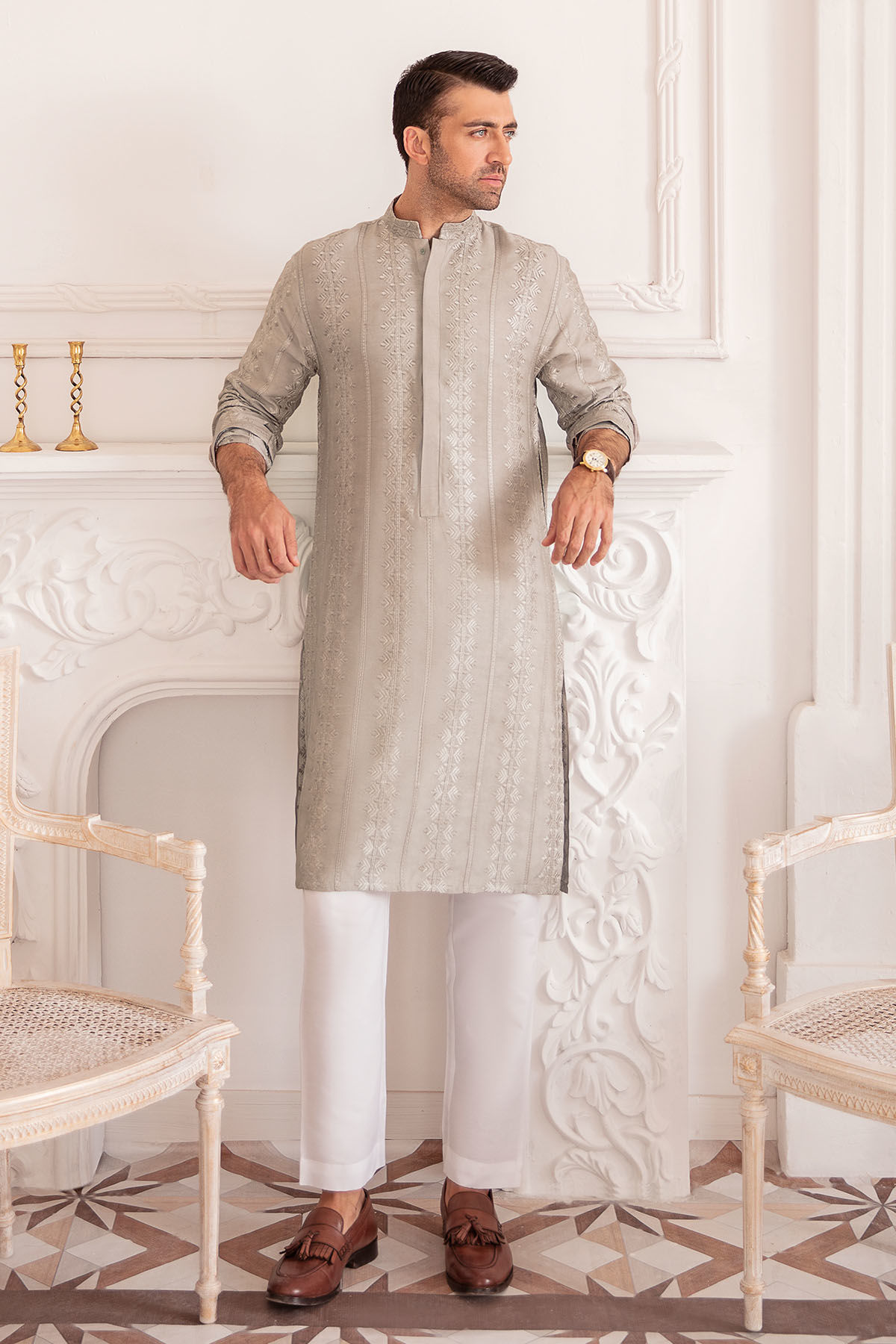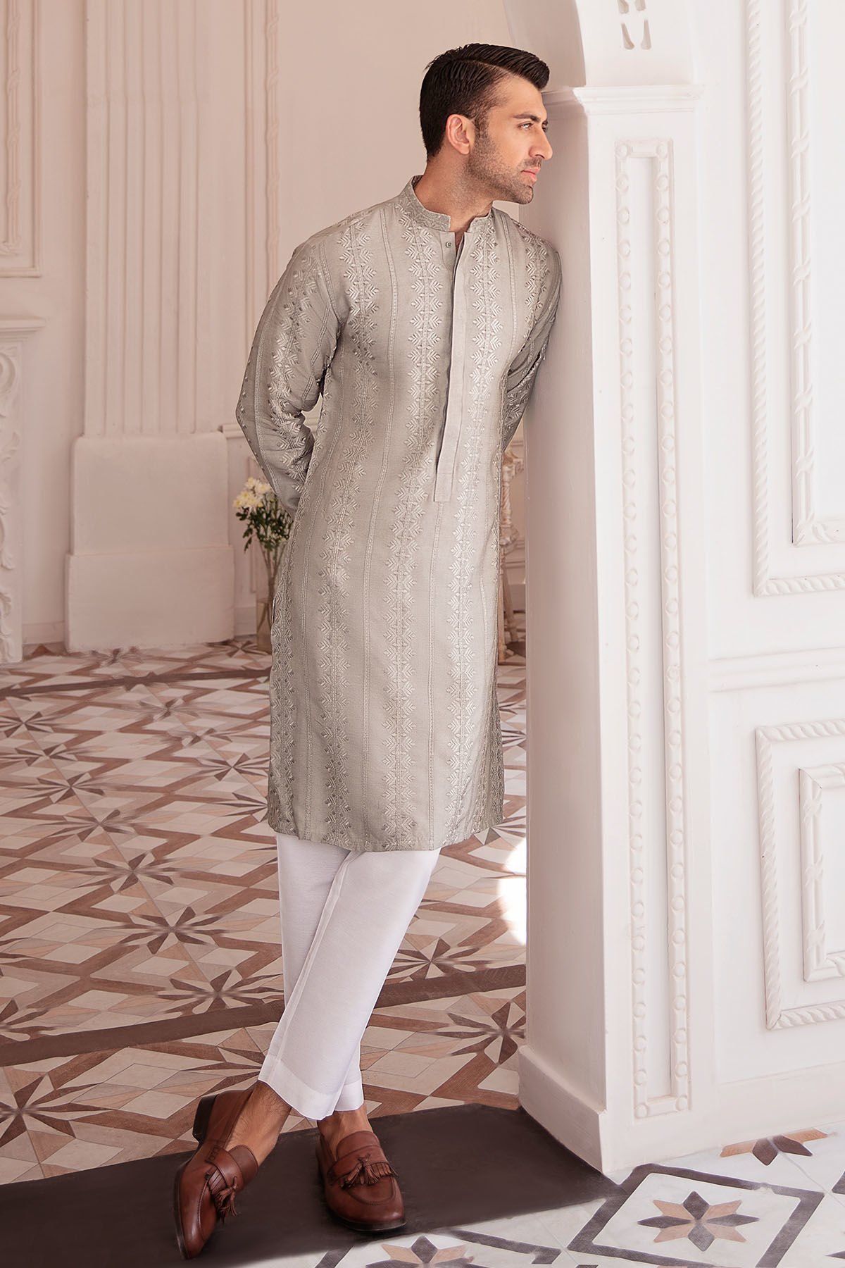 Self-embroidered cotton net kurta on grey canvas featuring placket details on the neckline, the kurta can be paired with straight white cotton pants.