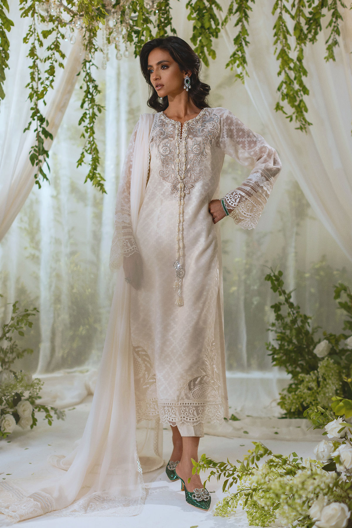 Long silhouette shirt in pristine white on silk net canvas featuring subtle white on white muted embroidered details on neckline. The neckline is further decorated with handcrafted tassels. The hemline is carefully crafted with appliqué details. The shirt comes with matching straight pants and matching dupatta to set you apart this festive season.