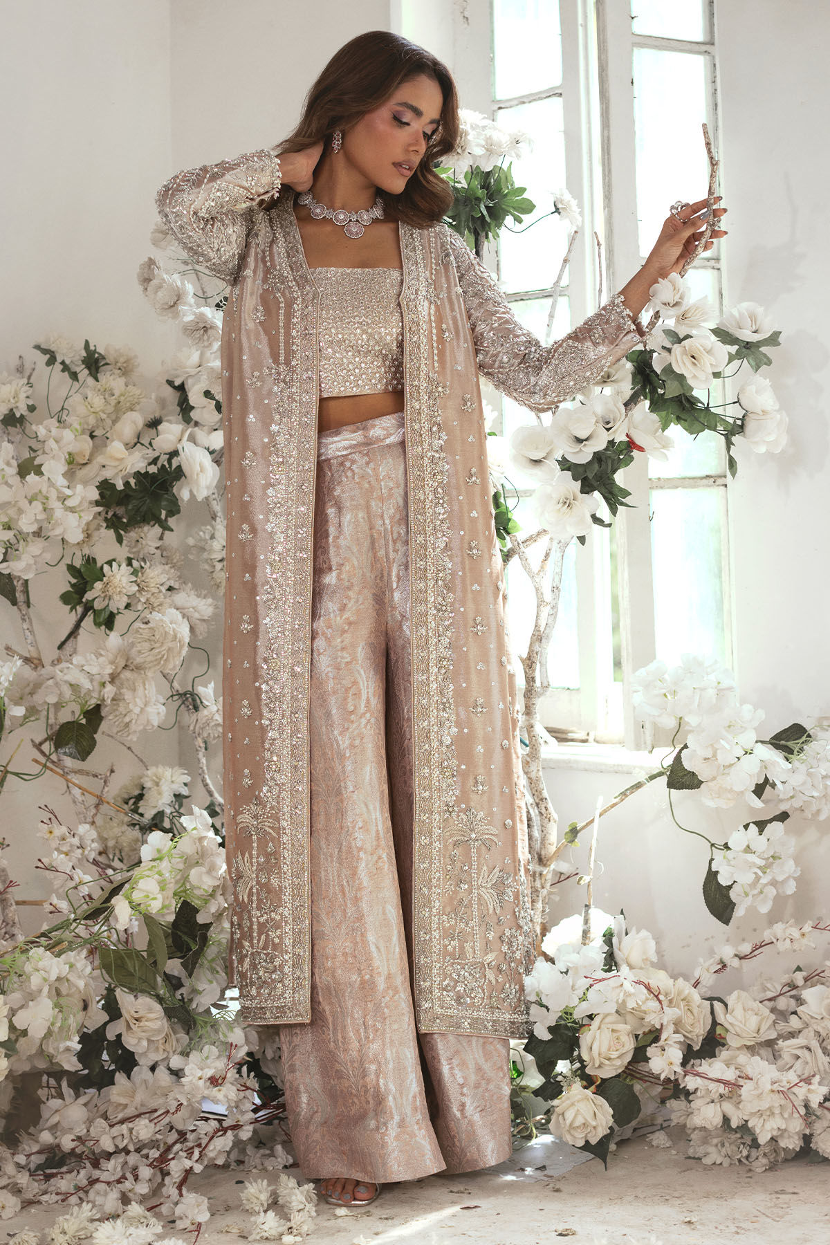 Experience the elegance of our long silhouette jacket crafted from exquisite peachy nude lamé canvas, adorned with intricate all silver zardozi details that catch the eye. The meticulous handcrafted details are further enhanced with luxurious silk thread resham, adding a touch of sophistication. Paired with a beautifully crafted bustier, this outfit radiates charm. The side slits, adorned with dangling handcrafted tassels, create an alluring movement with every step. Elevate your wardrobe by pairing this stunning ensemble with our two-legged damask flared pants for a truly captivating look.