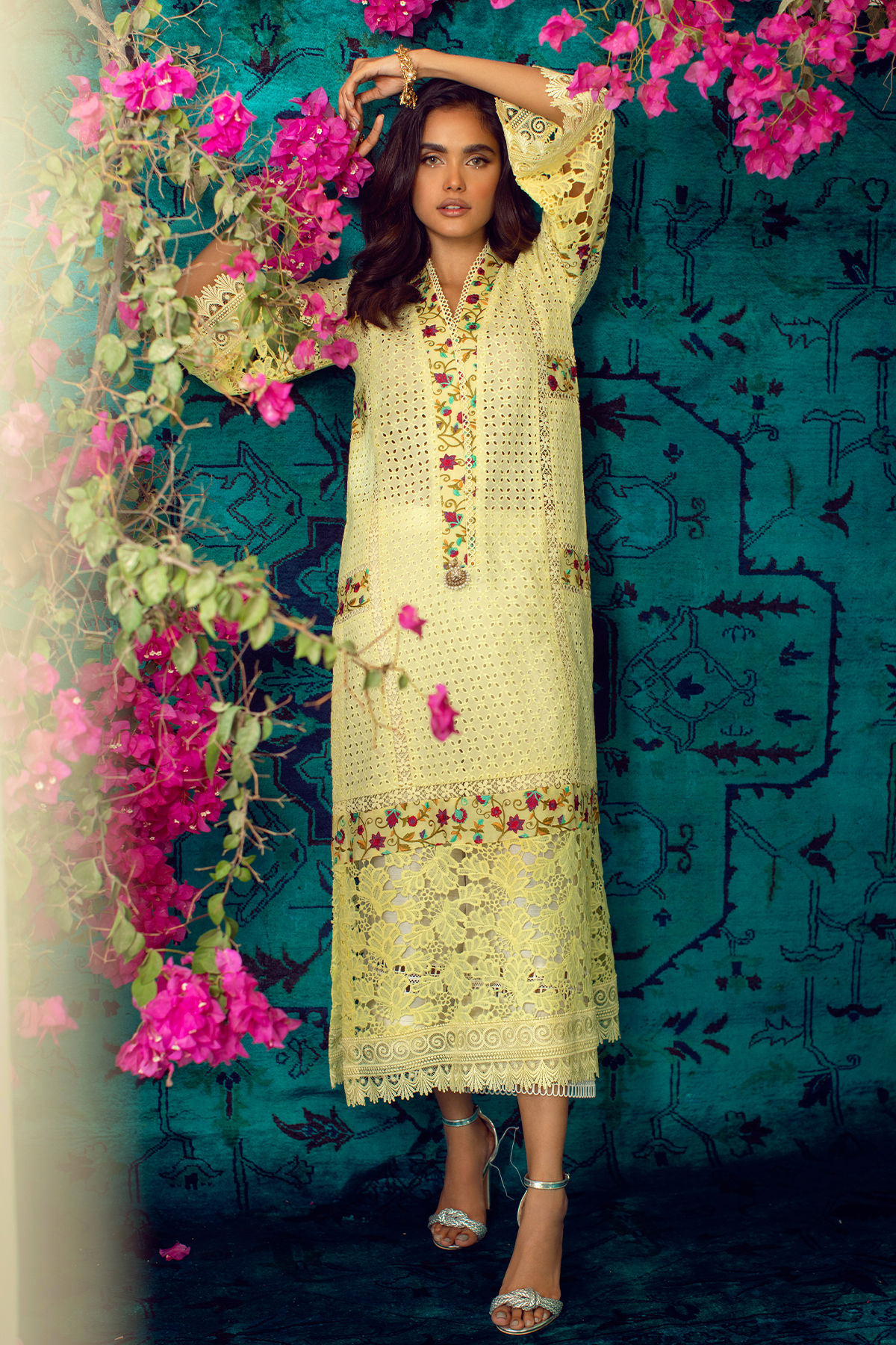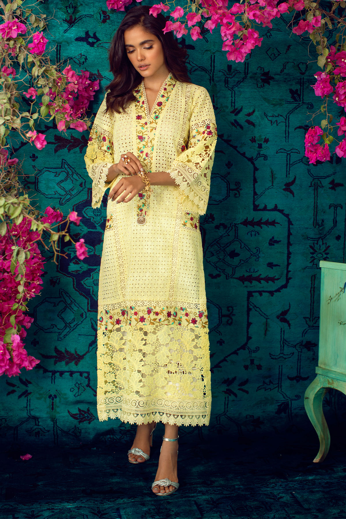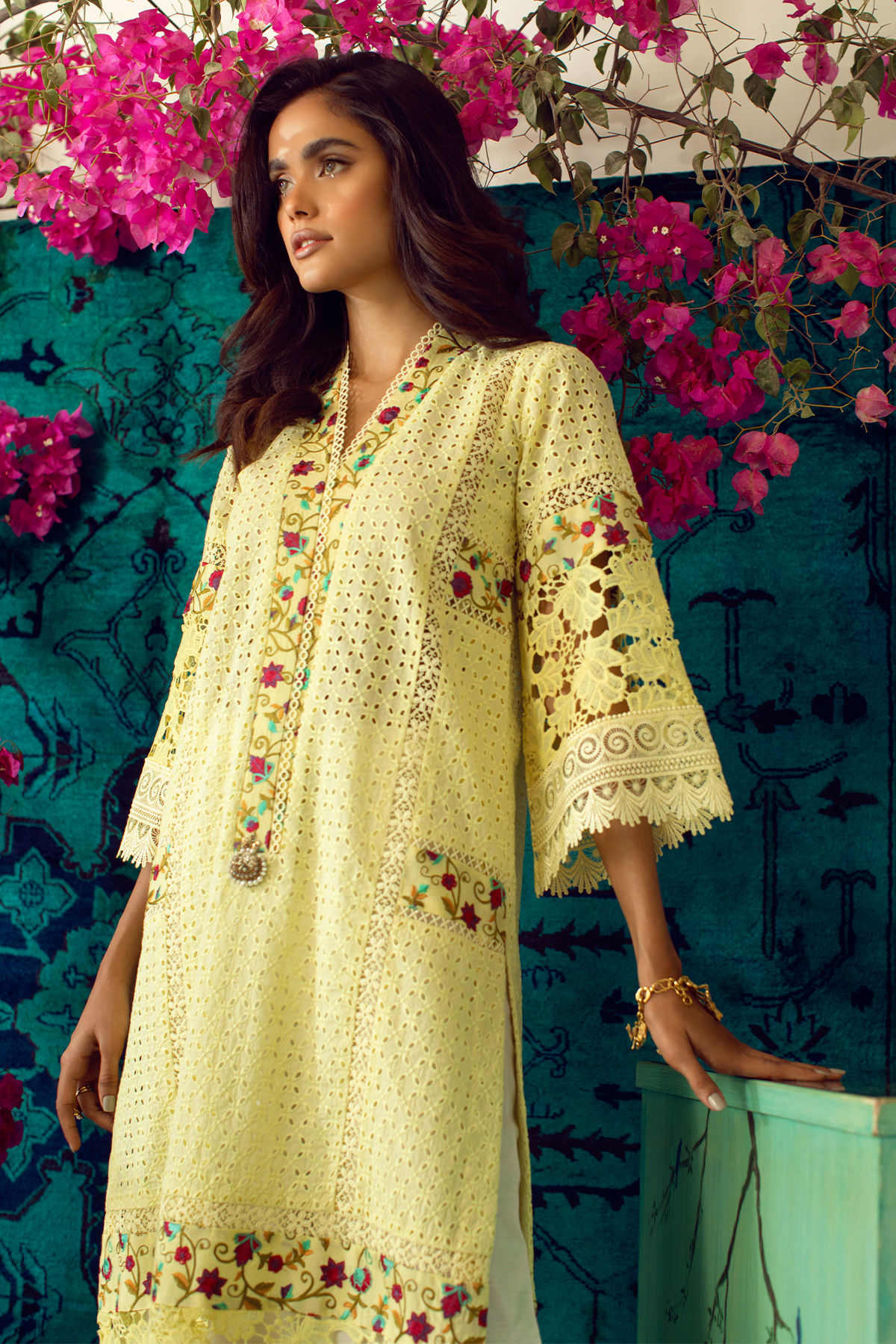 Long silhouette chikan shirt featuring multicolored panels on neckline, side panels and hem which are adorned with inserting laces and handcrafted embellishments on center front.