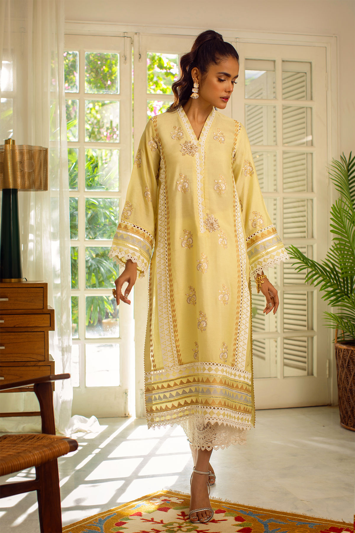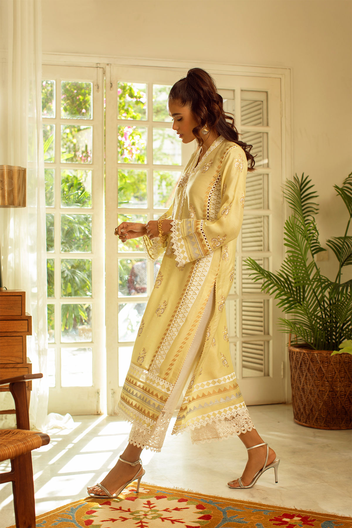Long silhouette shirt on a dreamy pastel lemon canvas featuring hand block printed and crochet lace details. The neckline is adorned with appliqué motifs and hemline is adorned with geometric block printed details.