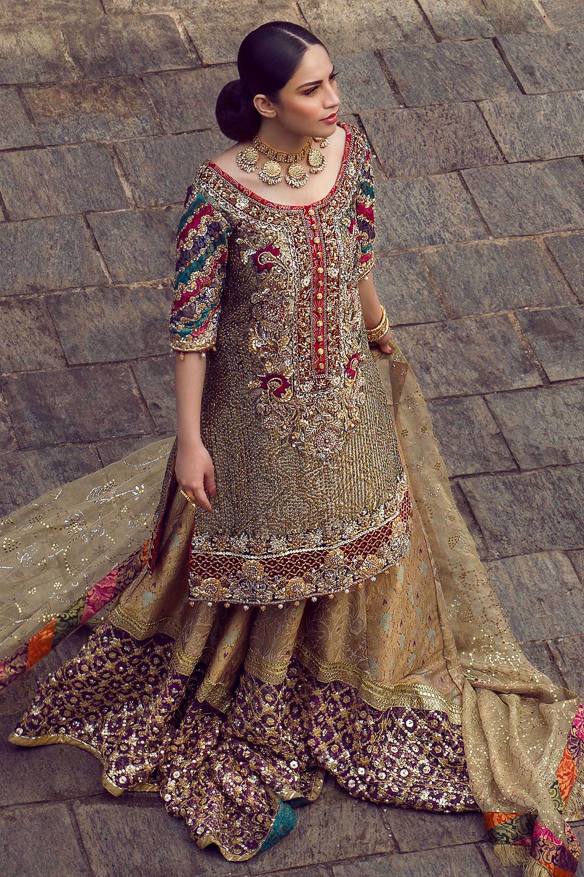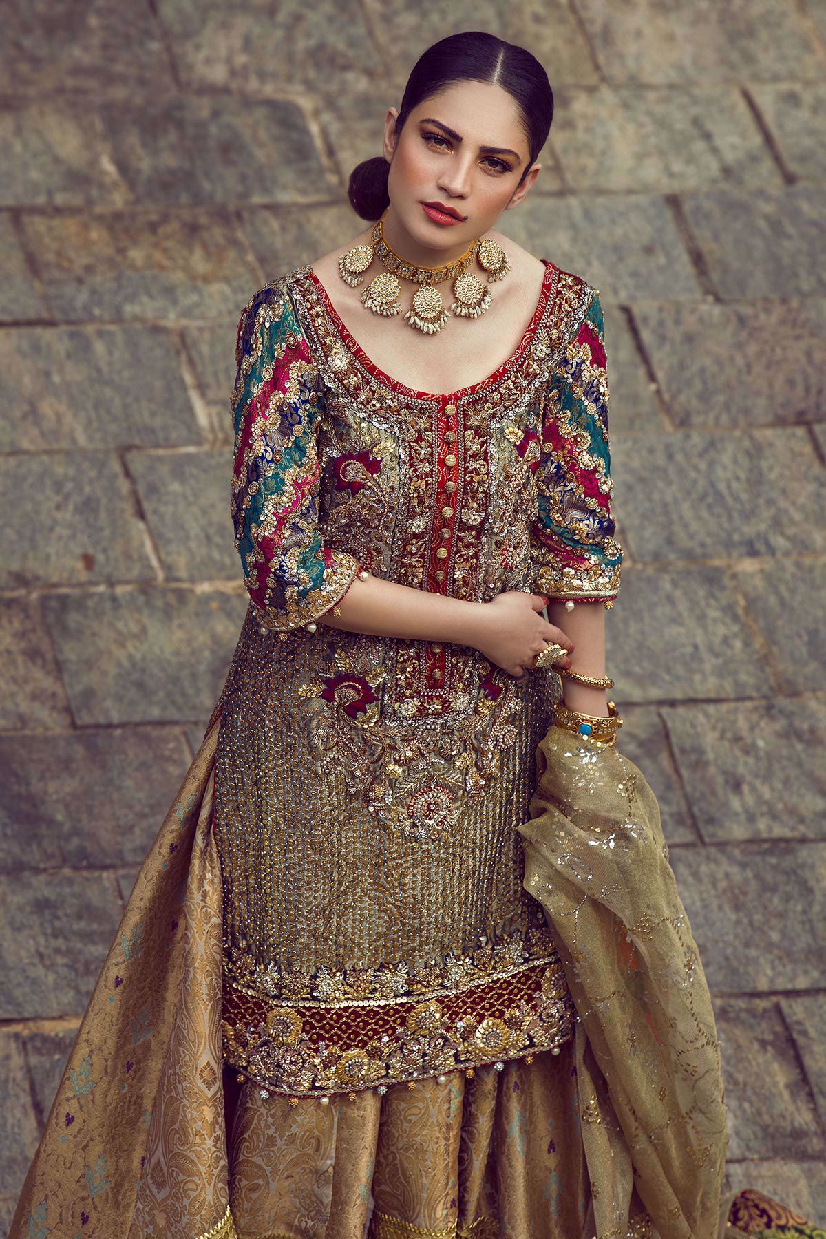 Gorgeous old school inspired deep green shirt on Lamé featuring kaamdani details incorporated with heavy worked appliqué neckline on deep maroon velvet. The sleeves of the shirt have chatta patti details which are adorned with antique dabka, gota and naqshi. Gold and deep plum farshi dhaka complete the look. Gold net dupatta with kaamdani and chatta patti details makes this outfit head turning.