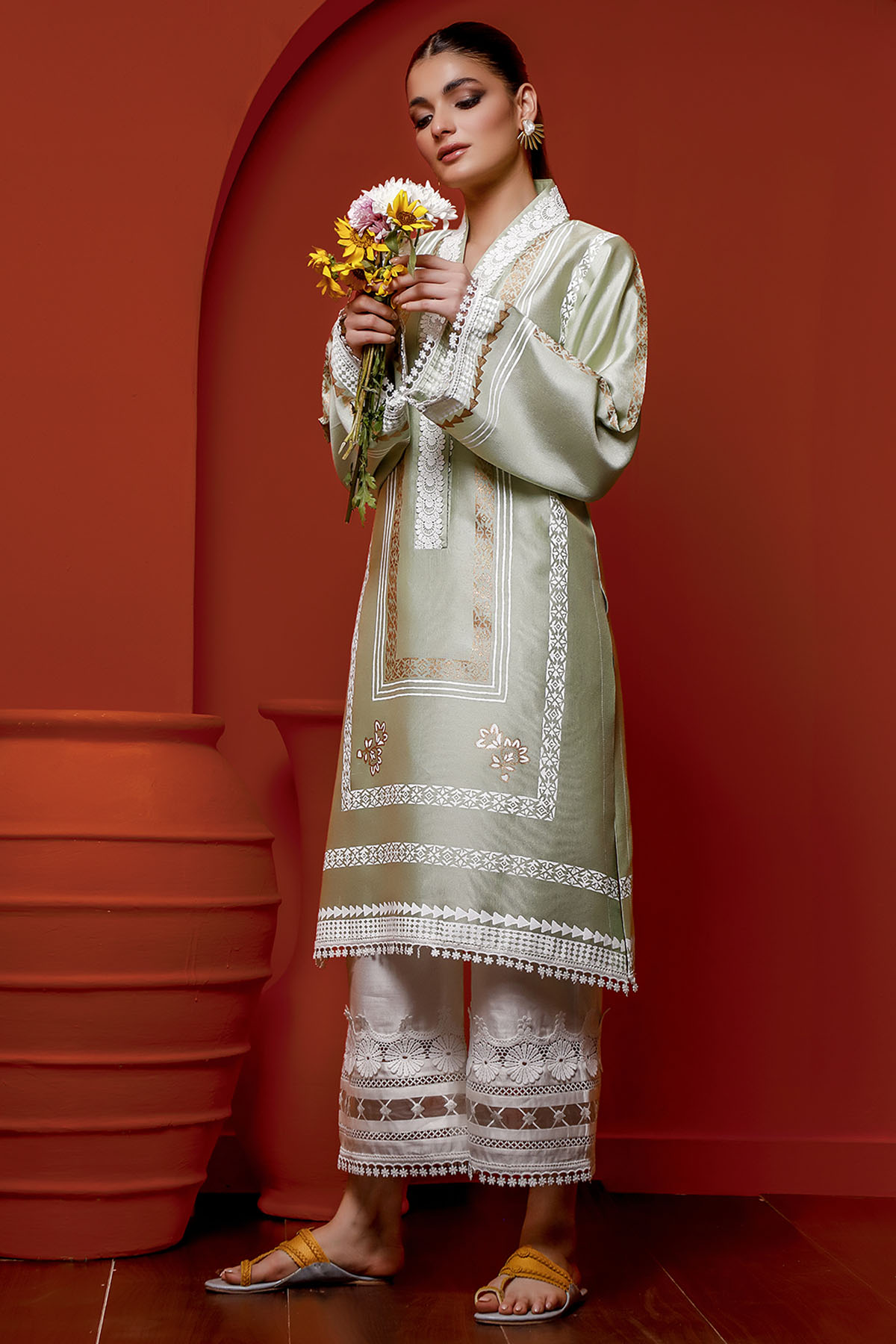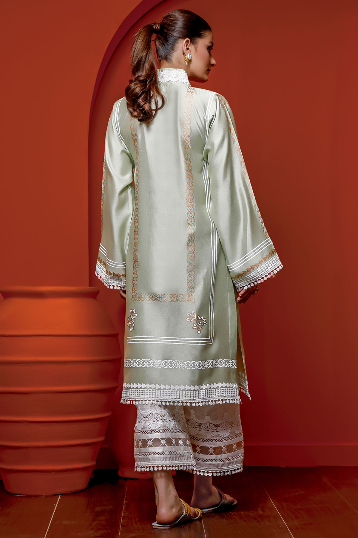 Long silhouette shirt with stunning white and gold hand block printed details merged together with crochet laces on pure cotton net canvas in subtle shade of mint.