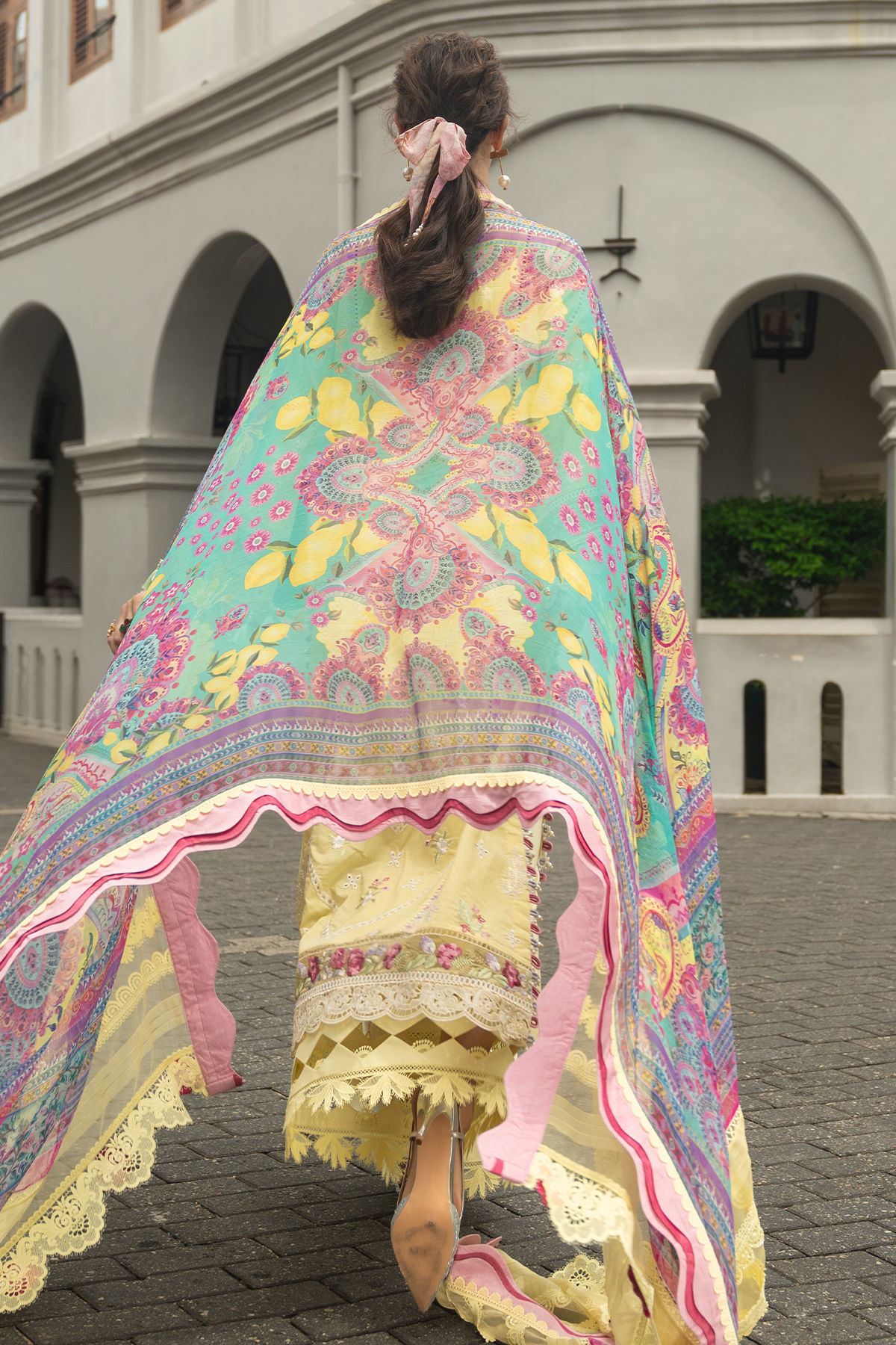 Designed on a vibrant floral canvas, 'Baneera' showcases artful schiffli craftsmanship enhanced with soft thread highlights along the front and sleeve borders. The neckline is framed with delicate detailing, while organza trims finished with laser accents add dimension to the silhouette. Paired with lightweight lawn trousers and a chiffon dupatta in complementary shades, it embodies effortless summer elegance.