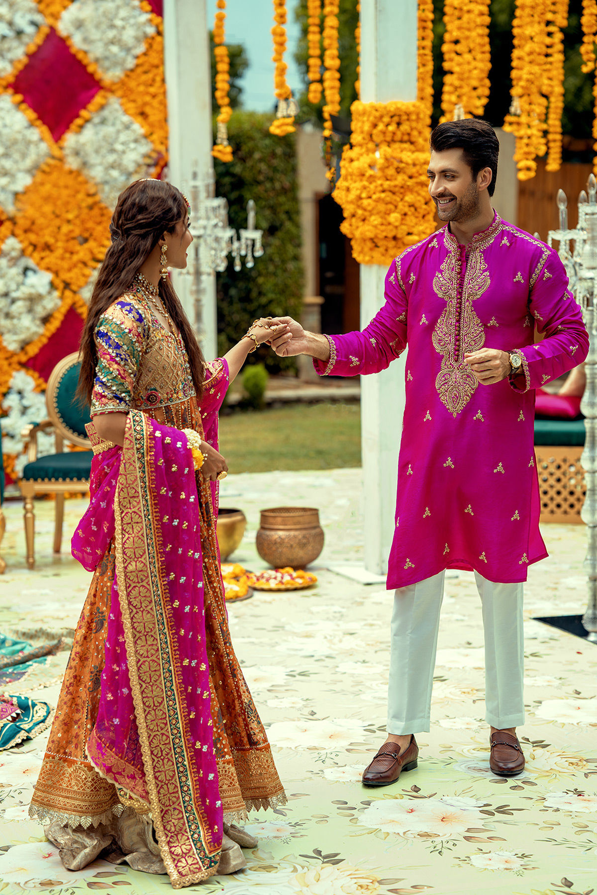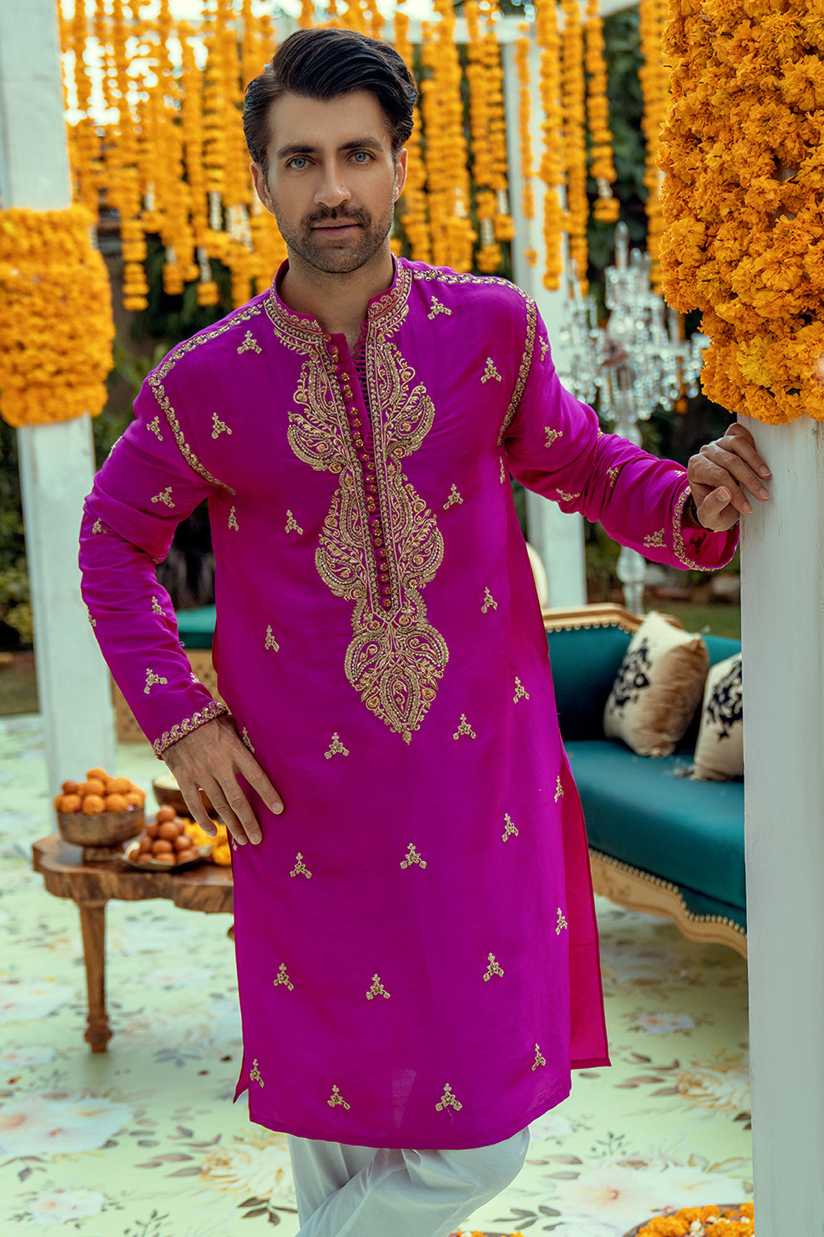 Pure raw silk kurta in deep fuchsia shade featuring dull gold and bronze zardozi details. The neckline of the kurta is adorned with light catching sequins and enhanced with loops and handcrafted buttons. The kurta is paired with straight cotton pants.