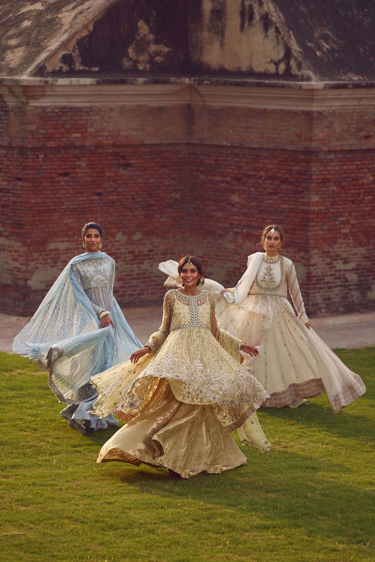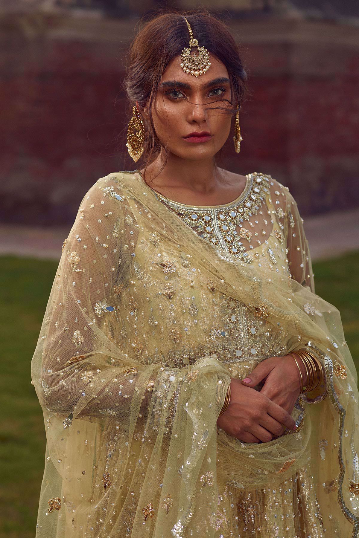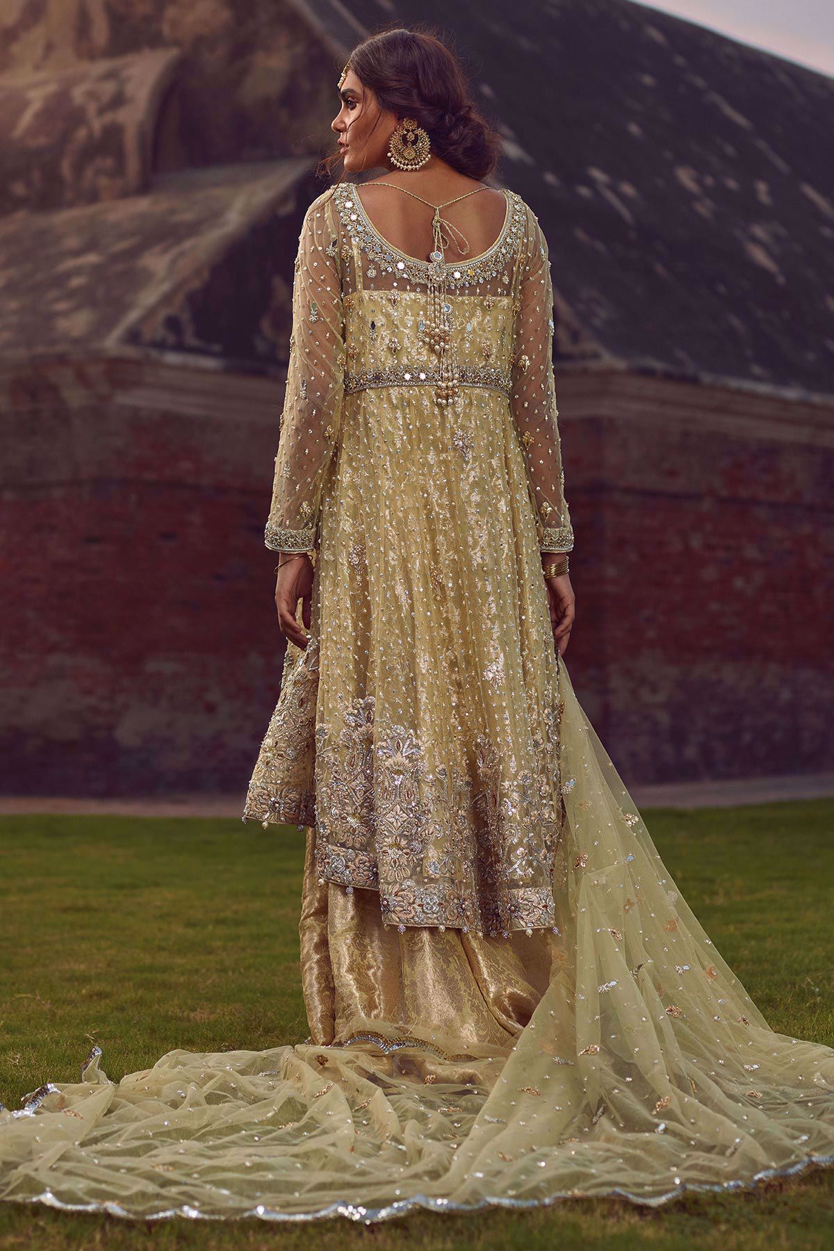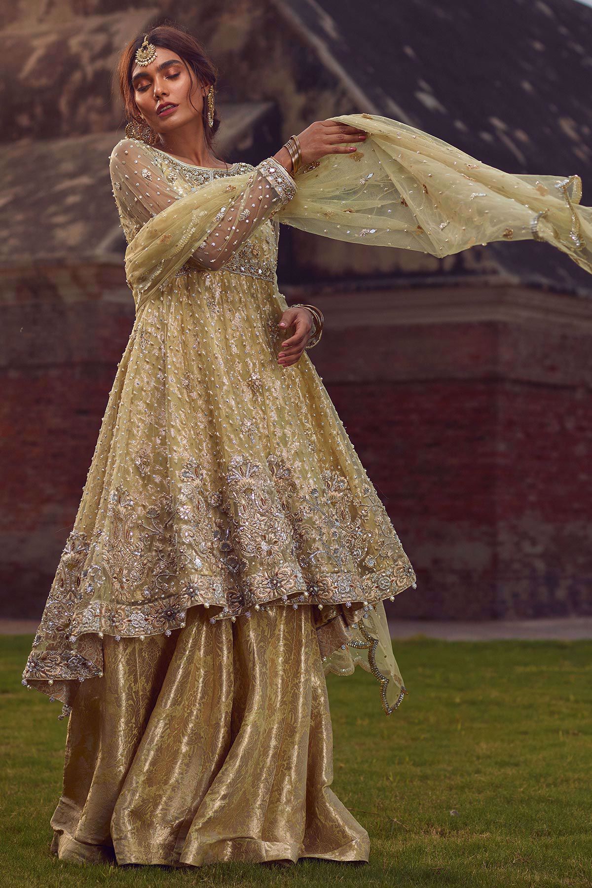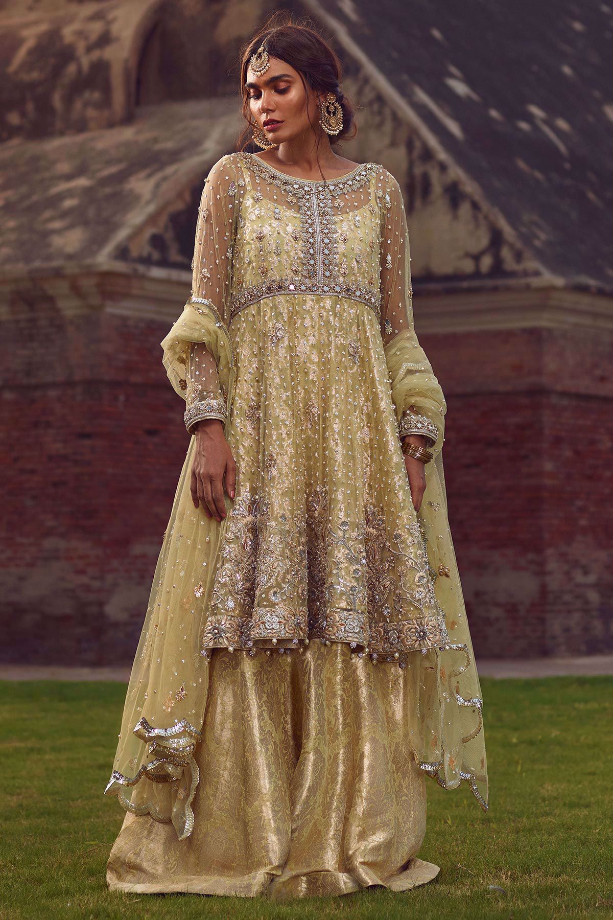Elegantly handcrafted high-low in shade mint featuring pure self-embroidered hemline with floral details which are enhanced with dabka, kora pearls and light catching crystals. The top is paired with damask dhaka pants. Scallops dupatta with gota and pearls details completes the look.