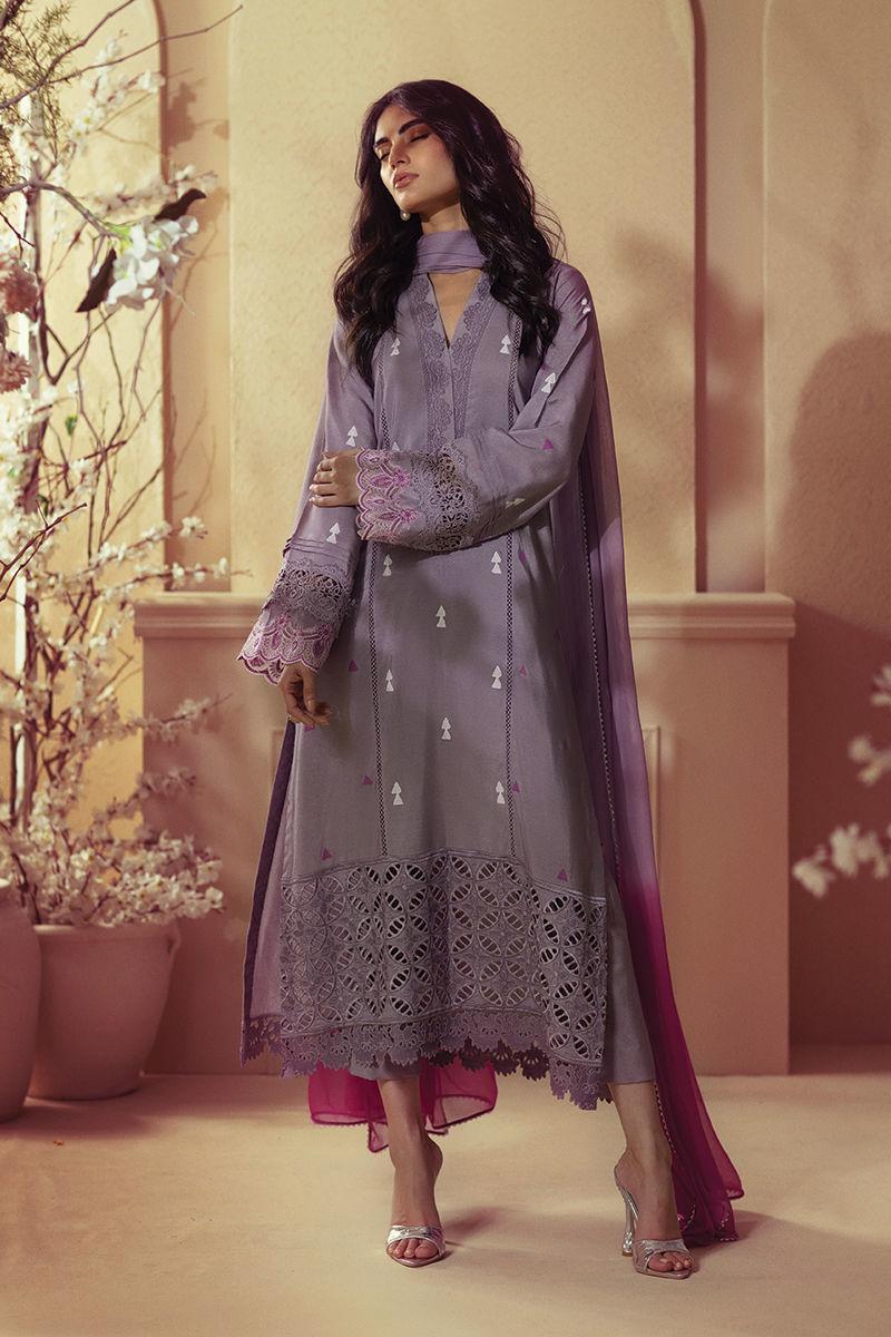 The long silhouette shirt, presented in a muted lilac tone, showcases exquisite hand block printed details on both the center front and back. The hem is elegantly adorned with a schiffli border, which is completed with delicate crochet laces. The sleeves are masterfully appliquéd, featuring an intricate embroidered border that is further enhanced by pleats and lace details. Accompanying the shirt is an ombre chiffon dupatta and straight matching pants, designed to captivate attention.