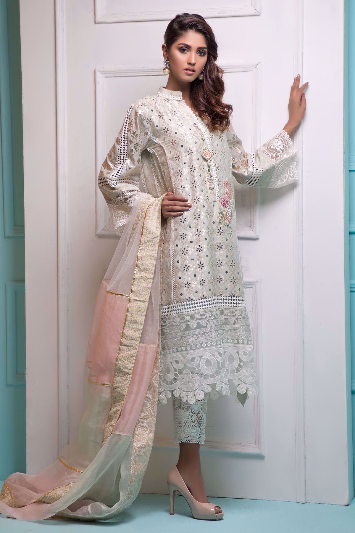 Stunning A-Line silk net shirt featuring kaamdani details. The neckline of the shirt is adorned with hand embroidered details featuring pearls, dabka and mirror work. The hemline of the shirt has embroidered organza border. The shirt is paired with straight raw silk pants featuring pleats, laces and organza details. Stunning color blocked net and organza dupatta with gota details incorporated with hand block printed border completes the look.