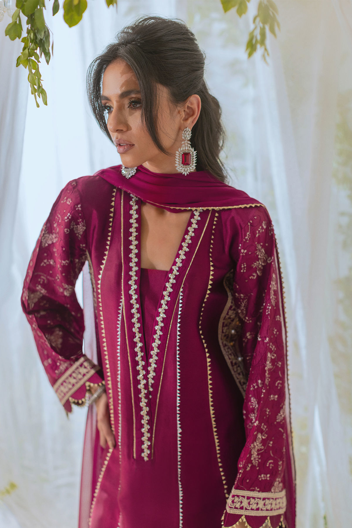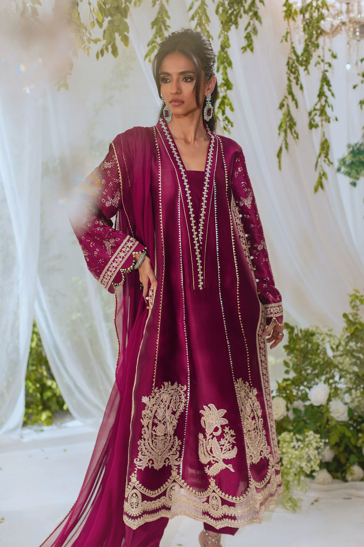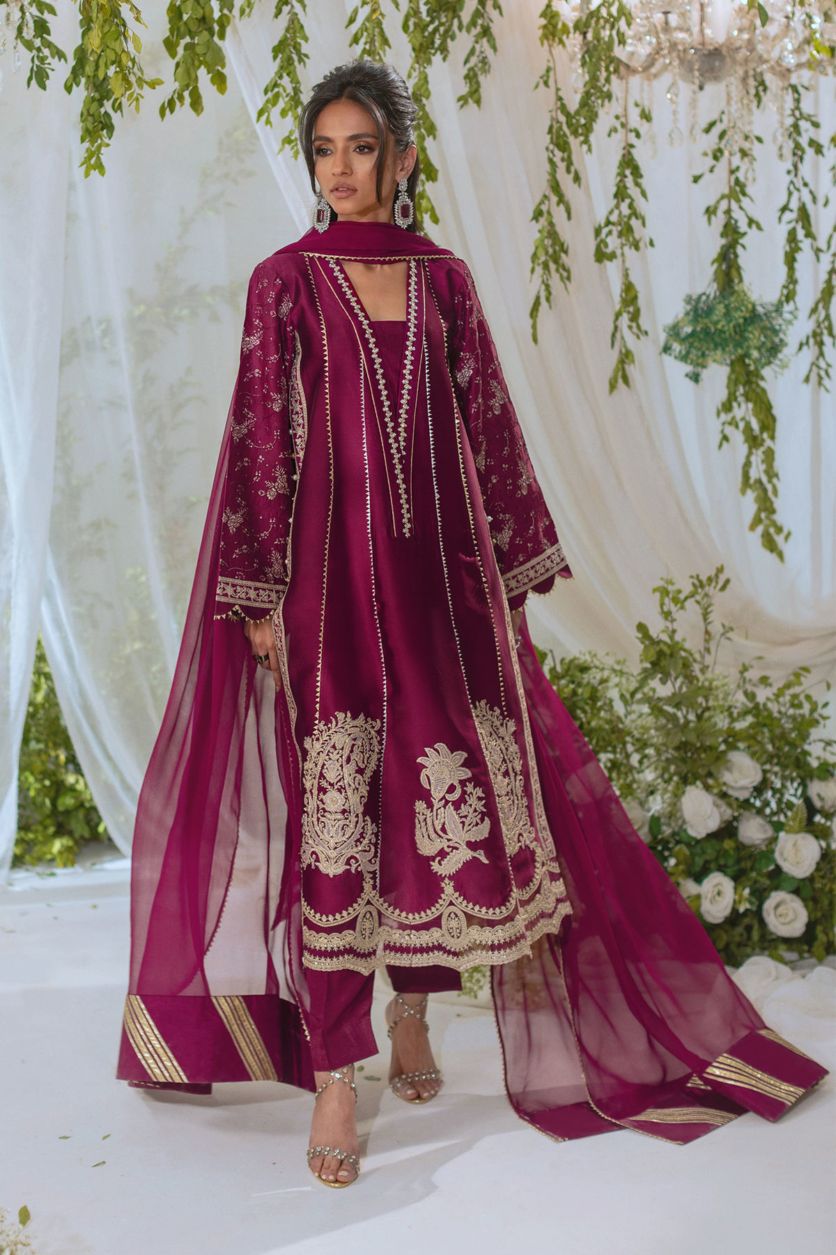 A cranberry A-line shirt made of shisha silk with a handcrafted overlapping neckline embellished with pearls and crystals. The hem is decorated with zari appliqué details. Paired with straight pants and a chiffon dupatta for a stunning festive look.
