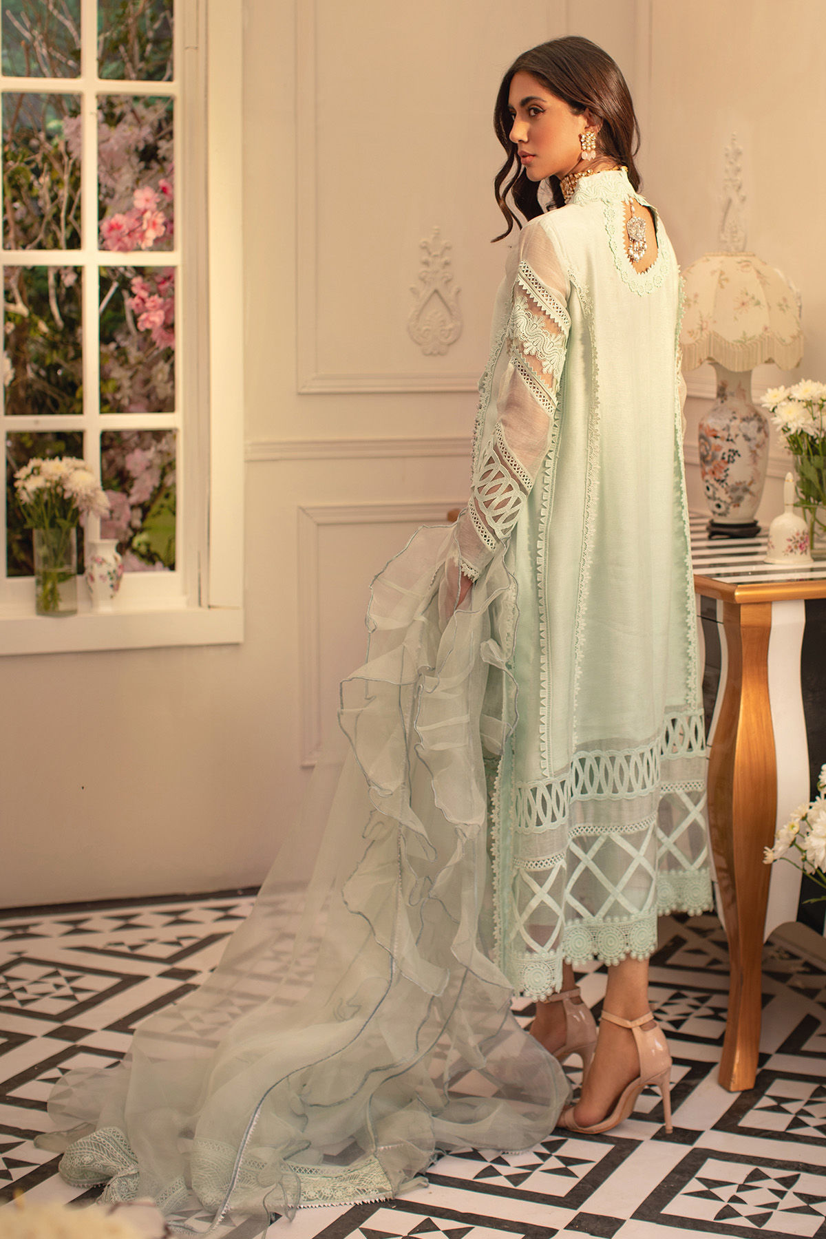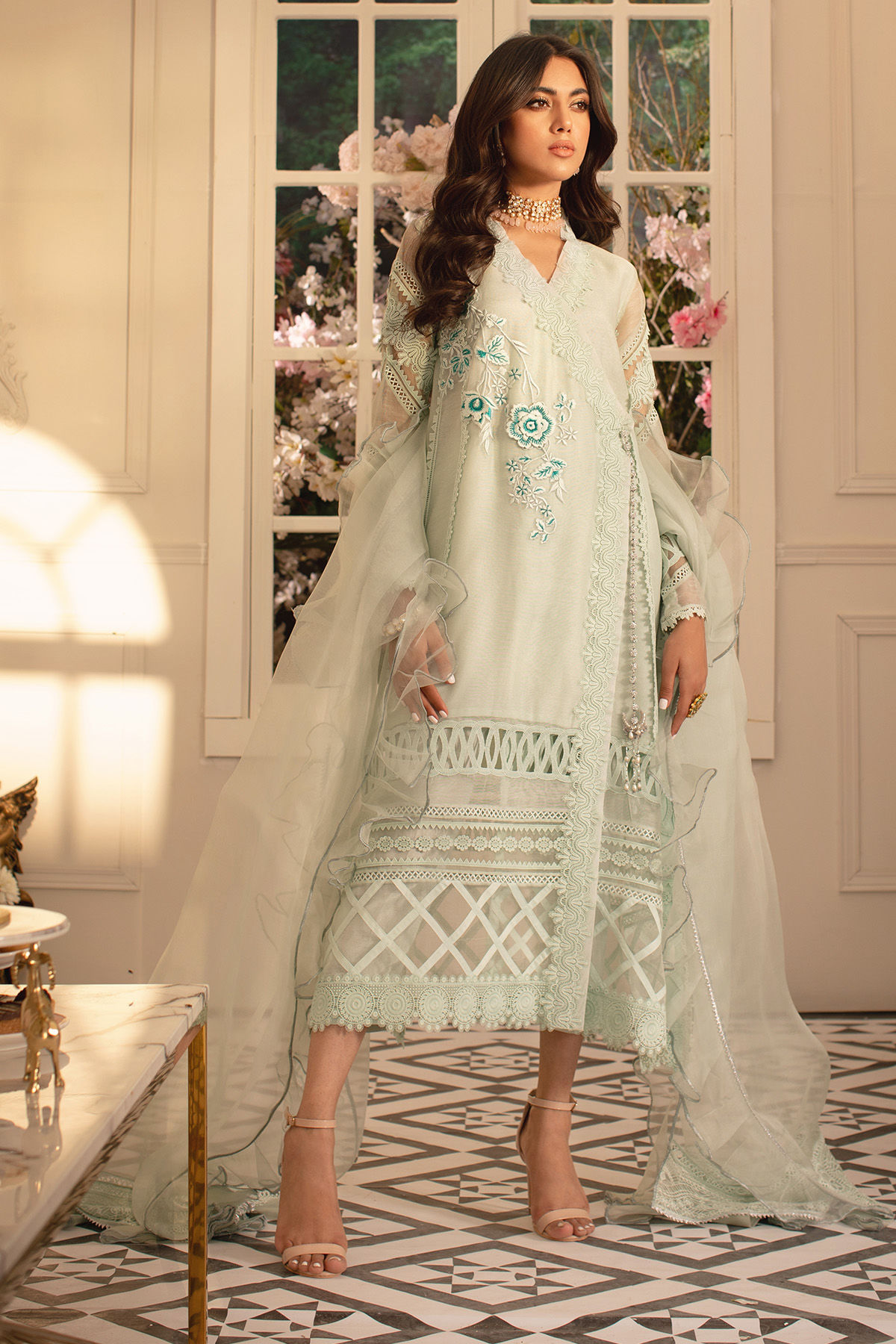 Long silhouette Angharka in light Turquoise shade on pure silk net canvas featuring lace and fabric manipulation details. The neckline is set with gorgeous floral blooms and is delicately placed with handcrafted tassel. The shirt is paired with straight raw silk pants and organza ruffled dupatta featuring handcrafted organza tassels on each pallu.