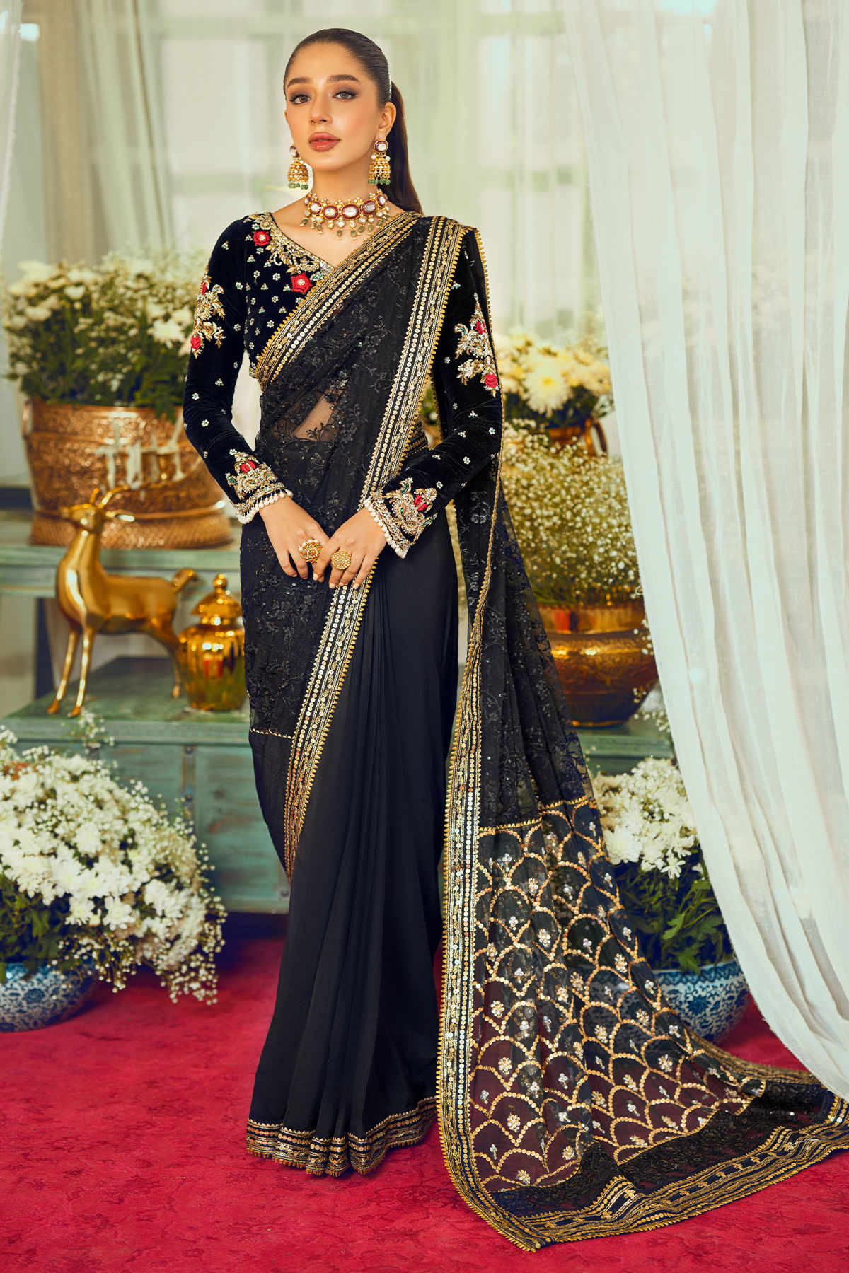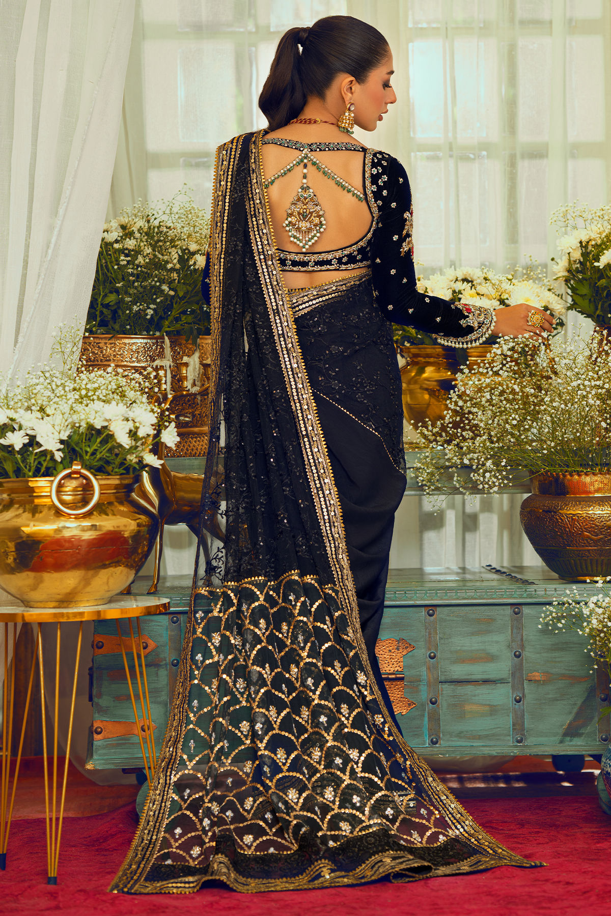 Black velvet blouse featuring antique and gold embroidery details enhanced with red resham rosettes, the sleeves of the blouse are enhanced with dangling pearls, the back of the sari is adorned with handcrafted tassels, the net embroidered sari is enhanced with light catching crystals finished with sequins. The pallu of the sari is enhanced with sequins and zardozi motifs.