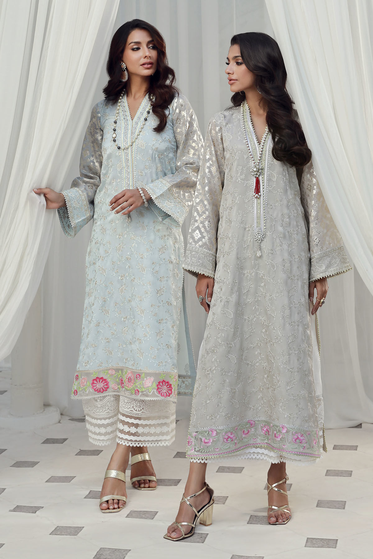 Long silhouette shirt on mirror silk canvas featuring self floral embroidered details with a hint of gold zari on centre front. The hemline of the shirt is enhanced with floral embroidered details. The neckline is enhanced with gota and handcrafted embellishments. The shirt can be paired with Reya Azaar featuring embroidered organza and lace details.