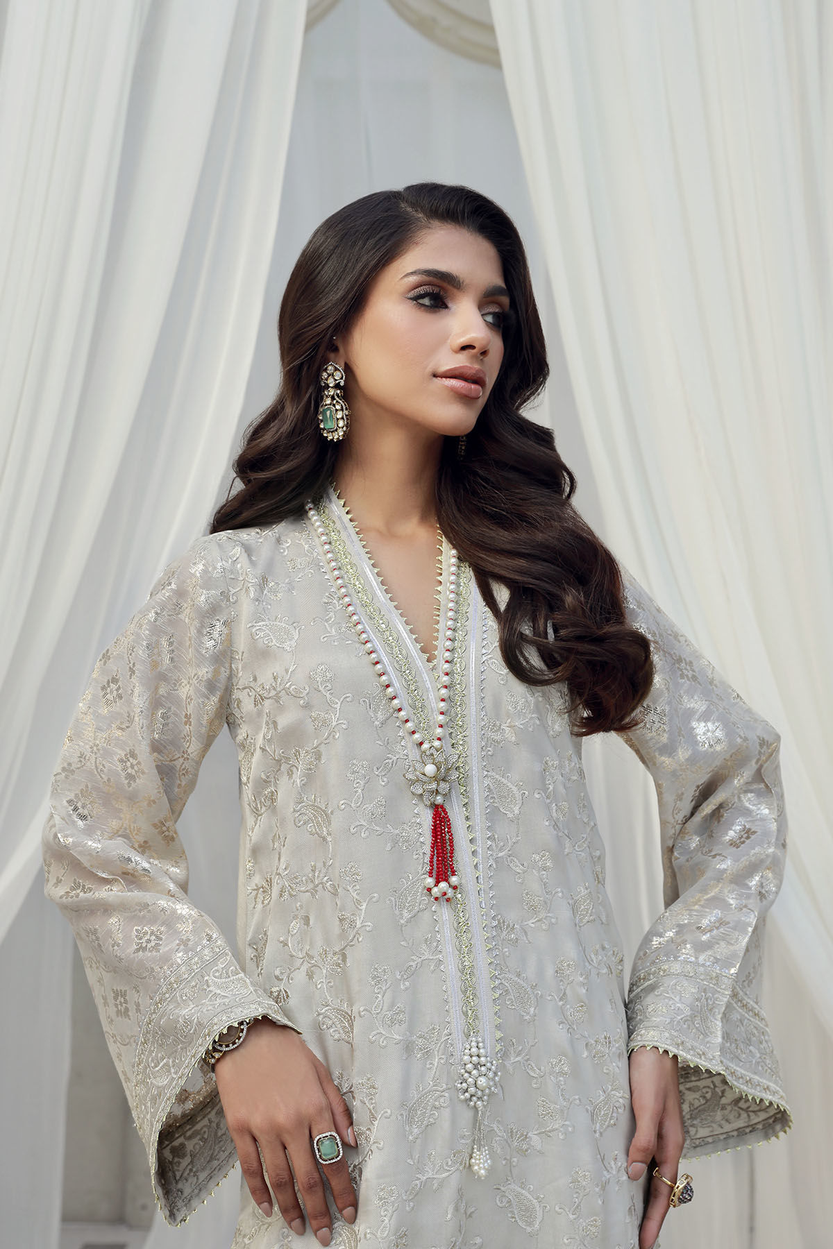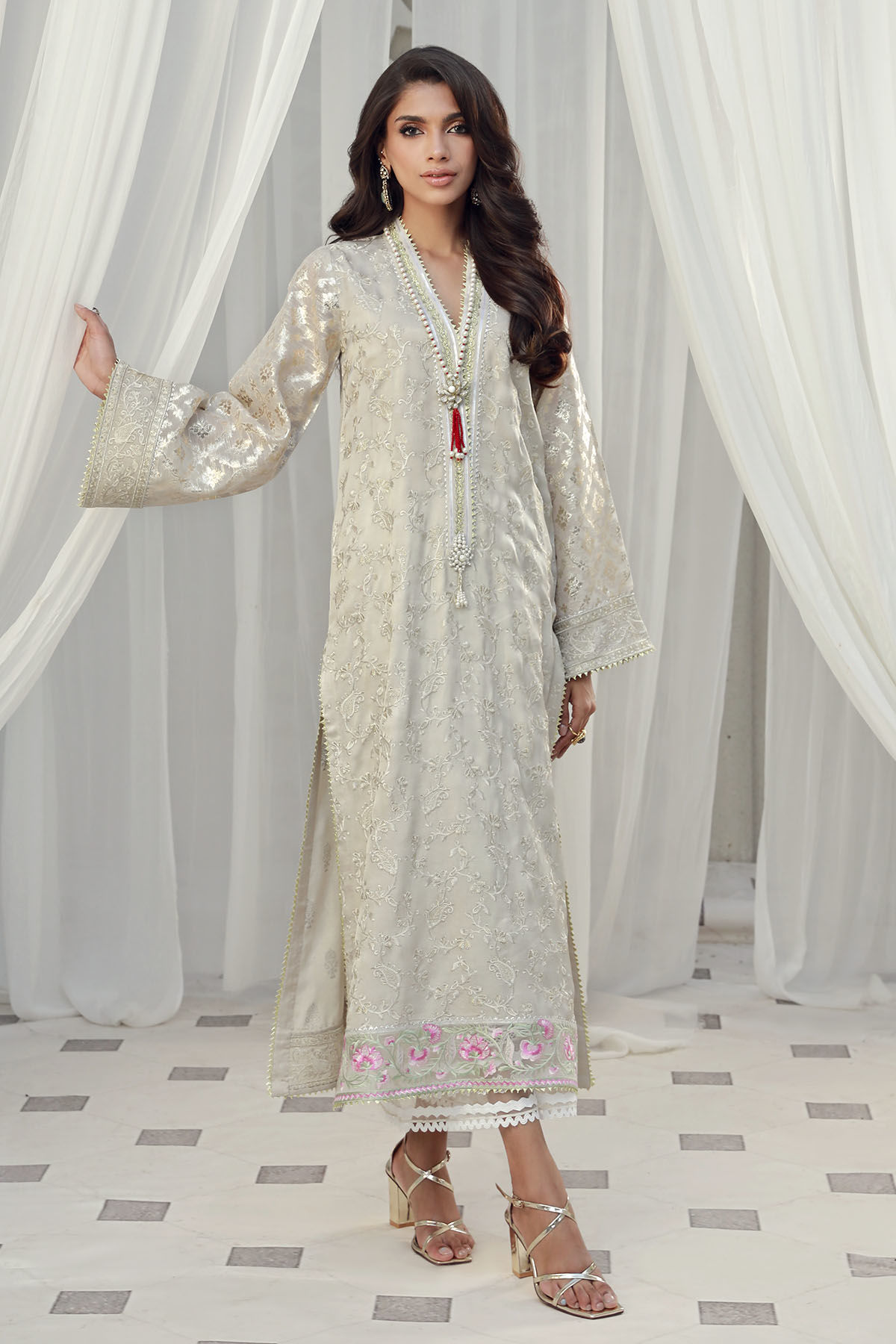 Long silhouette shirt on mirror silk canvas featuring self floral embroidered details with a hint of gold zari on centre front. The hemline of the shirt is enhanced with floral embroidered details. The neckline is enhanced with gota and handcrafted embellishments.