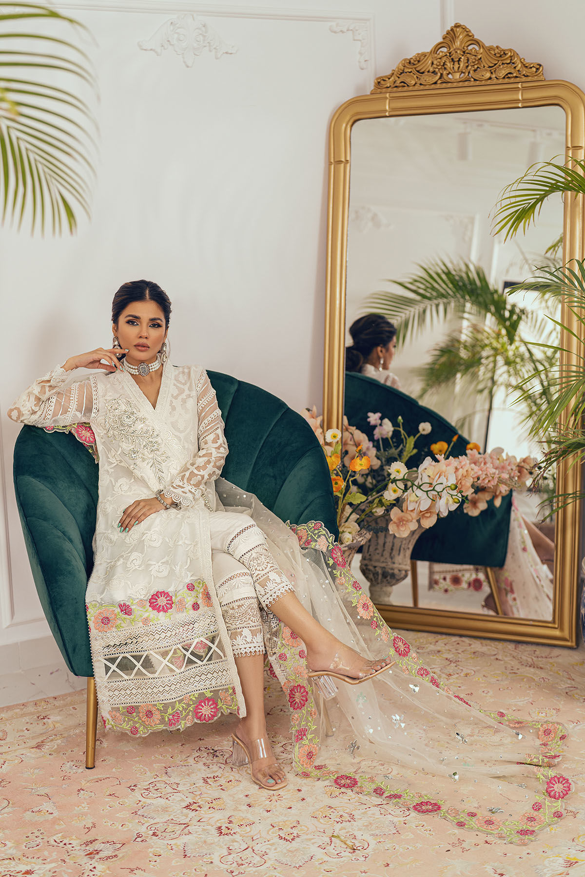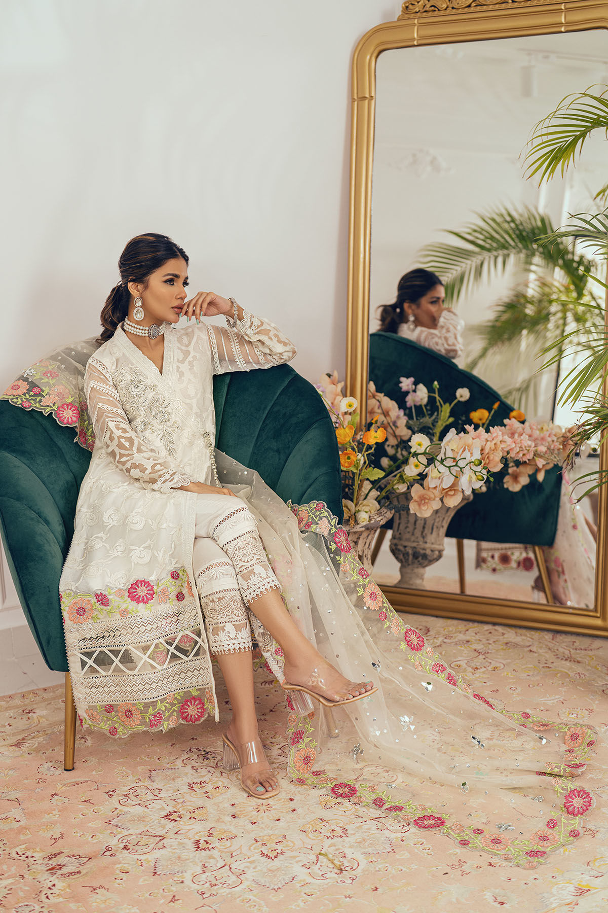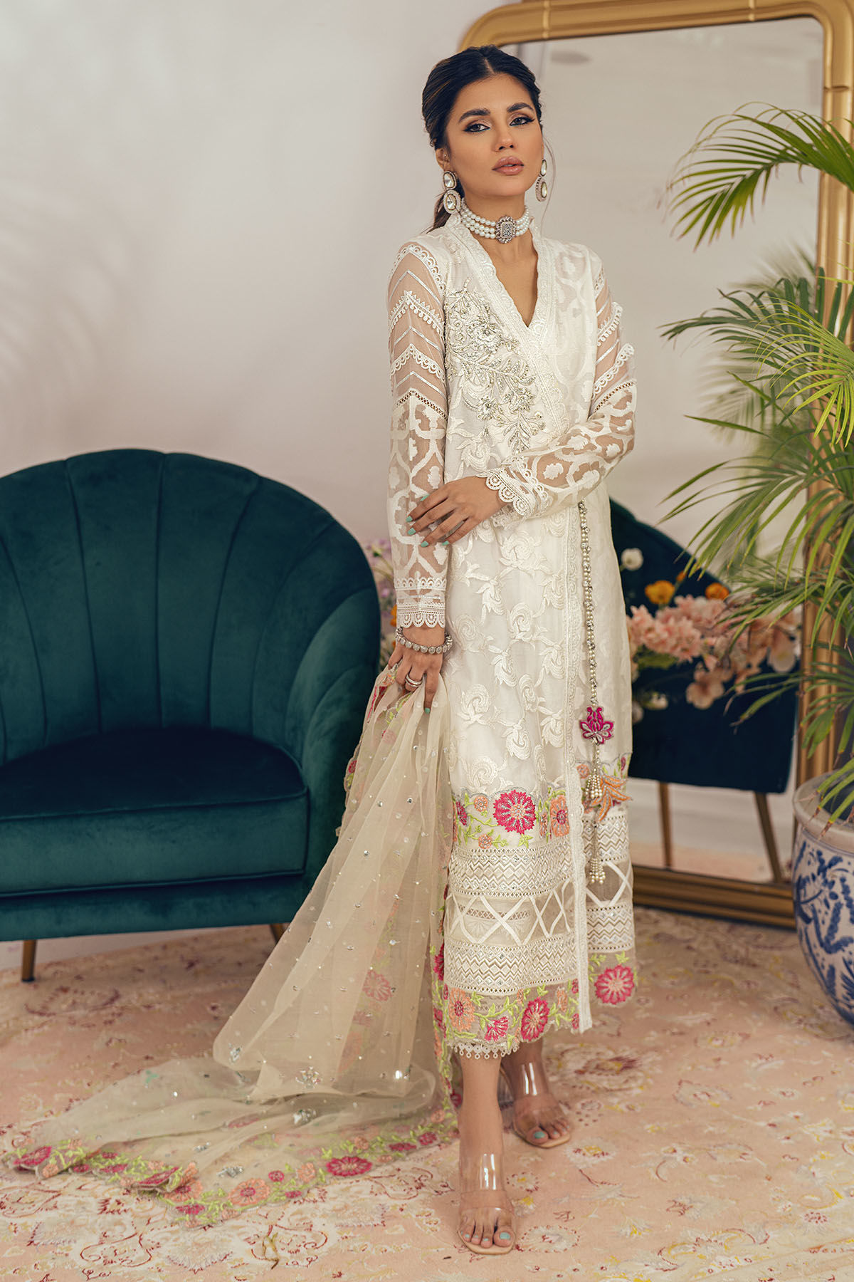 A-Line silhouette long angharka in opulent white embroidered net along with embossed organza panels. The centre front is adorned with self-embroidered details with zardozi embroidery and handcrafted tassels in contrasting resham. The angharka can be paired with Anmol raw silk pants and organza dupatta featuring multicolored floral embroidery with mirror, sequins and pearls details.