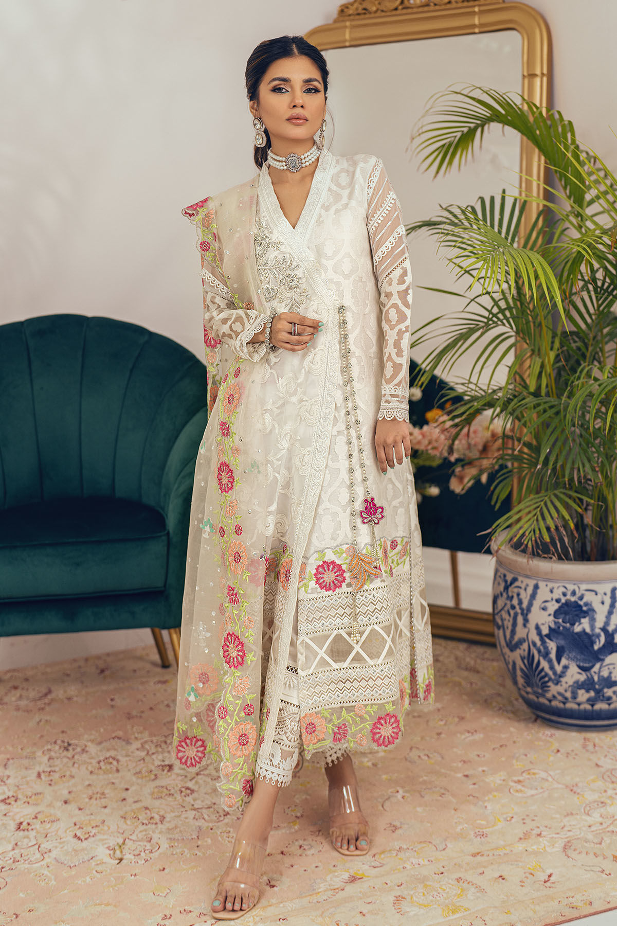 A-Line silhouette long angharka in opulent white embroidered net along with embossed organza panels. The centre front is adorned with self-embroidered details with zardozi embroidery and handcrafted tassels in contrasting resham. The