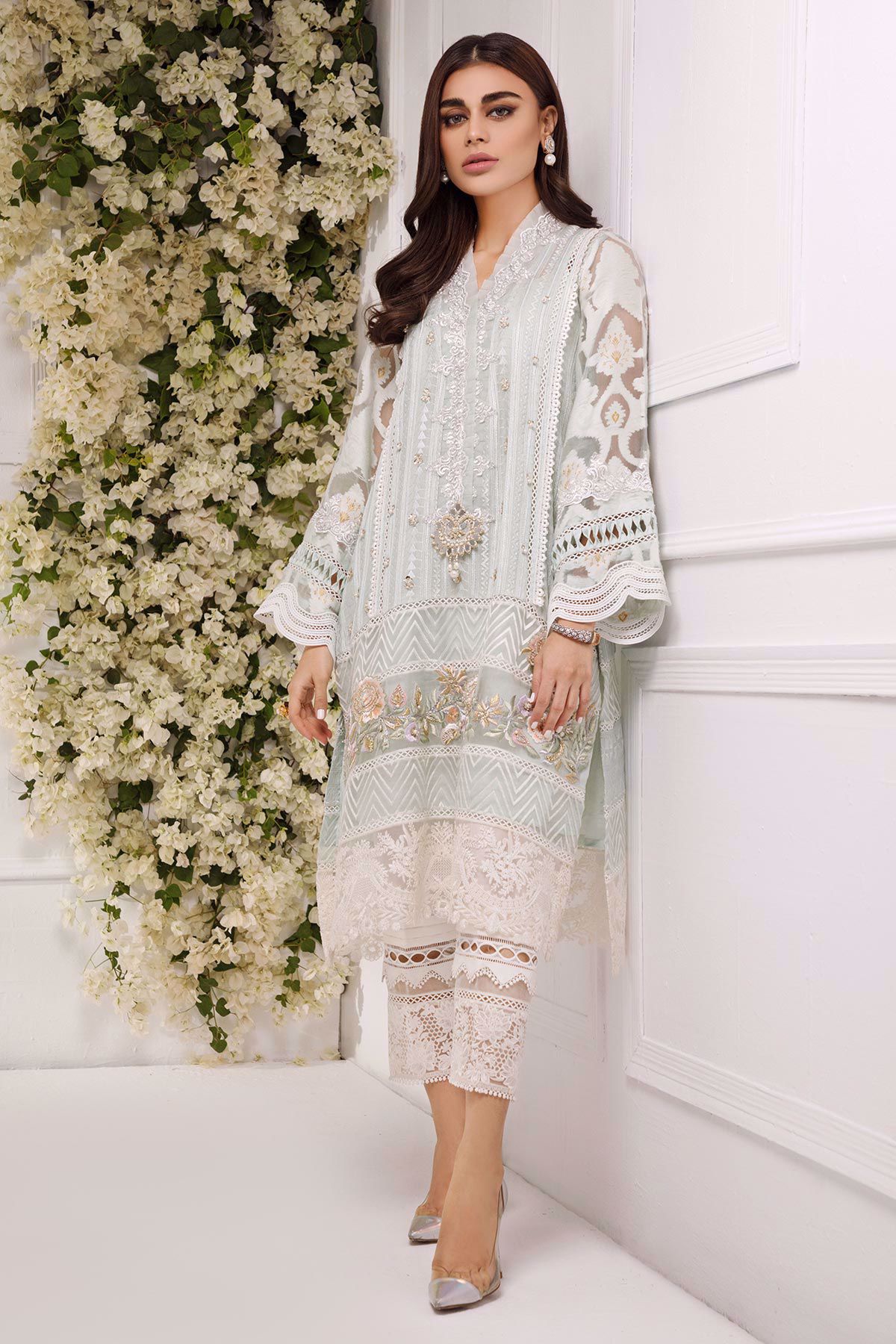 A-line flared silhouette shirt on embroidered silk net featuring silk thread embroidered hemline incorporated with light catching crystals and pearls. The neckline of the shirt has ruffles details which is further enhanced with zari lace and handcrafted mirror embellished motif which is adorned with dabka, kora and dangling pearls. The shirt comes with attached lining. The shirt is paired with straight raw silk pants featuring embroidered organza hemline incorporated with pleats and laces. Embroidered organza dupatta with pearls, sequins and mirror work incorporated with lace and organza borders completes the look.