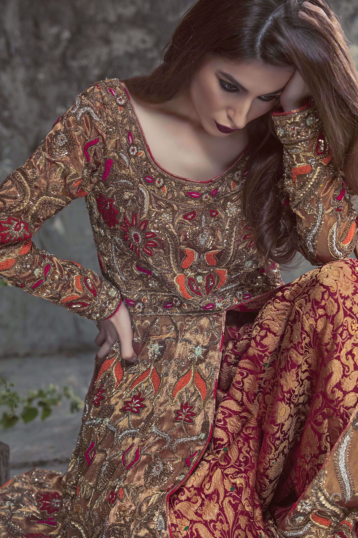 This head turning bridal piece is made on deep maroon Lame silk with deep maroon velvet applique on hem with heavy zardoze embroidery which is further enhanced with silk thread knots. The panels have heavy dhaka and naqshi embroidery incorporated with sequins and resham knots. The back of the shirt is enhanced with delicate hand made tassel. The outfit has heavy duppatta that comes with zardoze embroidered border and sequins spray on overall dupatta. Deep maroon jamawar dhaka completes the look.