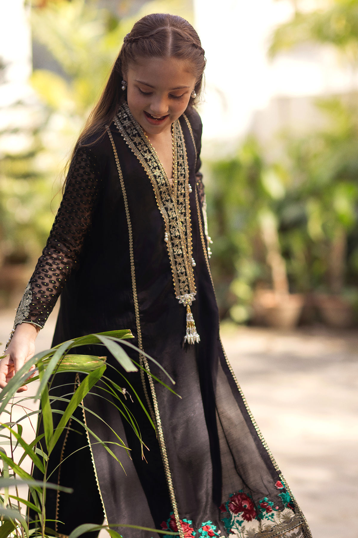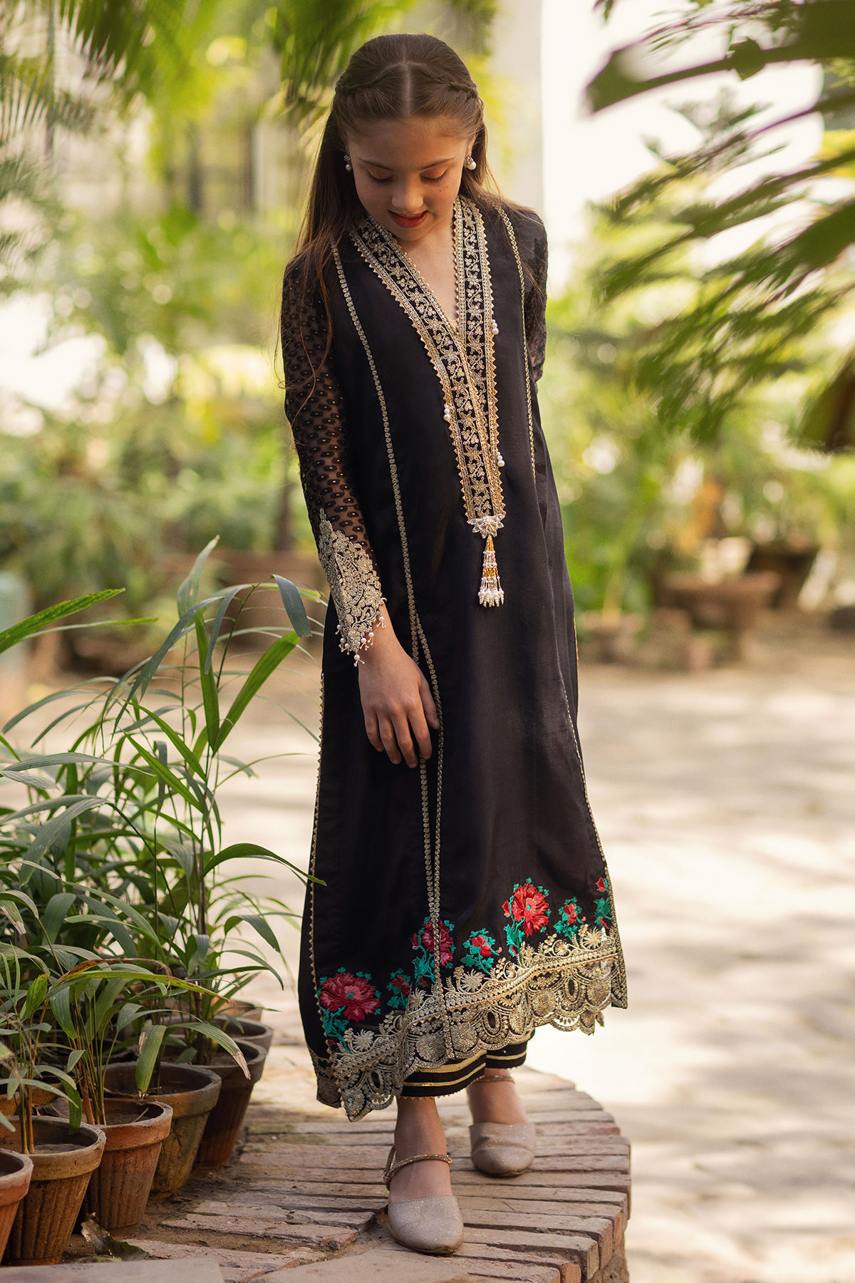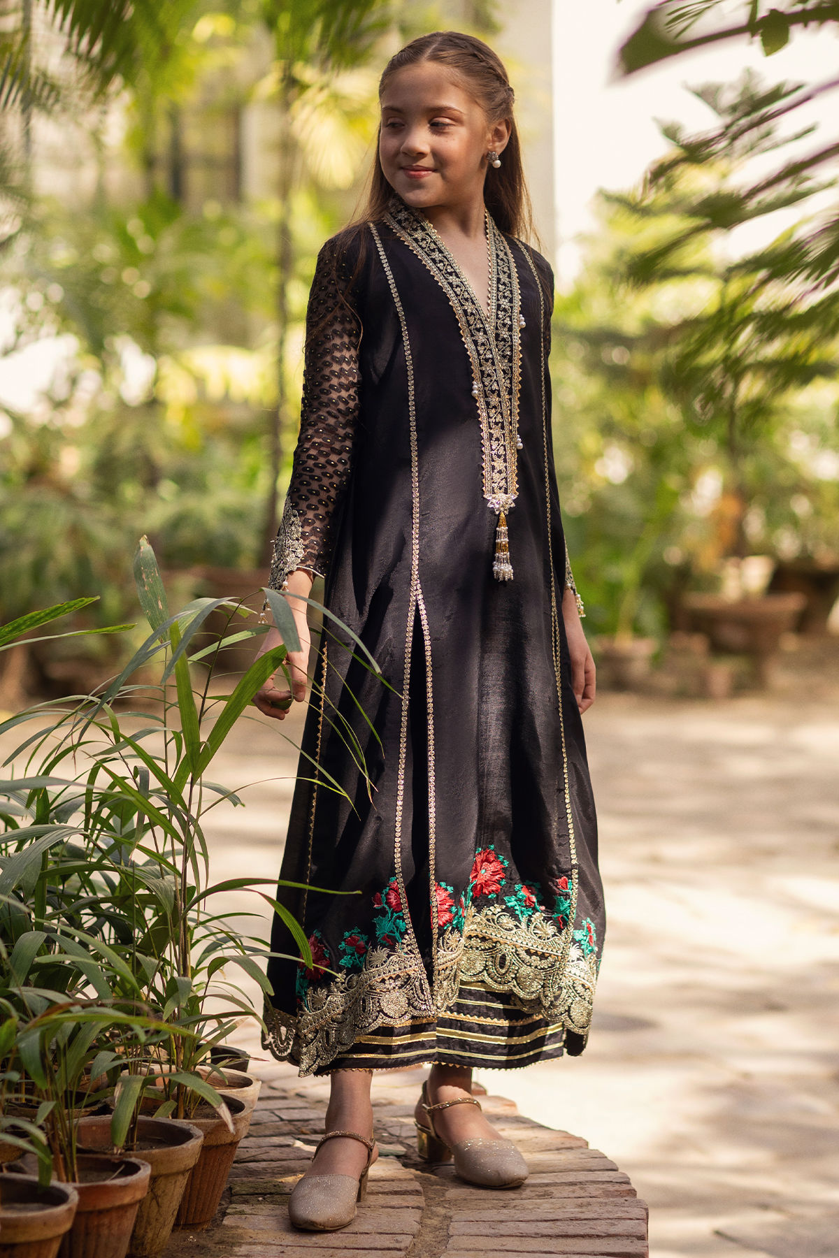 A long-silhouette shirt crafted in classic black silk, elegantly detailed with delicate pearl embellishments along the neckline for a subtle, refined shimmer. The sleeves are fashioned in lustrous Lurex and adorned with intricate pearl accents, adding a contemporary touch. The hem is finished with rich gold zari work and embroidered borders, enhancing the silhouette with artisanal depth. The ensemble is paired with a silk azaar featuring refined gota detailing and is completed with a chiffon dupatta, adorned with graceful hand block–printed details for a polished, sophisticated finish.