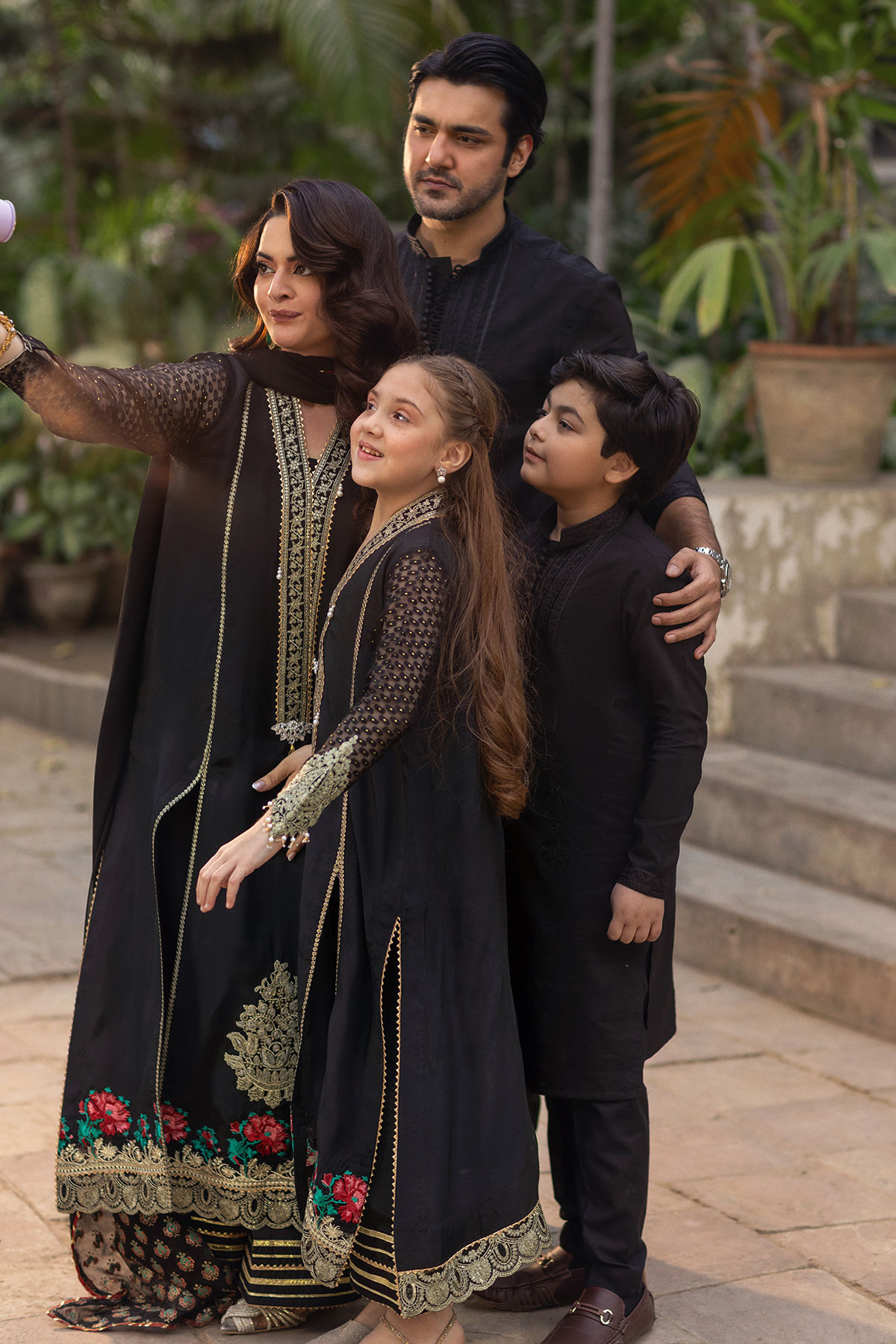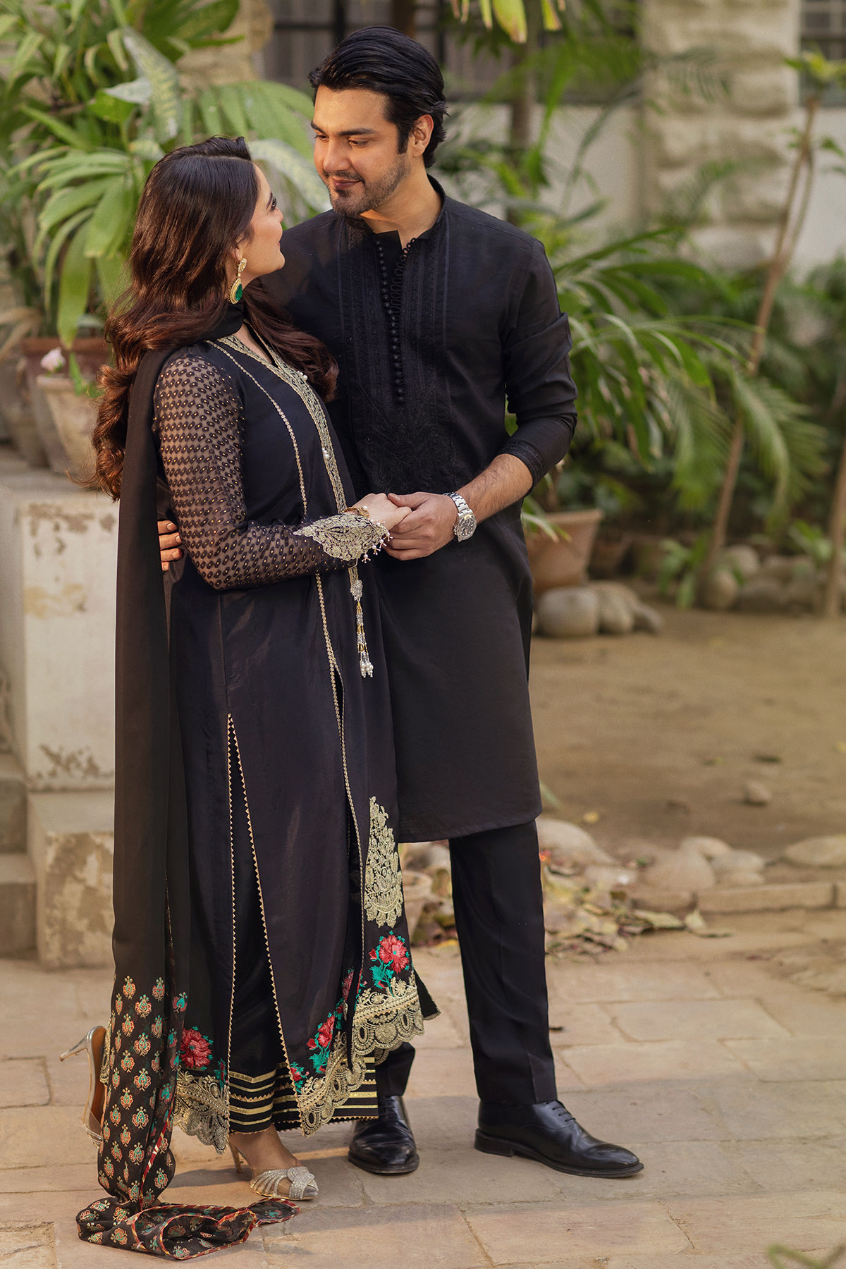 A long-silhouette shirt crafted in classic black silk, elegantly detailed with delicate pearl embellishments along the neckline for a subtle, refined shimmer. The sleeves are fashioned in lustrous Lurex and adorned with intricate pearl accents, adding a contemporary touch. The hem is finished with rich gold zari work and embroidered borders, enhancing the silhouette with artisanal depth. The ensemble is paired with a silk azaar featuring refined gota detailing and is completed with a chiffon dupatta, adorned with graceful hand block–printed details for a polished, sophisticated finish.