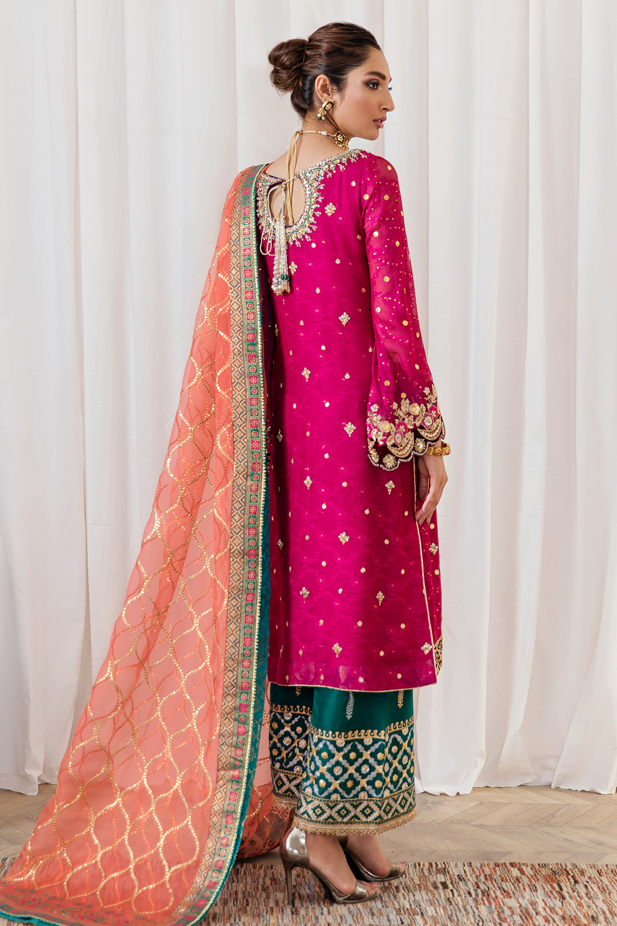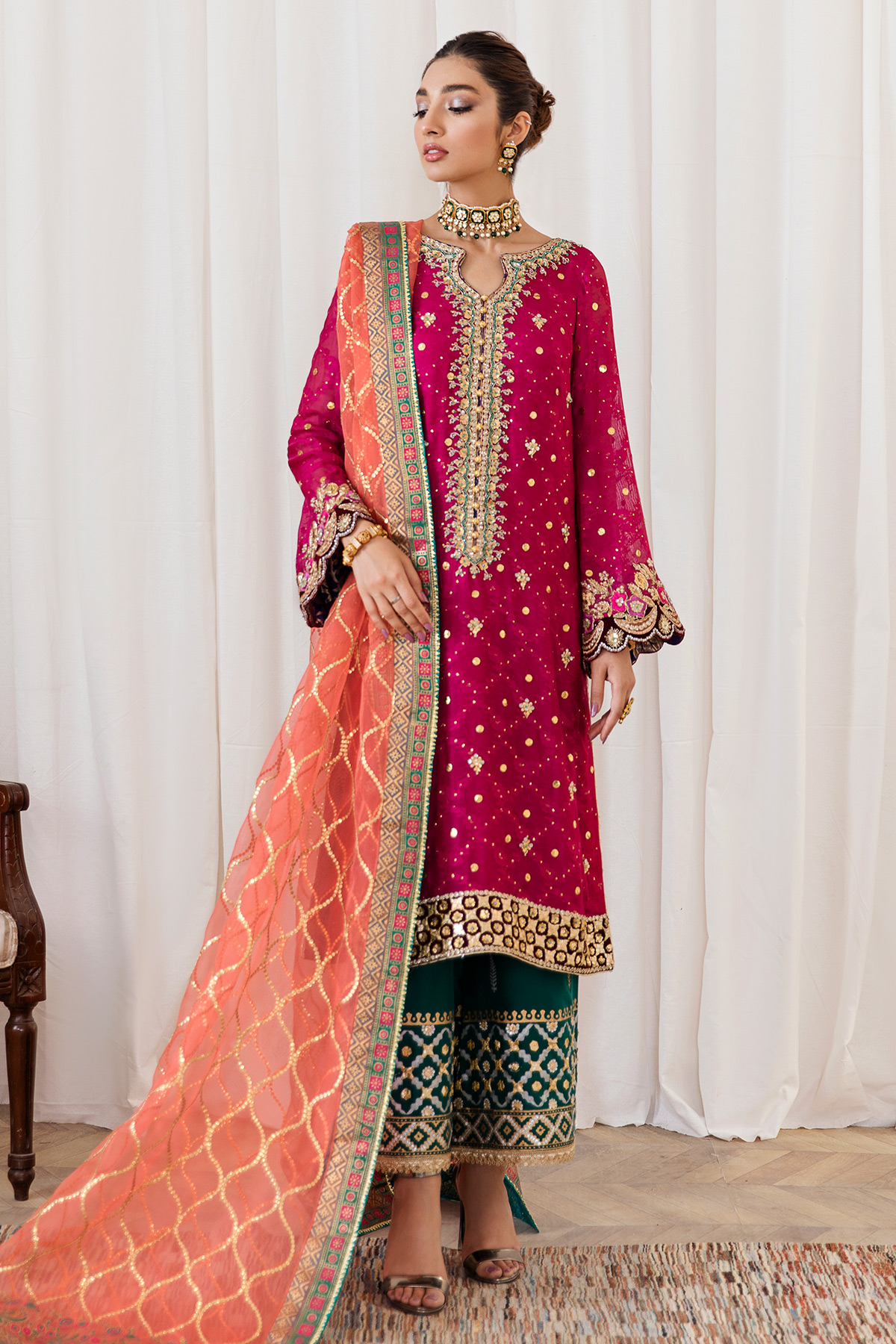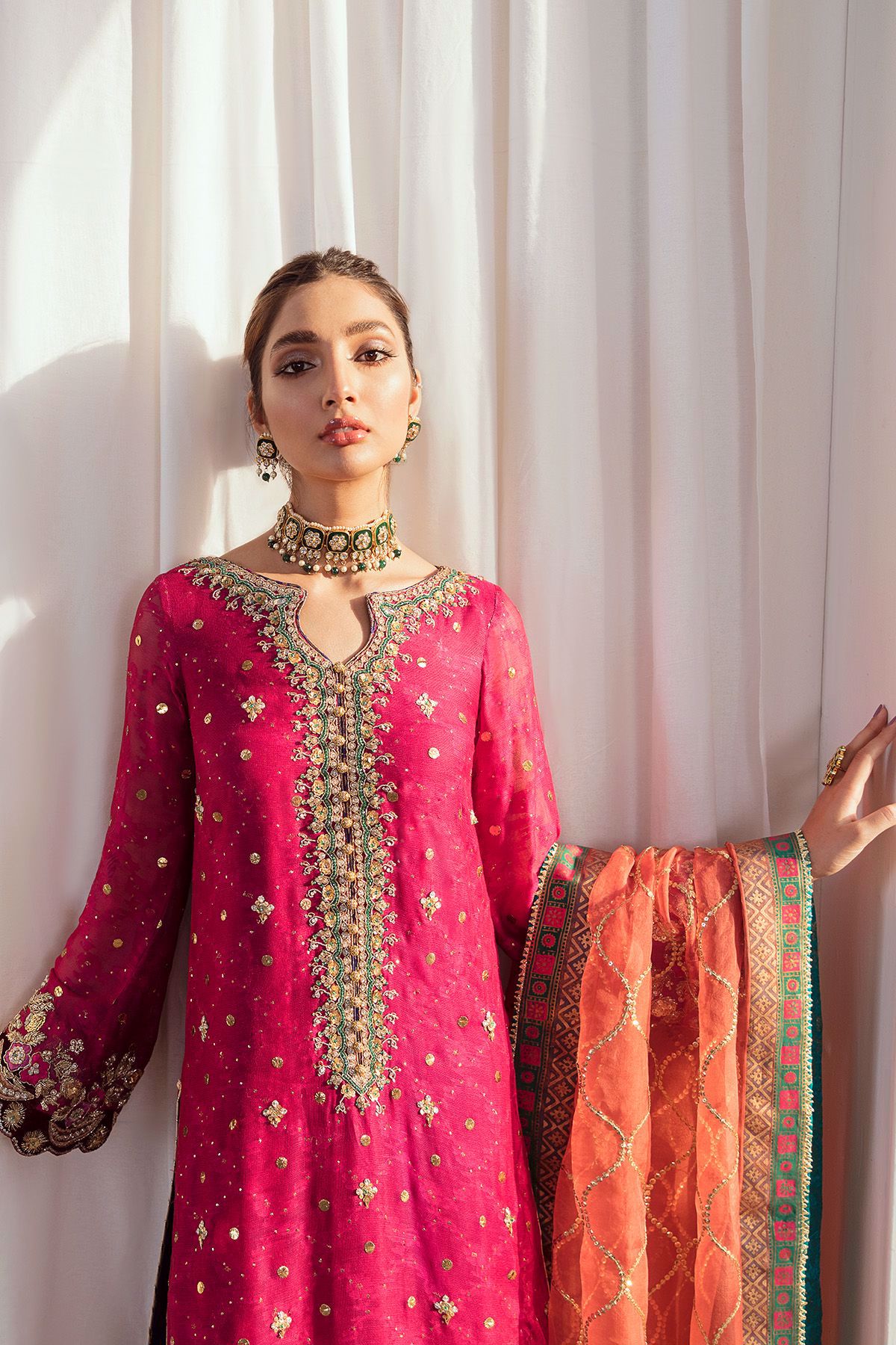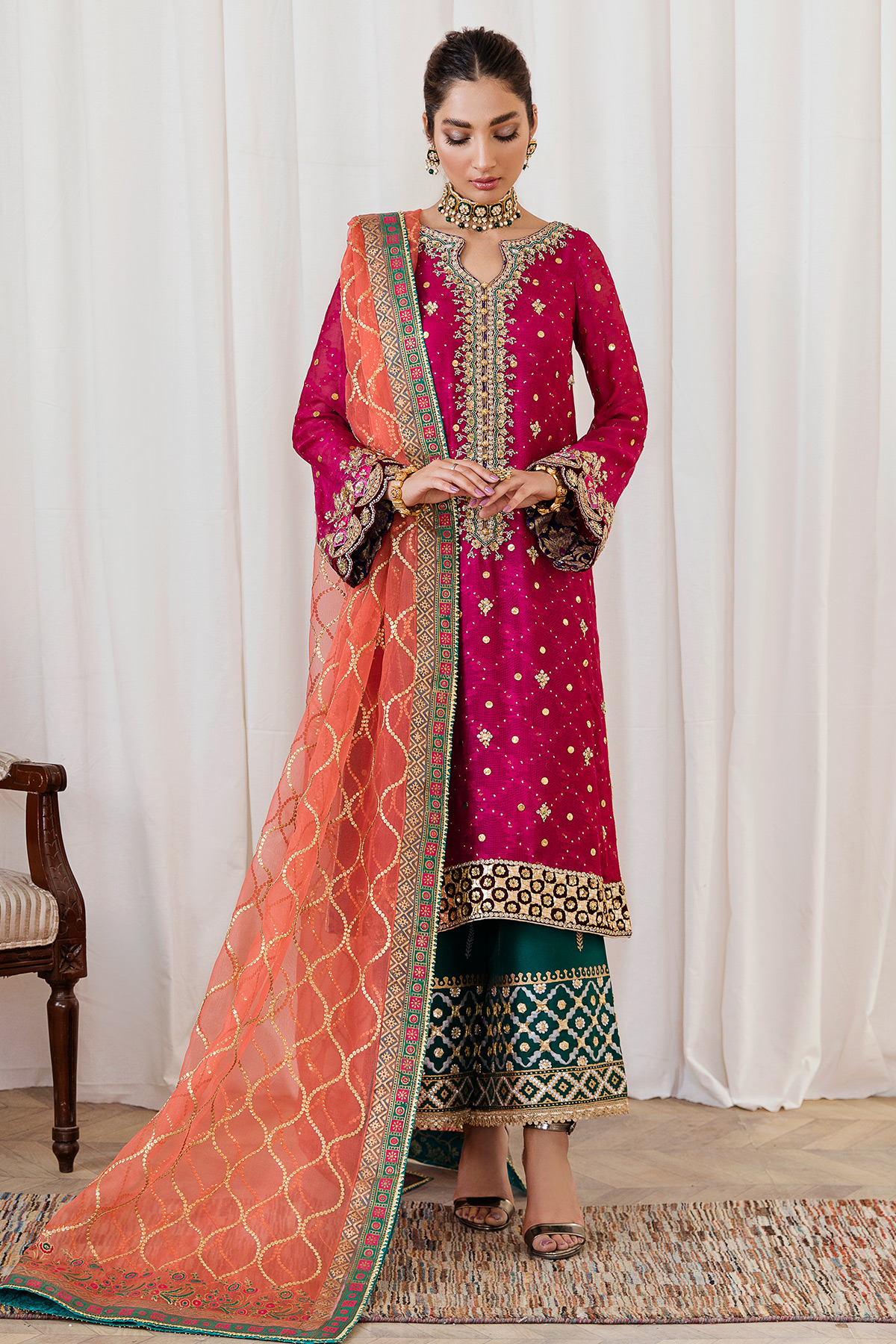 Also recommended to add burnt orange dupatta featuring block printed borders and heavy sequins patterns.