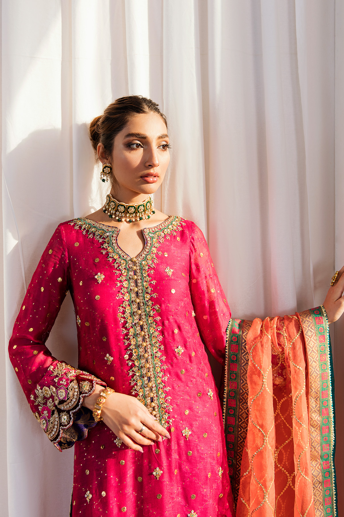 Straight silhouette long shirt in deep pink featuring intricate zardozi details on neckline daman and sleeves, the sleeves are enhanced with silk thread embroidered details which are further adorned with zardozi embroidery. The shirt has gorgeous kaamdani details on front and sleeves and can be paired with pure raw silk izaar in striking lush green featuring block printed hem with zardozi and gota details.