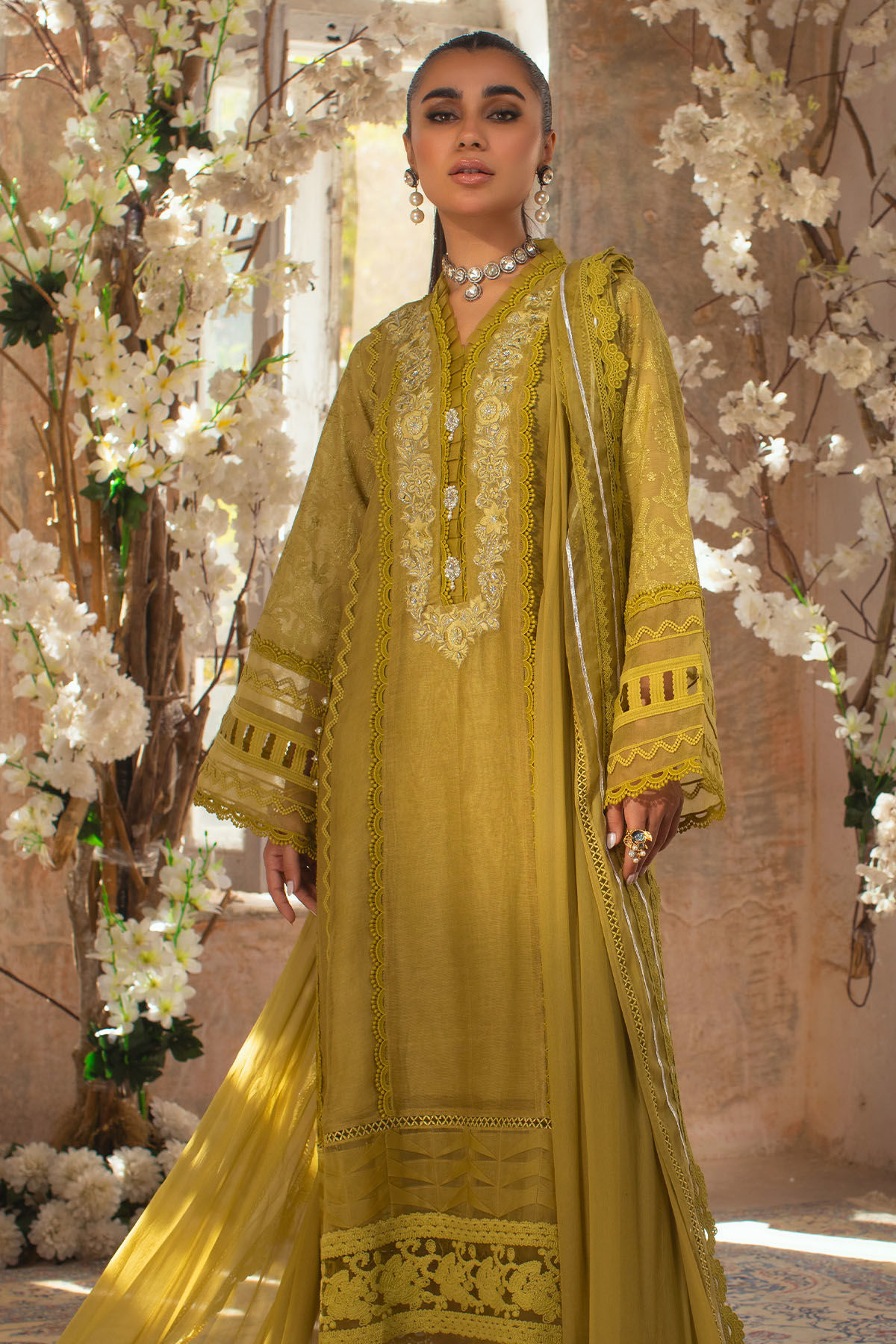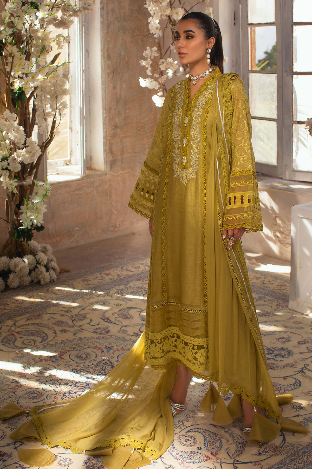 Long silhouette silk net shirt in gorgeous shade of Dhani green featuring silk thread and silver zari embroidered details on neckline. The neckline is further adorned with lace and organza ruffles. The hemline is enhanced with fabric manipulated organza panel along with Chantilly lace on hem. The chikankari sleeves are set to perfection with lace details. The outfit can be paired with a matching Chiffon dupatta. The shirt is paired with raw silk izaar featuring lace details on organza panel with pleats.