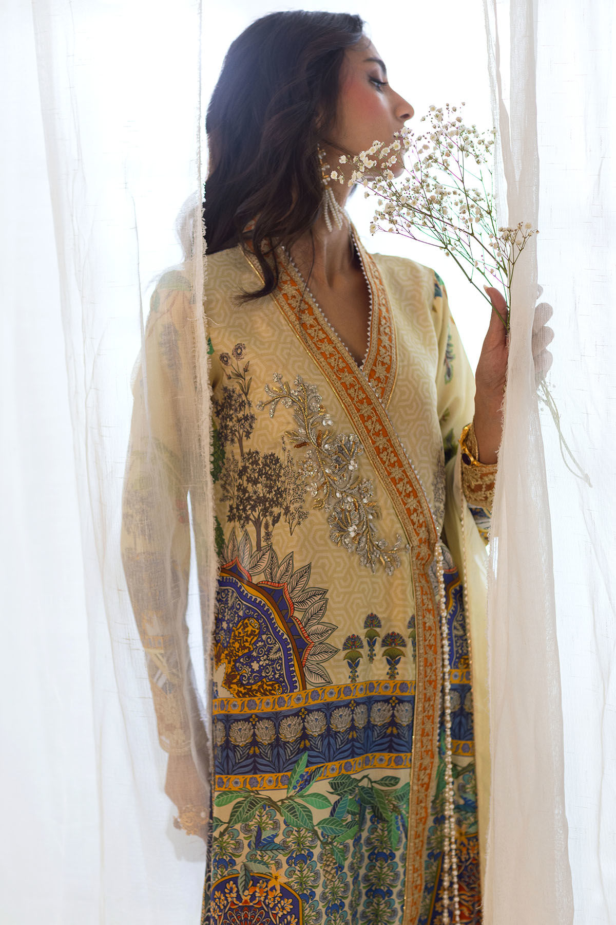 The Angharka is presented in a long silhouette crafted from pure raw silk canvas, showcasing an eye-catching and distinctive AA signature print adorned with intricate zardozi details at the center front. The front of the Angharka is enhanced by a handcrafted dangling tassel. The hem is further accentuated with zari embroidered organza and meticulous gota manipulation. This ensemble is complemented by an ombre silk dupatta, which features hand block printed details, as well as matching raw silk pants.