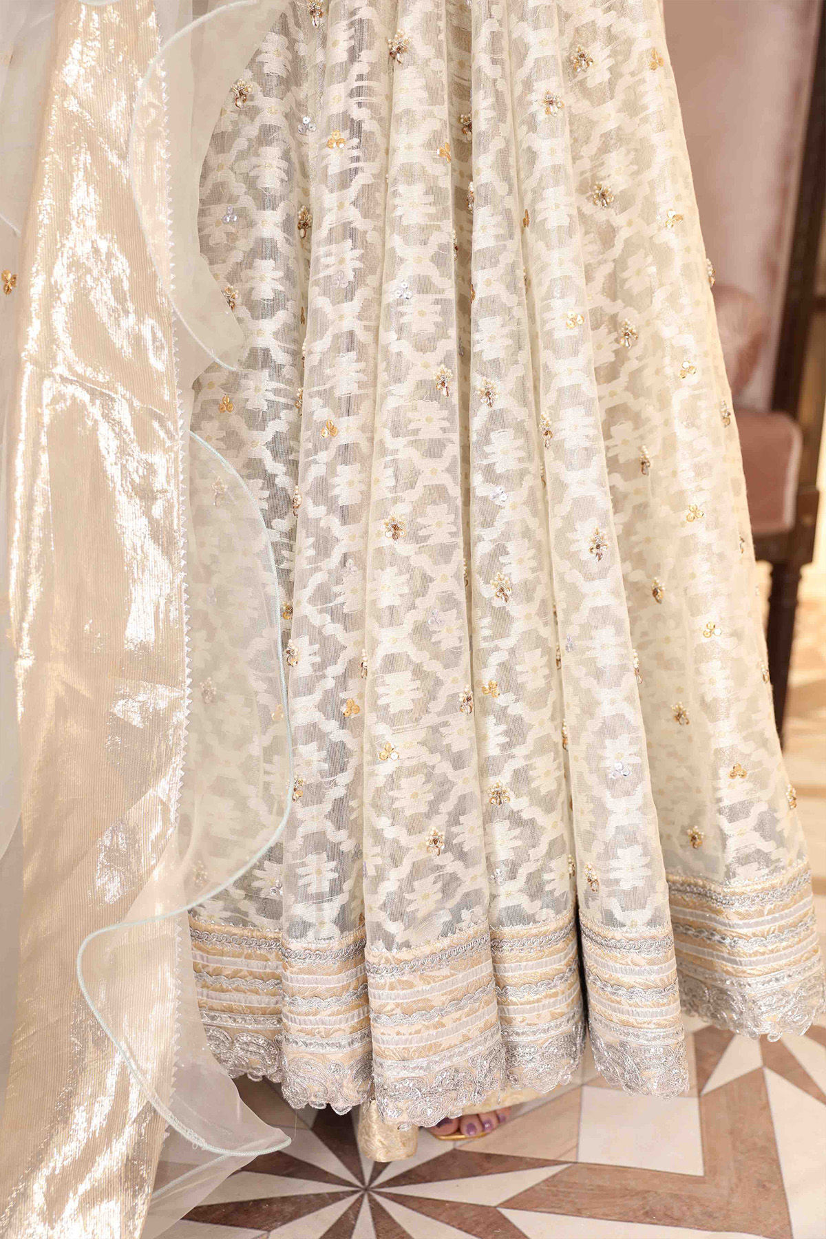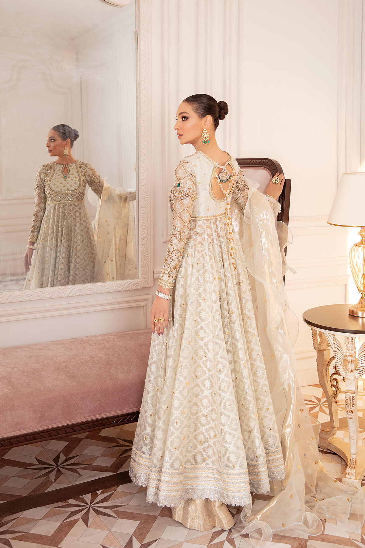 Flared silhouette pishwas in subtle silver shade on silk zari net canvas featuring zardozi details on bodice, the flared panels are enhanced with zardozi botis and the hem is adorned with gota and lace details. The back of the pishwas is made to perfection with signature AA handcrafted embellishments and dangling long tassels. The pishwas can be paired with ruffled organza dupatta with sequins.