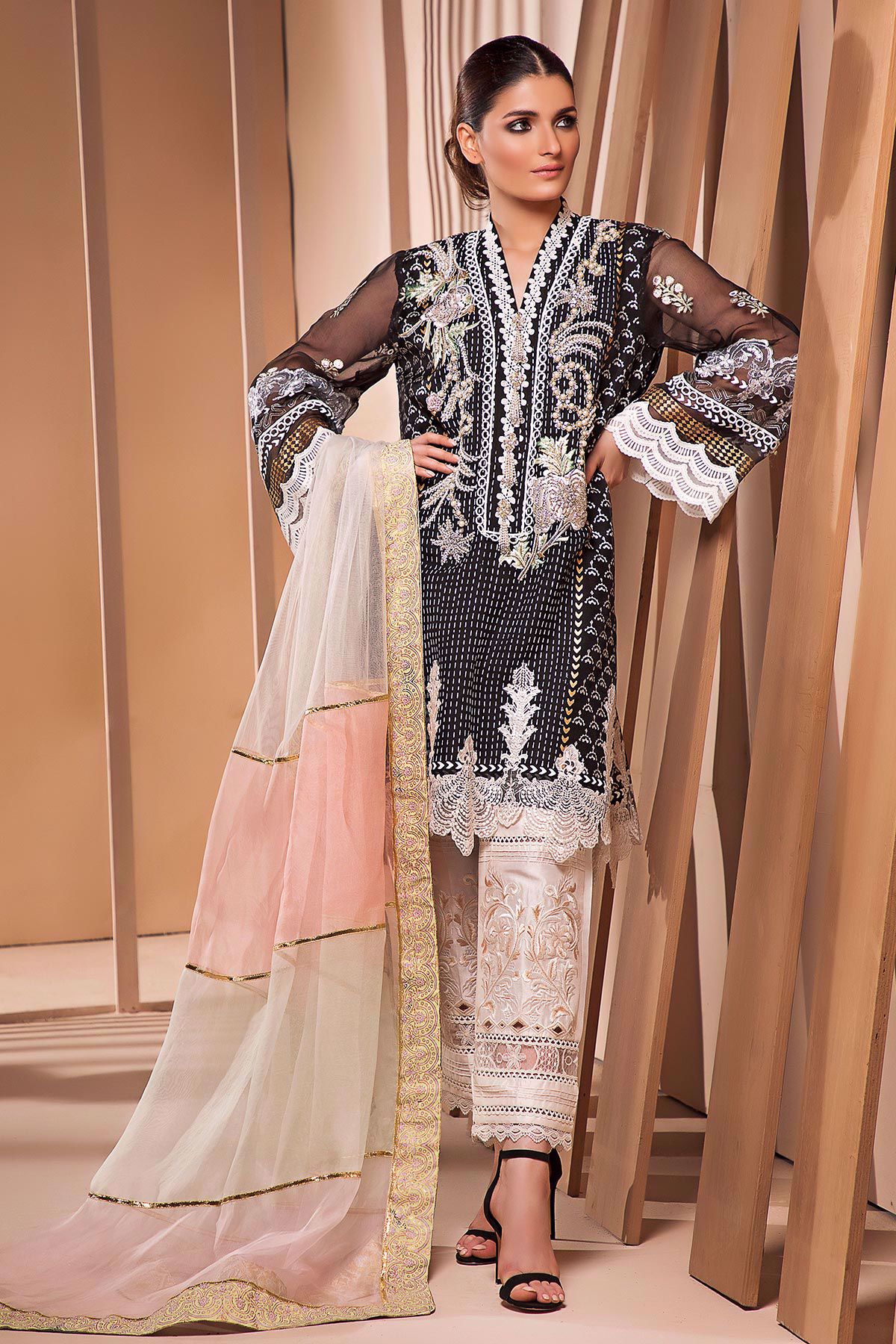 Stunning hand block printed geometrical details on black canvas of organza which are further adorned with silk thread rosettes. The silk thread rosettes are further enhanced with light catching crystals, pearls and dabka. The hemline of the shirt is appliquéd to detail with art-deco inspired pattern which is embedded with light catching sequins. The sleeves of the shirt has little floral motifs all over which are finished with different laces. The neckline is further enhanced with crystals and handcrafted dangling tassels. Hand block printed signature Annus Abrar dupatta with gota and lace trimmings makes this outfit even gorgeous.